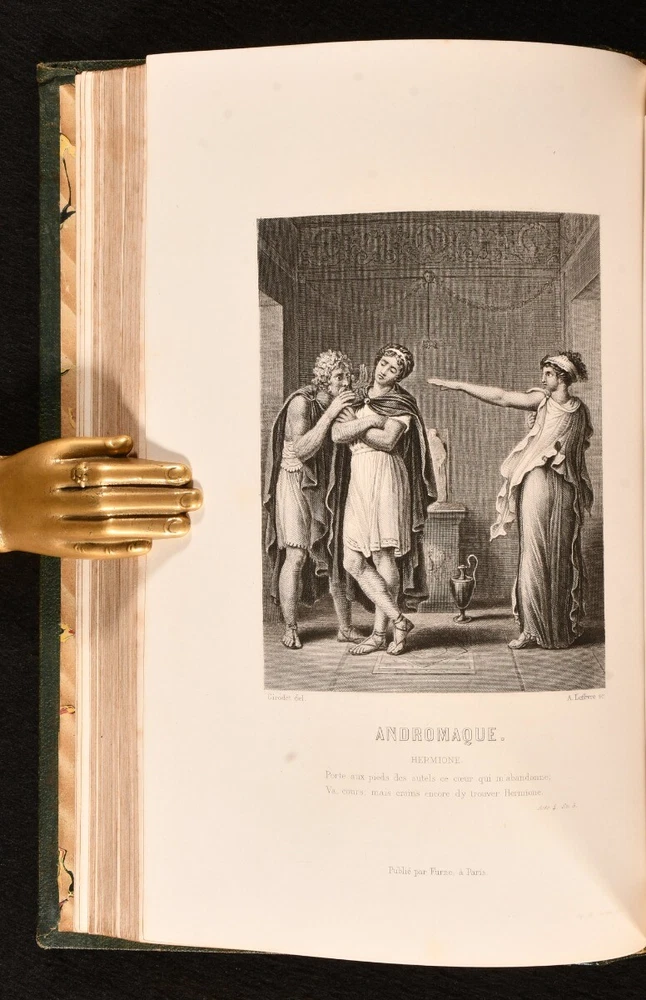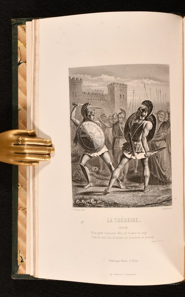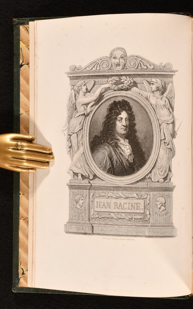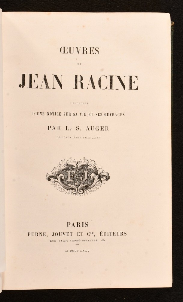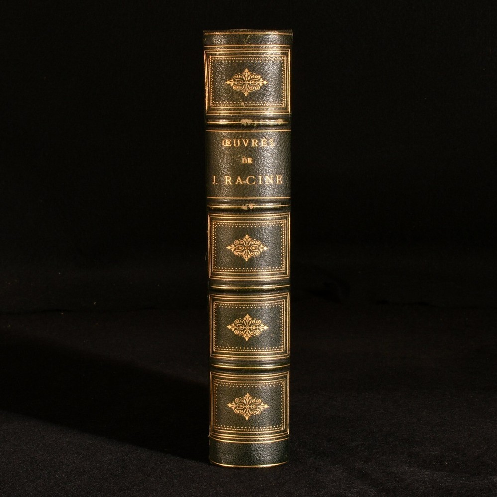 Click here to see our other books! Oeuvres de Jean Racine Jean Racine; L. S. Auger 1875 Furne, Jouvet et Cie. : Paris 9" by 6" [4], xii, 719, [1pp.] SUMMARY A scarce copy of this compilation of the works of French dramatist Jean Racine, edited and introduced by L. S. Auger. First Edition,Illustrated,Leather Binding,Scarce Overall Condition: Very Good This book weighs 2 KG when packed UK Postage: £ 3.99 US Postage: £ 21.99 EU Postage : £ 29.99 European Postage: £ 23.99 Asia Postage: £ 37.99 Worldwide Postage: £ 38.99 DESCRIPTION Bound in a smart, quarter morocco with cloth to the boards. Written entirely in the original French. This scarce work is comprised of the works of 17th century French dramatist, Jean-Baptiste Racine, who was labelled as one of the three great French playwrights of his time. This collection includes Racine's plays 'La Thebaide', 'Britannicus' and 'Mithridate', among others. With twelve plays altogether, comprised of eleven "tragedies" and one "comedie". Edited by French journalist and literary critic, Louis Simon Auger, who provides a chapter on the life of Racine, as well as presenting his works. Illustrated with a plate to the start of each play, and a frontispiece to the work, with thirteen plates altogether. Collated, complete. CONDITION Bound in a smart, quarter morocco with cloth to the boards. Externally, very good, with light rubbing to the spine and the odd mark. Light bumping to the extremities. Internally, firmly bound. Pages bright and clean, with one or two spots to the first and last pages. Overall Condition: Very Good GLOSSARY OF TERMS Overall Condition (Dustwrapper condition rating is shown after that for the book itself, where a dustwrapper is present) Fine - Very well preserved copy showing very little wear Very Good Indeed - Only one or two minor faults, really a very attractive copy Very Good - Quite a wide term meaning no major faults but probably several smaller ones often expected given the age of the book, but still a respectable copy Good - Meaning not very good. Some more serious faults as will be described in the condition report under 'condition' Good Only - Meaning one or more faults that could really do with repair Fair - As with good only above but with other faults leaving a compromised copy even after repair Poor - Really bad and possibly seriously incomplete. We only sell books in this condition where their rarity or value makes them attractive none the less. Major defects will be described. GUARANTEE We offer a full money back guarantee on our descriptions. Please ask for details and conditions. We prefer PAYPAL. If you pay via PAYPAL we will post the item off the same or the next working day with the postage you have selected. Please note we cannot accept USD cheques