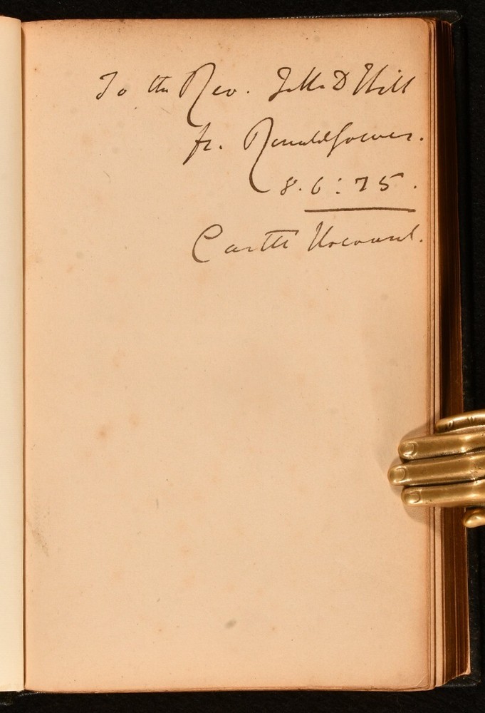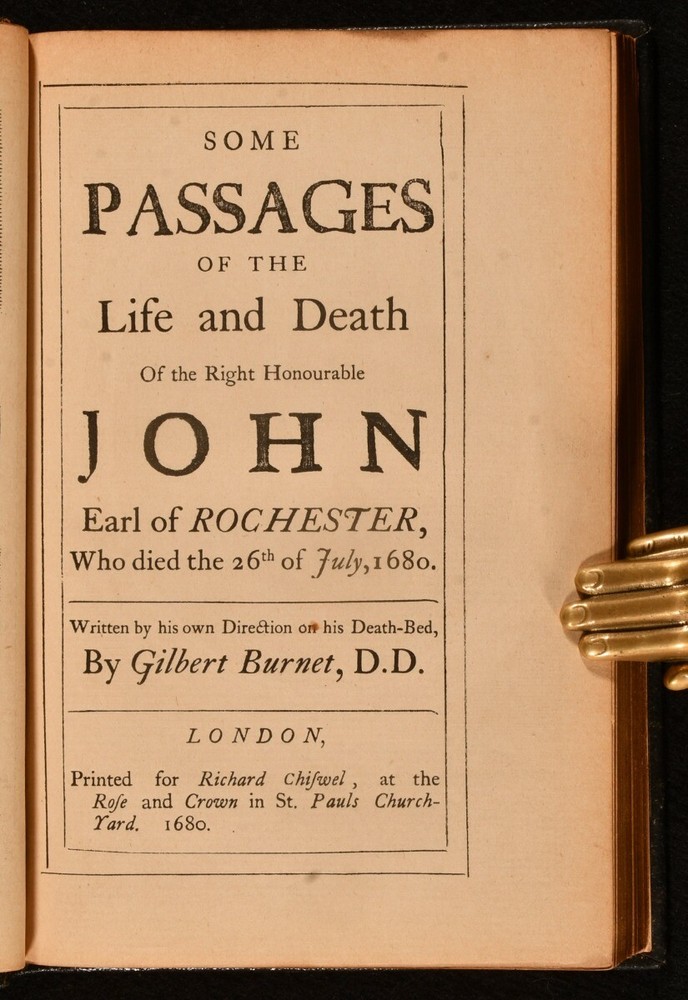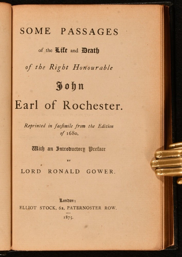 Click here to see our other books! Some Passages of the Life and Death of the Right Honourable John Earl of Rochester Gilbert Burnet; Lord Ronald Gower [ed.] 1875 Elliot Stock : London 7.5" by 5" vii [17], 1-182pp SUMMARY A late nineteenth century facsimile of a late seventeenth century biography of John, Earl of Rochester. Signed by the editor, Lord Ronald Gower. Leather Binding,Signed,Uncommon Overall Condition: Near Fine This book weighs 0.5 KG when packed UK Postage: £ 3.99 US Postage: £ 15.99 EU Postage : £ 13.99 European Postage: £ 14.99 Asia Postage: £ 18.99 Worldwide Postage: £ 19.99 DESCRIPTION Inscribed by the editor to a front blank 'To the Rev. John D Hill, from Ronald Gower. 8.6.75'. Gower was a British sculptor, best known for his statue of Shakespeare in Stratford-upon-Avon. He also wrote biographies of Marie Antoinette and Joan of Arc, as well as serving as Liberal Member of Parliament for Sutherland. He was one of several society figures implicated in the Cleveland Street Scandal, where a male brothel was raided by police. The uncommon 1875 facsimile of Gilbert Burnet's 1680 work, a touching yet entertaining memoir on the life of his good friend, the 2nd Earl of Rochester John Wilmot. This was a biography on the life of the Restoration rakish poet John Wilmot, the 2nd Earl of Rochester. Wilmot is as famous for his poetry as for this rakish habits in his personal life, a controversial figure who was popular at Charles II's court. His best known work is 'A Satyr Against Reason and Mankind'. CONDITION Rebound in full morocco, with endpapers renewed. Externally, lovely. Internally, firmly bound. Signed to a front blank. Pages age toned, but clean. Overall Condition: Near Fine GLOSSARY OF TERMS Overall Condition (Dustwrapper condition rating is shown after that for the book itself, where a dustwrapper is present) Fine - Very well preserved copy showing very little wear Very Good Indeed - Only one or two minor faults, really a very attractive copy Very Good - Quite a wide term meaning no major faults but probably several smaller ones often expected given the age of the book, but still a respectable copy Good - Meaning not very good. Some more serious faults as will be described in the condition report under 'condition' Good Only - Meaning one or more faults that could really do with repair Fair - As with good only above but with other faults leaving a compromised copy even after repair Poor - Really bad and possibly seriously incomplete. We only sell books in this condition where their rarity or value makes them attractive none the less. Major defects will be described. GUARANTEE We offer a full money back guarantee on our descriptions. Please ask for details and conditions. We prefer PAYPAL. If you pay via PAYPAL we will post the item off the same or the next working day with the postage you have selected. Please note we cannot accept USD cheques