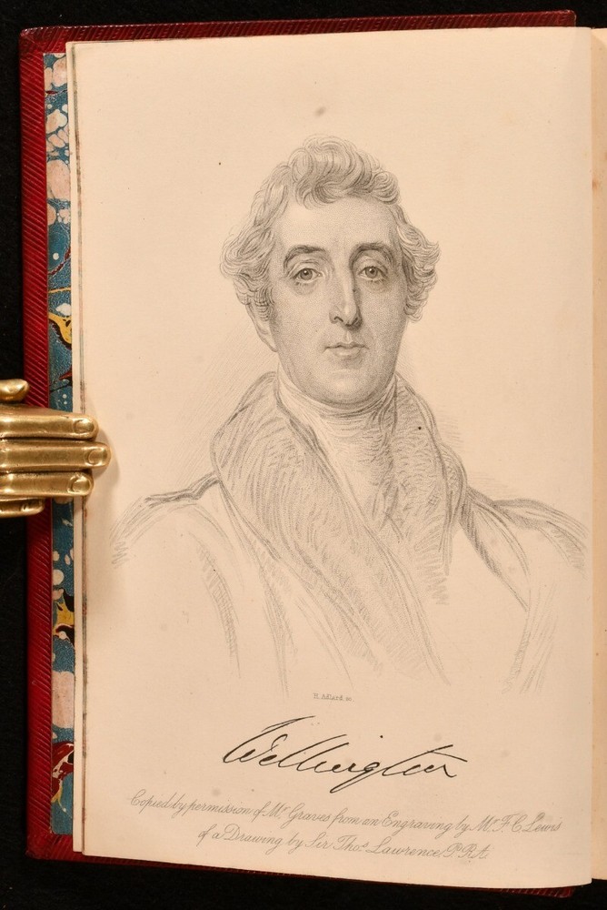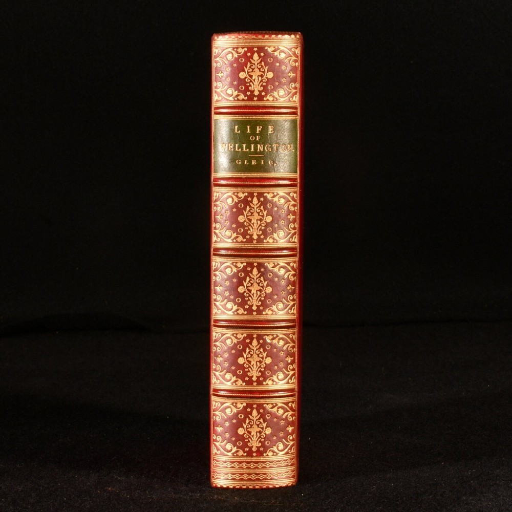 Click here to see our other books! The Life of Arthur Duke of Wellington G. R. Gleig 1875 Longmans, Green, Reader, and Dyer : London 7" by 5" [10], 500pp SUMMARY A beautifully bound copy of this biography of Arthur Duke of Wellington. Leather Binding Overall Condition: Fine This book weighs 1 KG when packed UK Postage: £ 3.99 US Postage: £ 22.99 EU Postage : £ 16.99 European Postage: £ 17.99 Asia Postage: £ 22.99 Worldwide Postage: £ 28.99 DESCRIPTION A revised, People's Edition of this biographical work of Arthur Duke of Wellington. This work describes the career as a General of Arthur Duke of Wellington. Arthur Wellesley was the First Duke of Wellington, being a Tory Statesman who was one of the leading military and political figures of the 19th Century, serving twice as Prime Minister of the United Kingdom. He is also one of the commanders who won and ended the Napoleonic Wars. With a frontispiece. CONDITION In full calf leather. Externally, excellent. Internally, firmly bound with bright and clean pages with very light scattered spots to the first few pages. Overall Condition: Fine GLOSSARY OF TERMS Overall Condition (Dustwrapper condition rating is shown after that for the book itself, where a dustwrapper is present) Fine - Very well preserved copy showing very little wear Very Good Indeed - Only one or two minor faults, really a very attractive copy Very Good - Quite a wide term meaning no major faults but probably several smaller ones often expected given the age of the book, but still a respectable copy Good - Meaning not very good. Some more serious faults as will be described in the condition report under 'condition' Good Only - Meaning one or more faults that could really do with repair Fair - As with good only above but with other faults leaving a compromised copy even after repair Poor - Really bad and possibly seriously incomplete. We only sell books in this condition where their rarity or value makes them attractive none the less. Major defects will be described. GUARANTEE We offer a full money back guarantee on our descriptions. Please ask for details and conditions. We prefer PAYPAL. If you pay via PAYPAL we will post the item off the same or the next working day with the postage you have selected. Please note we cannot accept USD cheques