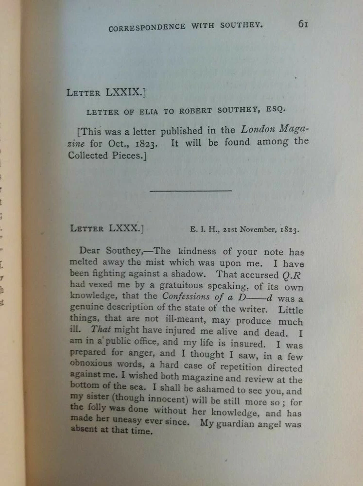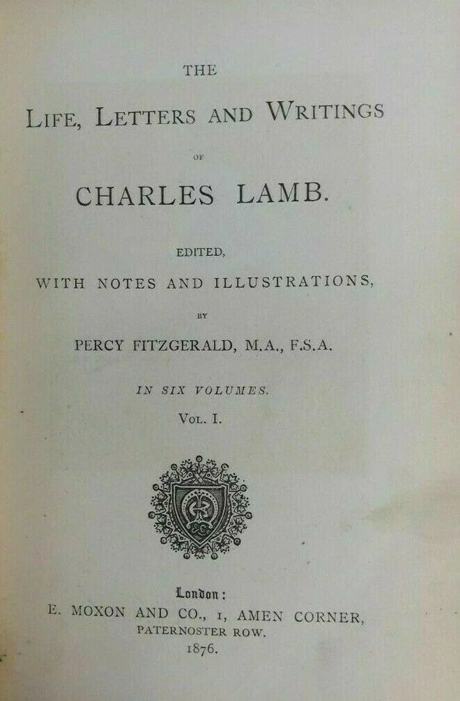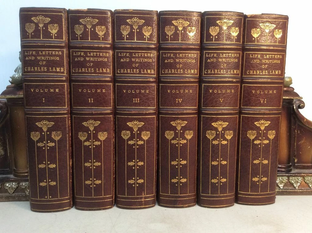Attention Charles Lamb fans!!! You are bidding on a rare set of antique hardcover books titled The Life, Letters and Writings of Charles Lamb. Edited with Notes and Illustrations by Percy Fitzgerald. Published by E. Moxon, London, 1876. The set is complete in six volumes and you are bidding on all six volumes. It is an all-matching set. This antique set is three-quarter bound in brown leather. The spines have three raised bands with gold lettering and gold decoration. The covers are firmly attached with no cracking or splitting of hinges. The bindings are firm and tight. The pages are tightly bound with almost no foxing. The top of the pages has gilt edge. Previous owner bookplate on inside of front cover with a couple other previous owner names in Volume one. The set shows a little bit of general wear and remains in very good condition. A very rare complete set! Would make a super addition to a collection. Great gift idea! (Inventory: Box 113) Track Page Views With Auctiva's FREE Counter