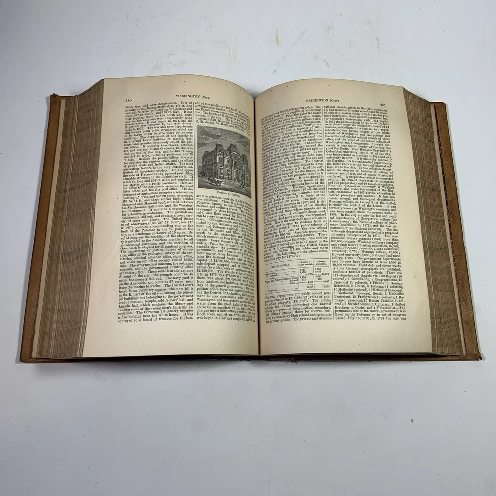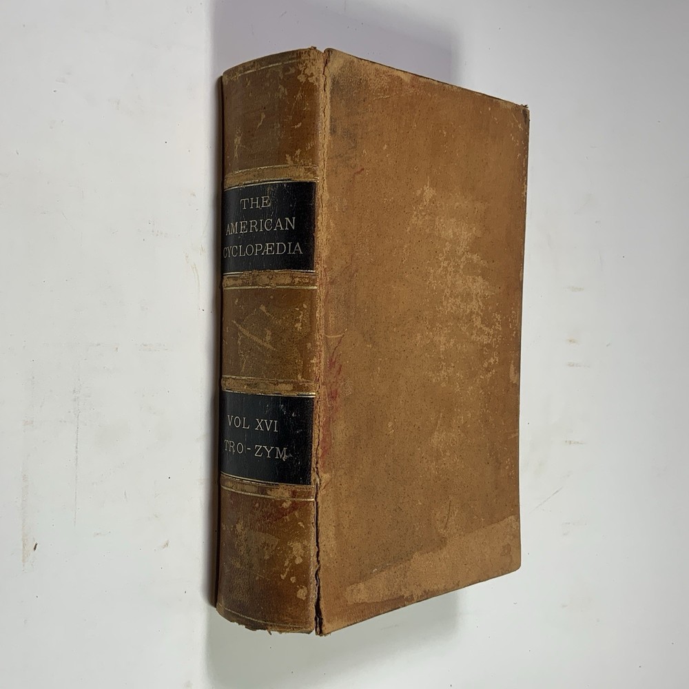 This is Volume XVI of The American Cyclopaedia , covering TROMBONE – ZYMOSIS , published by D. Appleton & Co. in 1876 . It is a 19th-century edition, leather-bound with marbled page edges. Condition: The leather cover shows wear consistent with age, including red color transfer, corner and edge scuffing, surface peeling, and splitting along the spine joint. The spine area is fragile and should be handled with care. The cover remains attached. Page edges show age-related discoloration and wear. The interior pages are complete and legible. May contain notations such as names, dates, or old pricing. The American Cyclopaedia, D. Appleton, antique encyclopedia, Victorian reference books, leather-bound books, vintage 1800s nonfiction, collectible history, historical library decor