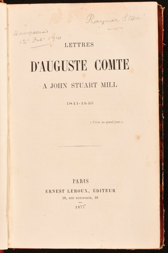 Click here to see our other books! Lettres D'Auguste Comte John Stuart Mill 1877 Ernest Leroux : Paris 9" by 6" x, 462, 4pp. SUMMARY A scarce collection of the letters of French philosopher, Auguste Comte. In the French language. Leather Binding,Scarce Overall Condition: Good This book weighs 1 KG when packed UK Postage: £ 3.99 US Postage: £ 22.99 EU Postage : £ 16.99 European Postage: £ 17.99 Asia Postage: £ 22.99 Worldwide Postage: £ 28.99 DESCRIPTION Scarce work. French language. A collection of the letters of Auguste Comte, a French philosopher, mathematician and writer who formulated the doctrine of positivism. Collected by John Stuart Mill, an English philosopher, political economist, Member of Parliament and civil servant. Remembered as of the most influential thinkers in the history of classical liberalism, through his contributions to social theory, political theory, and political economy. CONDITION Bound in half crushed morocco with marbled boards and endpapers. Externally, sound with rubbing and bumping to the extremities. Minor loss to the head and tail of the spine as well as extremities. Internally, firmly bound. Pages are bright and clean with the odd spot. Contemporary inscription to title page. Overall Condition: Good GLOSSARY OF TERMS Overall Condition (Dustwrapper condition rating is shown after that for the book itself, where a dustwrapper is present) Fine - Very well preserved copy showing very little wear Very Good Indeed - Only one or two minor faults, really a very attractive copy Very Good - Quite a wide term meaning no major faults but probably several smaller ones often expected given the age of the book, but still a respectable copy Good - Meaning not very good. Some more serious faults as will be described in the condition report under 'condition' Good Only - Meaning one or more faults that could really do with repair Fair - As with good only above but with other faults leaving a compromised copy even after repair Poor - Really bad and possibly seriously incomplete. We only sell books in this condition where their rarity or value makes them attractive none the less. Major defects will be described. GUARANTEE We offer a full money back guarantee on our descriptions. Please ask for details and conditions. We prefer PAYPAL. If you pay via PAYPAL we will post the item off the same or the next working day with the postage you have selected. Please note we cannot accept USD cheques