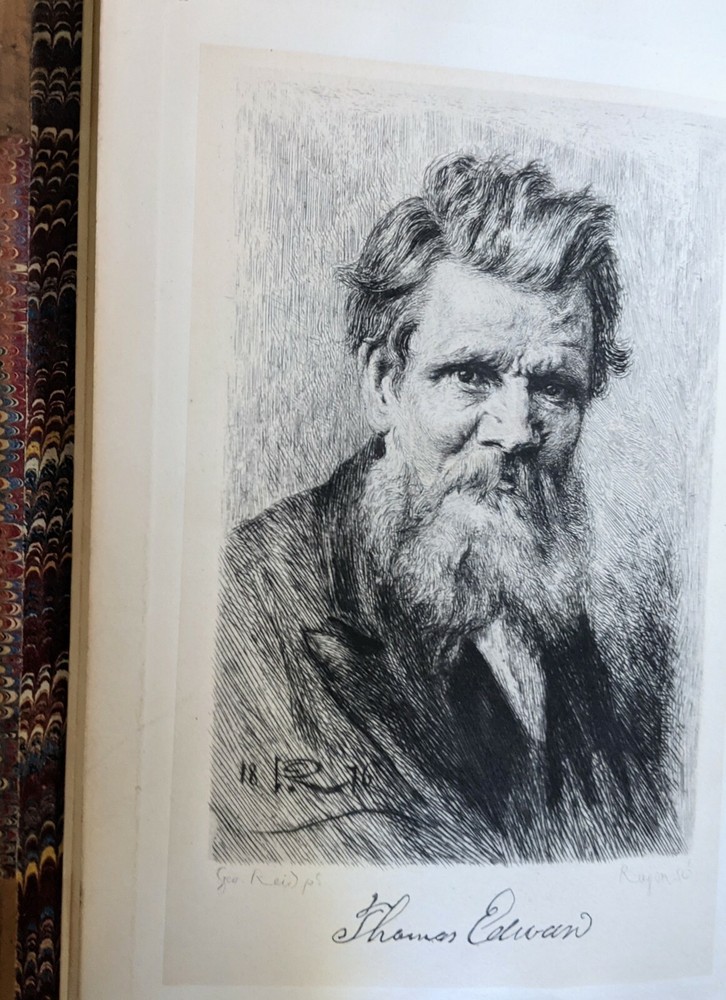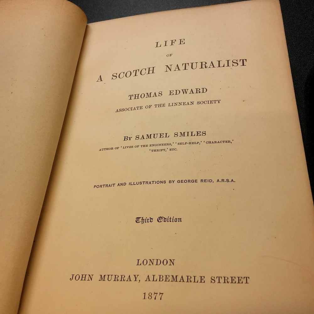 Life of A Scotch Naturalist - Thomas Edward " Associate of the Linnean Society" Samuel Smiles Sir George Reid (illustrations) Description: London: John Murray, 1876 / 1877 Stated Third Edition; 3/4 Antique leather, marbled boards, marbled edges and endsheets; octavo size with (xxx) 446 pages including the engraved frontispiece portrait, 6 plates and 25 smaller illustrations including maps within the text. Gift inscription to previous owner, dated 1893. The important b iography of Thomas Edward, including the development of his natural history collection and detailed information on birds, crustacea, mollusks, fishes and much more. "...Thomas Edward is not an ordinary man. Eighteen years since, I mentioned him in Self-Help, as one of the most extraordinary instances of perseverance in the cause of science that had ever come under my notice. Nor was he a man of any exalted position in society. He was a shoemaker then; he is a shoemaker still. For nearly thirty years he has fought the battle of scientific poverty. He was one of those men who lived for science, not by science. His shyness prevented him pushing himself forward; and when he had done his work, he was almost forgotten. How he pursued his love of Nature,—how he satisfied his thirst for knowledge, in the midst of trials, difficulties, and troubles,—not the least of which was that of domestic poverty,—will be found related in the following book. Indeed, it may be said of him, that he has endured as much hardship for the cause of science, as soldiers do in a prolonged campaign. He spent most of his nights out of doors, amidst damp, and wet, and cold. Men thought him mad for enduring such risks. He himself says, “I have been a fool to Nature all my life.”" - from the Preface Condition: Very Good clean, tight and bright book with light cover spots and the b ottom edge of cover edges worn as shown in the pictures here. Interior is very clean with a previous owner's gift inscription, dated 1893 on the first free endpaper. Additional Information: Thomas Edward (1814–1886) was a Scottish naturalist born in Gosport. He was trained as a shoemaker and eventually settled in Banff ( the town in the Banff and Buchan area of Aberdeenshire, Scotland) , where he devoted his leisure to the study of animal nature, and collected numerous specimens of animals, which he stuffed and exhibited, but with pecuniary loss; the Queen's attention being called to his case, she settled on him an annual pension of £50, while the citizens of Aberdeen presented him in March 1877 with a gift of 130 sovereigns (£130). Samuel Smiles (1812 - 1904) was a Scottish author and government reformer. Although he campaigned on a Chartist platform, he concluded that more progress would come from new attitudes than from new laws. His masterpiece, Self-Help (1859), promoted thrift and claimed that poverty was caused largely by irresponsible habits, while also attacking materialism and laissez-faire government. It has been called "the bible of mid-Victorian liberalism" and raised Smiles to celebrity status almost overnight. Sir George Reid was commissioned to paint Smiles's portrait, completed in 1877 and now in the collection of the National Gallery, London. Sir George Reid PPRSA (1841 - 1913) was a Scottish artist. He showed his versatility in landscape, which combined great breadth with fine detail, but most of all in his portraits, which are marked by great individuality, and by fine insight into character. His work in black-and-white, his admirable illustrations in brushwork of Edinburgh and its neighborhood, and also his pen-drawings, about which it has been declared that "his work contains all the subtleties and refinements of a most delicate etching," must also be noted. Elected Associate of the Royal Scottish Academy in 1870, Reid attained full membership in 1877, and took up his residence in Edinburgh, at 17 Carlton Terrace on Calton Hill,[3] in 1882. In 1891 he was elected President - a post which he held until 1902 - receiving also the honor of knighthood, and he was awarded a gold medal at the Paris Exhibition of 1900. Cavemodern was founded in 2005 as a home for important "modern" books and works on paper. "Cave" meant a home for both the tangible touch of beautiful objects and a cozy virtual den for armchair exploration. "Modern" starts with the art and literature that went beyond realistic depictions to expressive use of color, non-traditional materials, and new techniques and mediums. Our focus has evolved to be on important pieces by cultural innovators that take their work in new, unexpected, and modern directions .