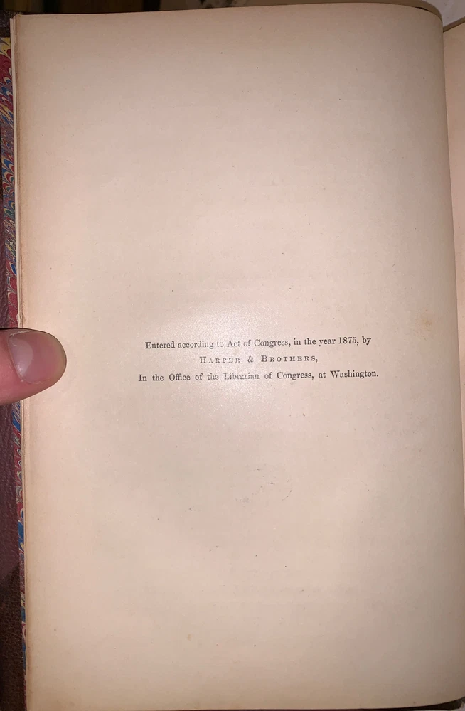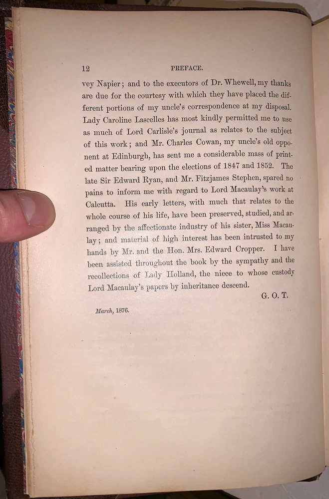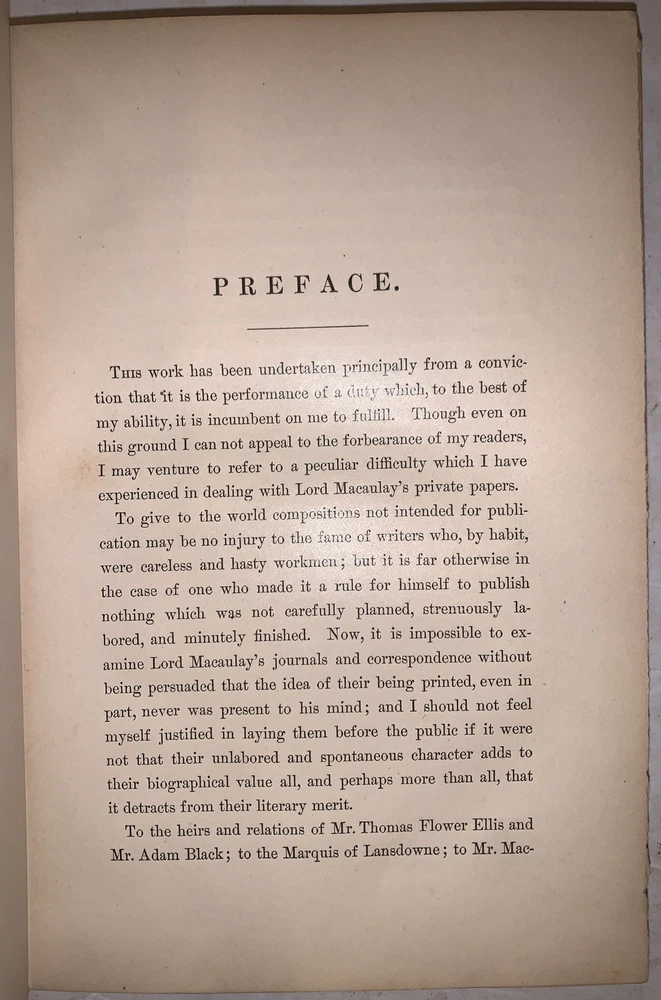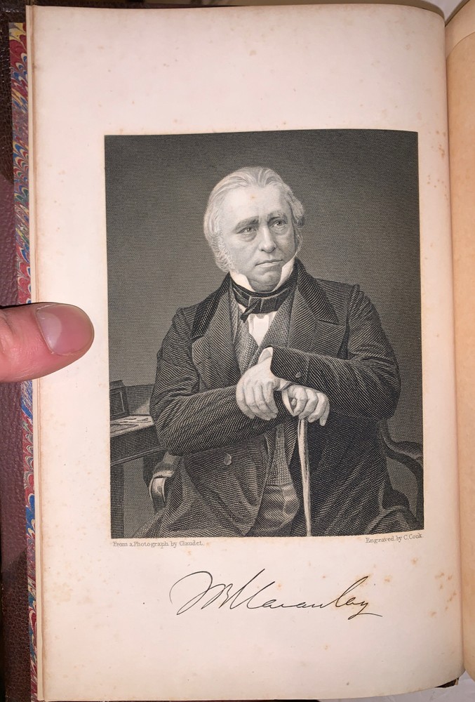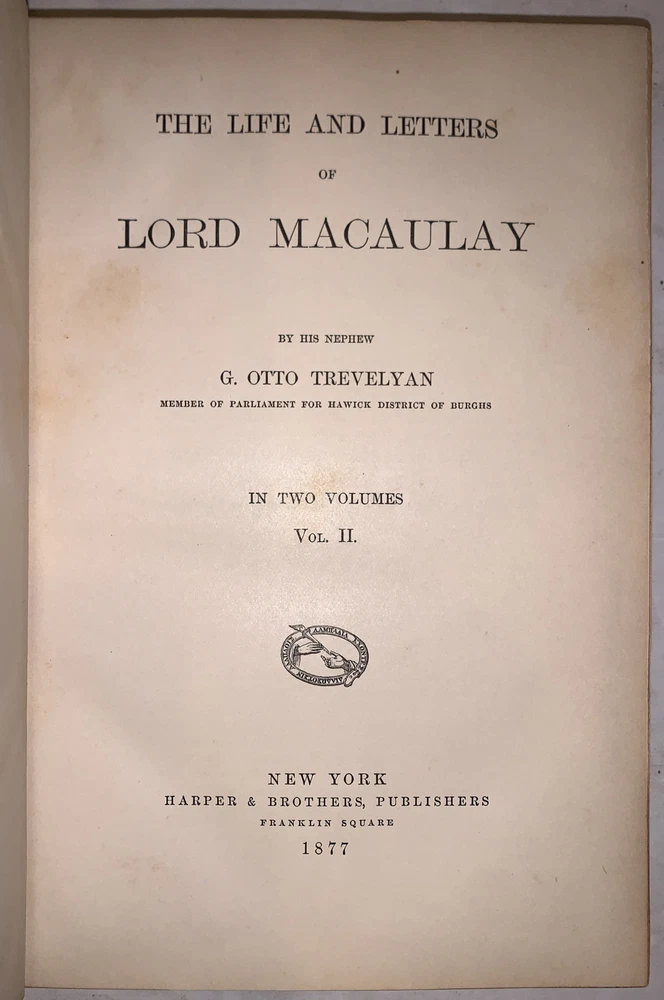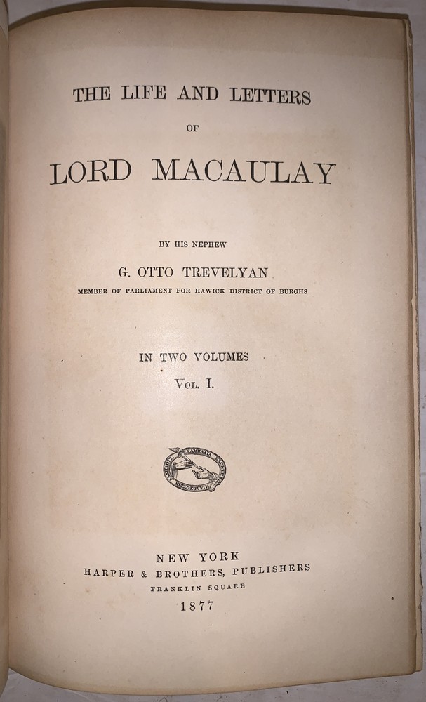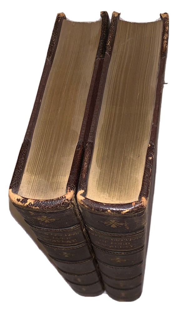 The Life and Letters of Lord Macaulay by his nephew G. Otto Trevelyan In Two Volumes New York: Harper & Brothers, Publishers 1877 Two octavos, 416pp; 416pp., bound in period three quarter leather over purple cloth covered boards. Raised bands, gilt lettering and decoration to spines. Top edges gilt. Marbled endpapers. Some slight rubbing and wear, corners bruised, scuffs, hinges rubbed, else in very good condition. If you have any questions feel free to ask and don't forget to check out my other listings.