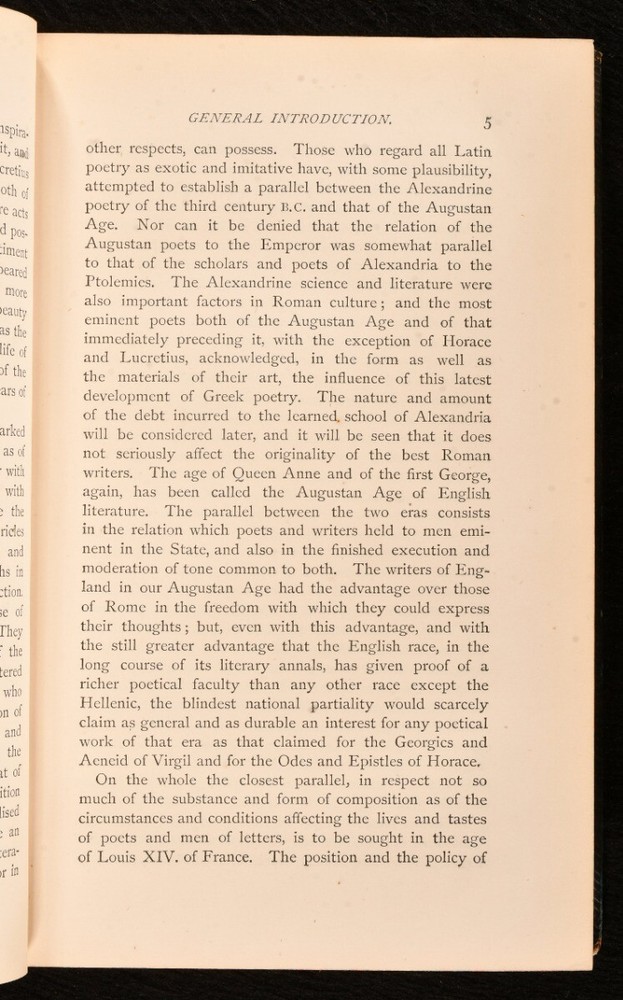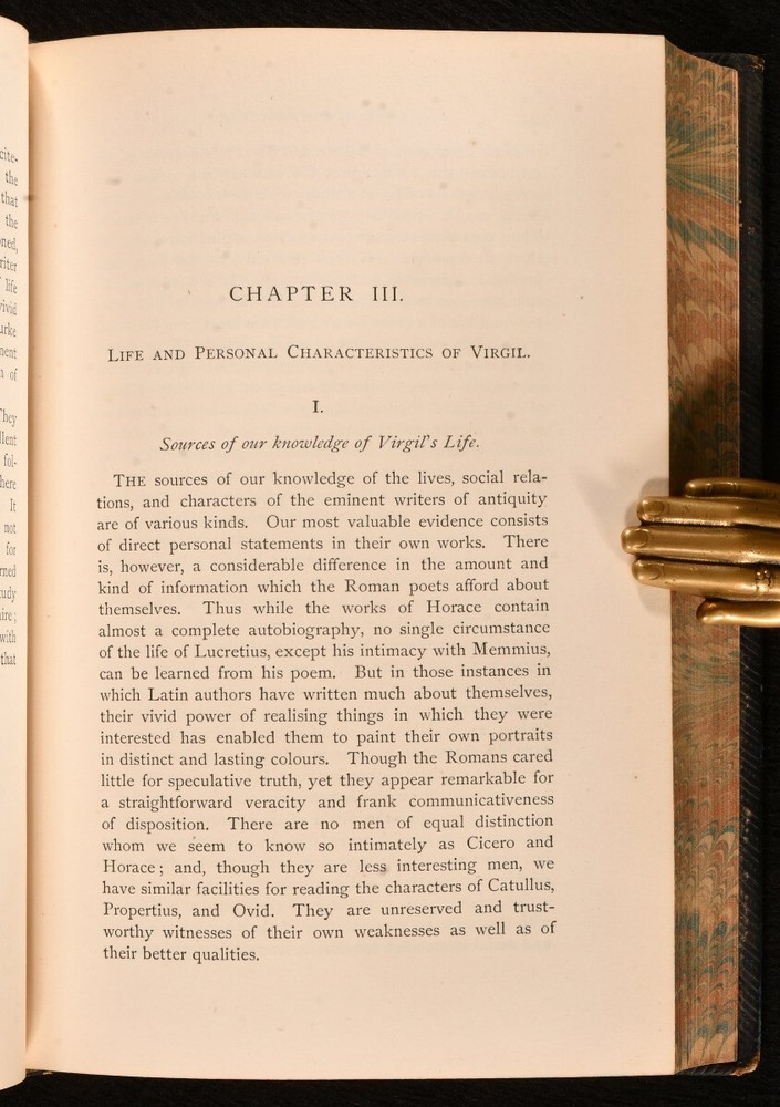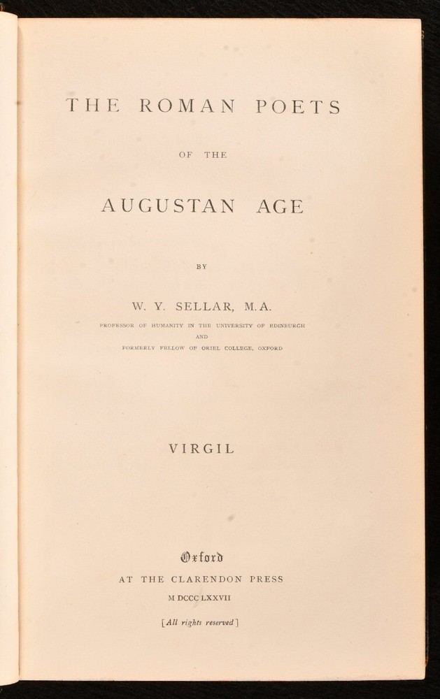 Click here to see our other books! The Roman Poets of the Augustan Age W. Y. Sellar 1877 Clarendon Press : Oxford 6" by 9" xx, 413pp. SUMMARY The first edition of W. Y. Sellar's educational work, bound in a handsome full calf prize binding. First Edition,Leather Binding Overall Condition: Very Good This book weighs 1 KG when packed UK Postage: £ 3.99 US Postage: £ 22.99 EU Postage : £ 16.99 European Postage: £ 17.99 Asia Postage: £ 22.99 Worldwide Postage: £ 28.99 DESCRIPTION The first edition of the work. This educational work expands on previous works of W. Y Sellar and other scholars. It focuses on the Roman poets of the Augustan Age and how and why they still have relevance. Theory and historical knowledge is central to the way in which the information is taught demonstrating the importance of context to understanding the classics. Themes and information are broken down within 11 chapters which all contain detailed sections broken up with subheadings and sections. Bound in calf with the prize binding of Reading School and accompanying bookplate to front paste down. Education and the importance of learning is celebrated within this copy. CONDITION In a full calf binding with Reading School prize binding to front board. Externally smart with slight rubbing to boards resulting in loss to the front and back corners. Light marks to the boards. Internally firmly bound. Spotting to the blanks and bookplate but pages bright and clean. Overall Condition: Very Good GLOSSARY OF TERMS Overall Condition (Dustwrapper condition rating is shown after that for the book itself, where a dustwrapper is present) Fine - Very well preserved copy showing very little wear Very Good Indeed - Only one or two minor faults, really a very attractive copy Very Good - Quite a wide term meaning no major faults but probably several smaller ones often expected given the age of the book, but still a respectable copy Good - Meaning not very good. Some more serious faults as will be described in the condition report under 'condition' Good Only - Meaning one or more faults that could really do with repair Fair - As with good only above but with other faults leaving a compromised copy even after repair Poor - Really bad and possibly seriously incomplete. We only sell books in this condition where their rarity or value makes them attractive none the less. Major defects will be described. GUARANTEE We offer a full money back guarantee on our descriptions. Please ask for details and conditions. We prefer PAYPAL. If you pay via PAYPAL we will post the item off the same or the next working day with the postage you have selected. Please note we cannot accept USD cheques