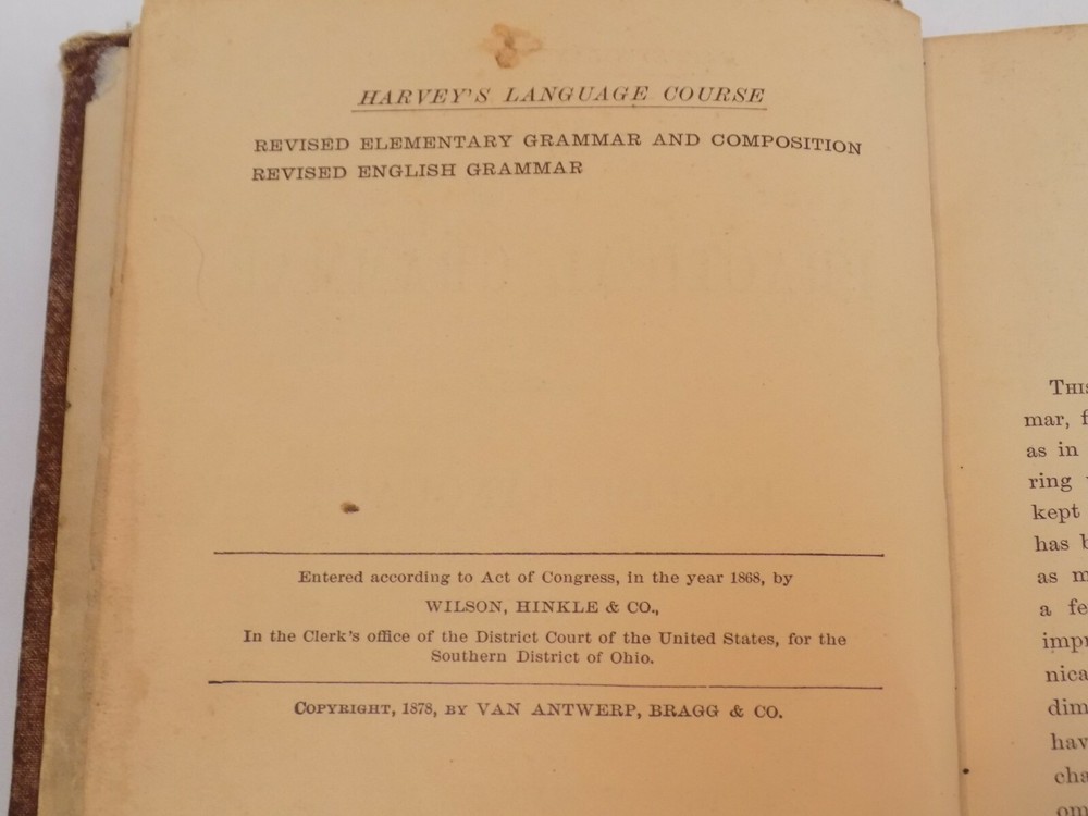 You are buying an 1878 Thomas Harvey's English Practical Grammar Language Course published by Van Antwerp, Bragg. This is a very old book with lots of wear and tears. Some writing in the text. See photos enlarged for details as they are part of the description. Please see all of my other great auctions that I am more than happy to combine shipping on (just let me know when all auctions are complete) or feel free to email me with any questions. Additional shipping on items is usually no more than $1.00 for each additional item (added to the highest shipping total) or in MOST cases - FREE SHIPPING. For returns: Save original packaging as instruction will be given as to returning in the original packaging. I try my best to describe the item accurately. If I make a mistake, please know that it is a mistake and I will take care of it. I want you to be happy with your item and I want it to be a positive transaction for us both. Let me know if there is a problem before posting bad feedback so that I have a chance to correct it. Let’s treat each other with respect and discuss any problems. NOTE: Items that are returned NOT due to an error in the listing will have a 20% restocking fee deducted from the amount of the refund. This fee to is to help compensate for postage fees, delivery confirmation, labels, eBay listing and final value fees, and paypal fees. If I made an error in the listing there will not be any restocking fee. Items must be returned in the same condition that they are received, including New items must be returned in new condition and in the original packaging. International Buyers–NOTE: Import