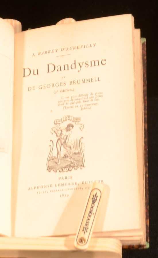Click here to see our other books! Du Dandysme et de Georges Brummell J.Barbey j'Aurevilly 1879 Alphonse Lemerre : Paris 6.5" - 3" 127pp SUMMARY A biography of Georges Brummell in which the author defends the dandy lifestyle. Fine Binding,Leather Binding Overall Condition: Very Good This book weighs 1 KG when packed UK Postage: £ 3.99 US Postage: £ 22.99 EU Postage : £ 16.99 European Postage: £ 17.99 Asia Postage: £ 22.99 Worldwide Postage: £ 28.99 DESCRIPTION A biography of Georges Brummell in which the author defends the dandy lifestyle. With an engraved frontispiece. Third Edition. First published in 1845, this work is not only a biography but also a philosophical essay. A mixture of historical and anecdotal details it covers the life of Georges Brummell, an iconic figure of regency England. Brummell was a close friend of the Prince Regent, the future King George IV. His style of dress, consisted of understated, but perfectly tailored garments, rejecting the overly ornate fashions of the day. He wore long black coats, full length trousers with pristine shirts and cravats, a forerunner of the modern men's suits. This mode of dress, often referred to as dandyism, he established as a fashion. After living a lavish lifestyle, mixing with aristocratic society he was forced in 1816 to flee to France to escape debtors prison, and eventually died there of syphilis in an asylum, aged sixty two. CONDITION In a half morocco binding. Externally is very smart with some slight rubbing. The corners have suffered some light bumping. There is minor fading to the spine. Internally firmly bound with bright and clean pages. Previous owner's bookplate to front pastedown. Overall Condition: Very Good GLOSSARY OF TERMS Overall Condition (Dustwrapper condition rating is shown after that for the book itself, where a dustwrapper is present) Fine - Very well preserved copy showing very little wear Very Good Indeed - Only one or two minor faults, really a very attractive copy Very Good - Quite a wide term meaning no major faults but probably several smaller ones often expected given the age of the book, but still a respectable copy Good - Meaning not very good. Some more serious faults as will be described in the condition report under 'condition' Good Only - Meaning one or more faults that could really do with repair Fair - As with good only above but with other faults leaving a compromised copy even after repair Poor - Really bad and possibly seriously incomplete. We only sell books in this condition where their rarity or value makes them attractive none the less. Major defects will be described. GUARANTEE We offer a full money back guarantee on our descriptions. Please ask for details and conditions. We prefer PAYPAL. If you pay via PAYPAL we will post the item off the same or the next working day with the postage you have selected. Please note we cannot accept USD cheques