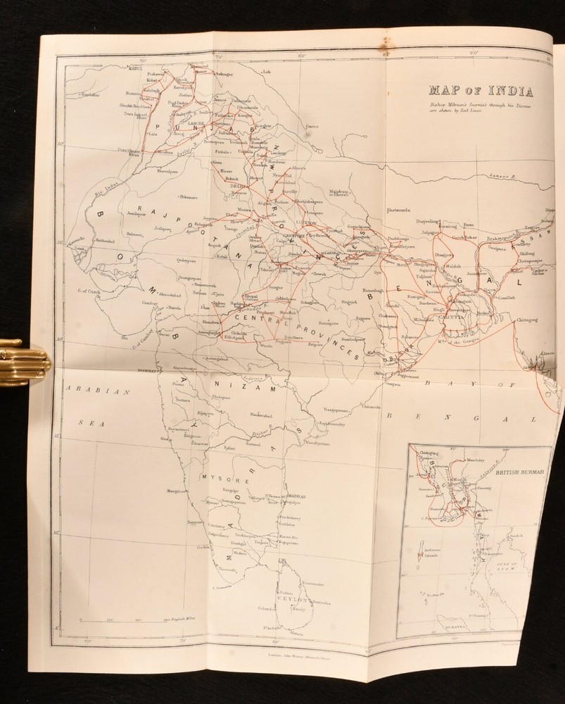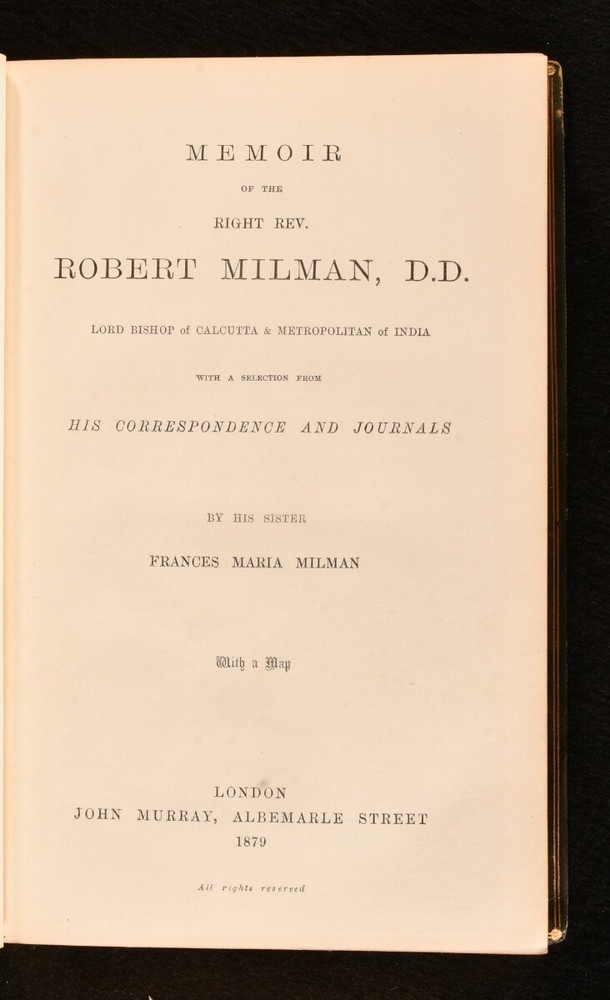 Click here to see our other books! Memoir of the Right Rev. Robert Milman, D.D., Lord Bishop of Calcutta & Metropolitan of India Frances Maria Milman 1879 John Murray : London 9" by 6" xii, 390pp. SUMMARY A first edition copy of this scarce memoir of Robert Milman, an association copy inscribed by the author to her friend in 1883. Author's Presentation Copy,First Edition,Folding Maps,Scarce,Signed Overall Condition: Very Good Indeed This book weighs 1 KG when packed UK Postage: £ 3.99 US Postage: £ 22.99 EU Postage : £ 16.99 European Postage: £ 17.99 Asia Postage: £ 22.99 Worldwide Postage: £ 28.99 DESCRIPTION The first edition of this scarce work in a full calf binding with marbled end papers. All edges gilt. An association copy, inscribed by the author to her "affectionate old friend" Constance Menzies to the front free end paper, dated 1883. Robert Milman (1816-1876) was an Anglican bishop who wrote a number of publications such as Life of Tasso. This work is a fond memoir of Milman by his sister, Frances Maria Milman, who accompanied him to Calcutta where he served as bishop. CONDITION In a full calf binding. Externally smart, though a little rubbed to the boards, spine and extremities. Internally, firmly bound. Pages are bright and clean, with the odd spot to the first and last couple of pages. Overall Condition: Very Good Indeed GLOSSARY OF TERMS Overall Condition (Dustwrapper condition rating is shown after that for the book itself, where a dustwrapper is present) Fine - Very well preserved copy showing very little wear Very Good Indeed - Only one or two minor faults, really a very attractive copy Very Good - Quite a wide term meaning no major faults but probably several smaller ones often expected given the age of the book, but still a respectable copy Good - Meaning not very good. Some more serious faults as will be described in the condition report under 'condition' Good Only - Meaning one or more faults that could really do with repair Fair - As with good only above but with other faults leaving a compromised copy even after repair Poor - Really bad and possibly seriously incomplete. We only sell books in this condition where their rarity or value makes them attractive none the less. Major defects will be described. GUARANTEE We offer a full money back guarantee on our descriptions. Please ask for details and conditions. We prefer PAYPAL. If you pay via PAYPAL we will post the item off the same or the next working day with the postage you have selected. Please note we cannot accept USD cheques