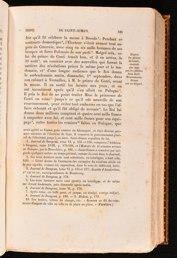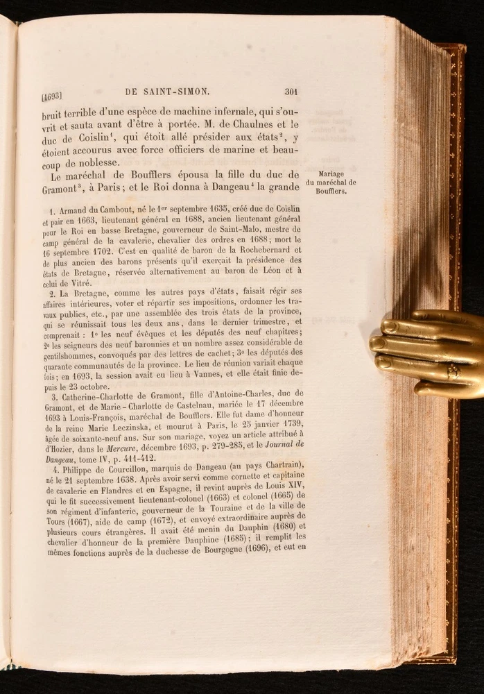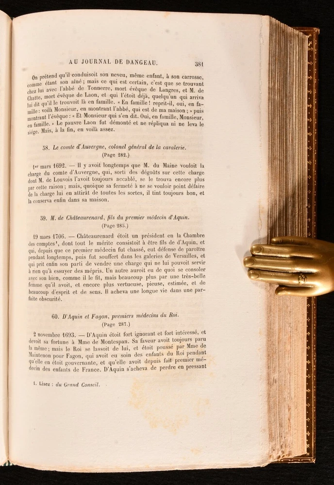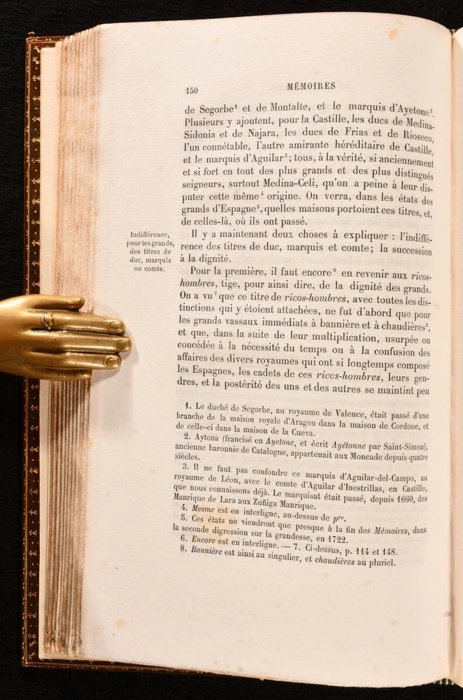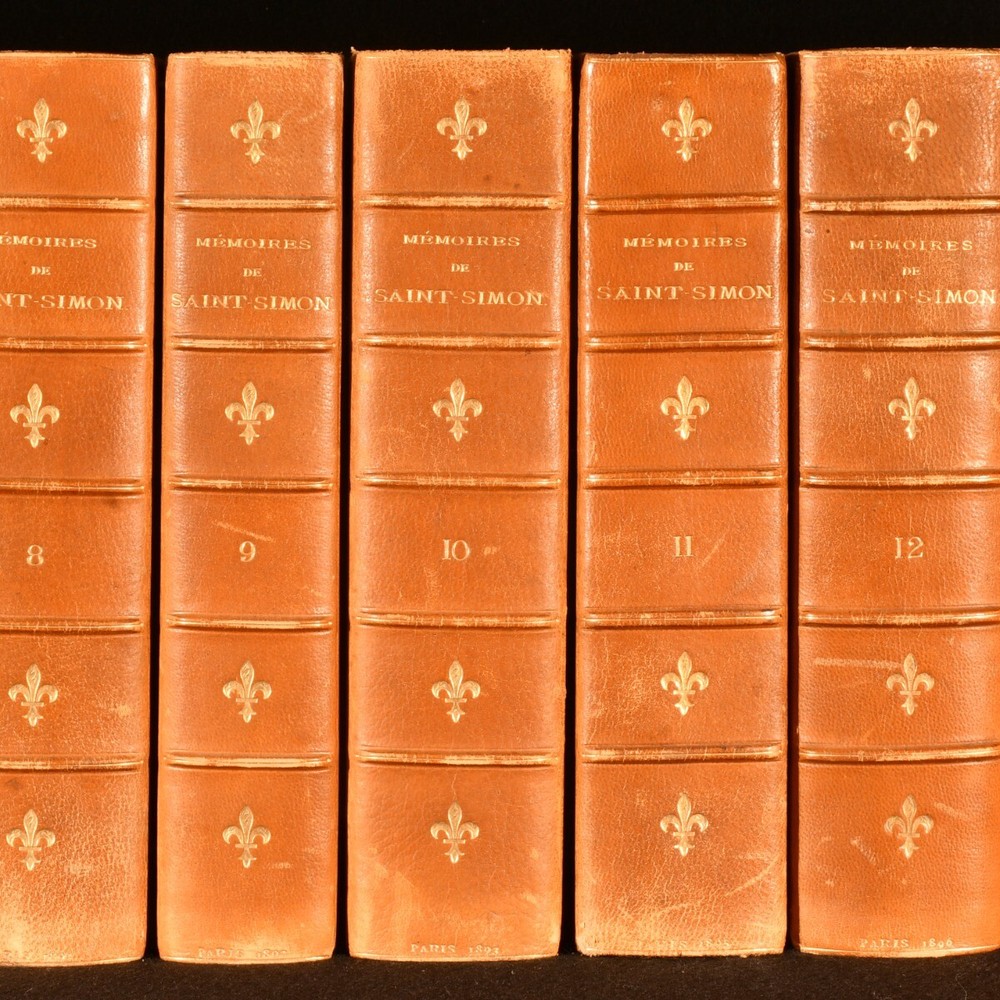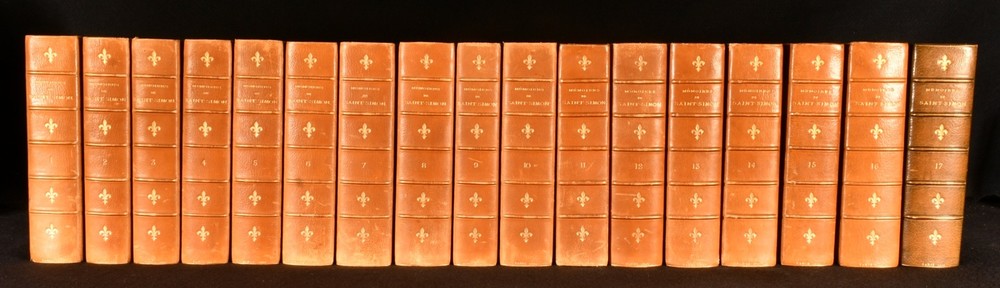 Click here to see our other books! Memoires de Saint-Simon Louis de Roubroy; Duc de Saint-Simon; A. de Boislisle 1879-1903 Hachette et Cie : Paris 9.5" by 6" lxxxiii, 590, [62]; 546, [62]; viii, 581, [50]; 579, [64]; 649, [64]; 655, [62]; 685, [62]; 714, [60]; 501, [62]; 652, [62]; 618, [54]; 681, [68]; 675, [68]; 700, [66]; iv, 670, [54]; 739, [68]; 677, [66pp] SUMMARY A smart Ramage bound set of the memoirs of Louis de Rouvroy, duc de Saint-Simon, in the original French. Leather Binding,Signed Binding Overall Condition: Very Good Indeed This book weighs 30 KG when packed UK Postage: £ 4.49 US Postage: £ 99.99 EU Postage : £ 49.99 European Postage: £ 99.99 Asia Postage: £ 187.99 Worldwide Postage: £ 276.99 DESCRIPTION In a Ramage binding. In the original French. Seventeen volumes of a total of forty-three. The memoirs of Louis de Rouvroy, the duc de Saint-Simon. These memoirs provide a fantastic, full, and lively account of court life at Versailles during the reigns of Louis XIV and XV. They are considered to be one of the greatest endeavours of French literature. Saint-Simon memoirs' have been translated to many languages. Upon his death all of his possessions, including his writings, were seized by the crown, and it is thought a large portion of his 'Memoires' disappeared. It was revealed through his memoires that Saint-Simon had many enemies, mostly courtiers. For example, in these memoirs, he proclaims his hatred to the illegitimate children of Louis XIV An incomplete set, containing information for the years 1691 to 1709, the full works continues to 1723. This new edition was edited by Arthur de Boislisle, a French archivist and historian. Bookplate to front pastedown of Volumes III and XVII and the gilt stamped crest to volumes III, XIV, XV and XVII are that of William Carr. William Carr was a biographer for the Dictionary of National Biography, historian, magistrate and Deputy Lieutenant for Norfolk. Every volume has been bound with an additional number of blank pages for notation purposes. CONDITION In a full crushed morocco binding by Ramage. Externally, smart. Spines are faded. A few light marks to the leather. Minor rubbing to the spins and extremities, and to the front board of Volumes V, VIII, and to the rear board of Volume XII. Chips to the spine of Volume I, and to the rear board of Volume II. Spots to the fore edges. Bookplate to the front paste downs of Volumes III and XVII. Internally, firmly bound. Pages are bright and with scattered spots. Occasional gatherings to volumes V, VI, VII, and X are unopened. Overall Condition: Very Good Indeed GLOSSARY OF TERMS Overall Condition (Dustwrapper condition rating is shown after that for the book itself, where a dustwrapper is present) Fine - Very well preserved copy showing very little wear Very Good Indeed - Only one or two minor faults, really a very attractive copy Very Good - Quite a wide term meaning no major faults but probably several smaller ones often expected given the age of the book, but still a respectable copy Good - Meaning not very good. Some more serious faults as will be described in the condition report under 'condition' Good Only - Meaning one or more faults that could really do with repair Fair - As with good only above but with other faults leaving a compromised copy even after repair Poor - Really bad and possibly seriously incomplete. We only sell books in this condition where their rarity or value makes them attractive none the less. Major defects will be described. GUARANTEE We offer a full money back guarantee on our descriptions. Please ask for details and conditions. We prefer PAYPAL. If you pay via PAYPAL we will post the item off the same or the next working day with the postage you have selected. Please note we cannot accept USD cheques
