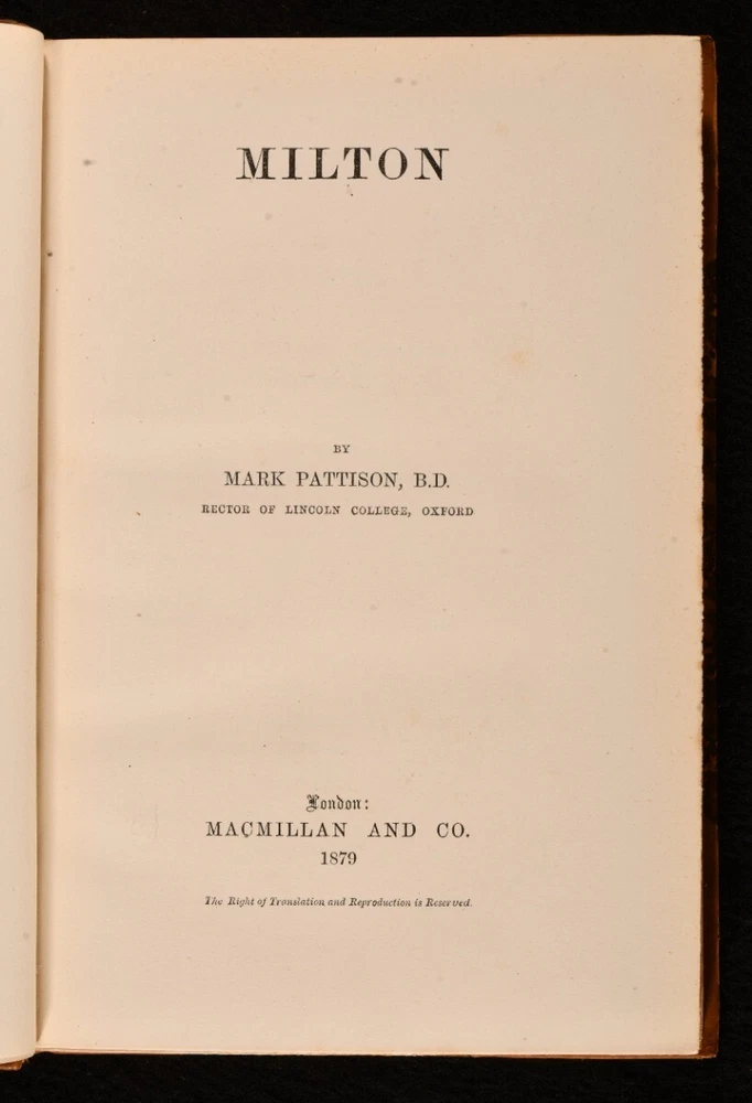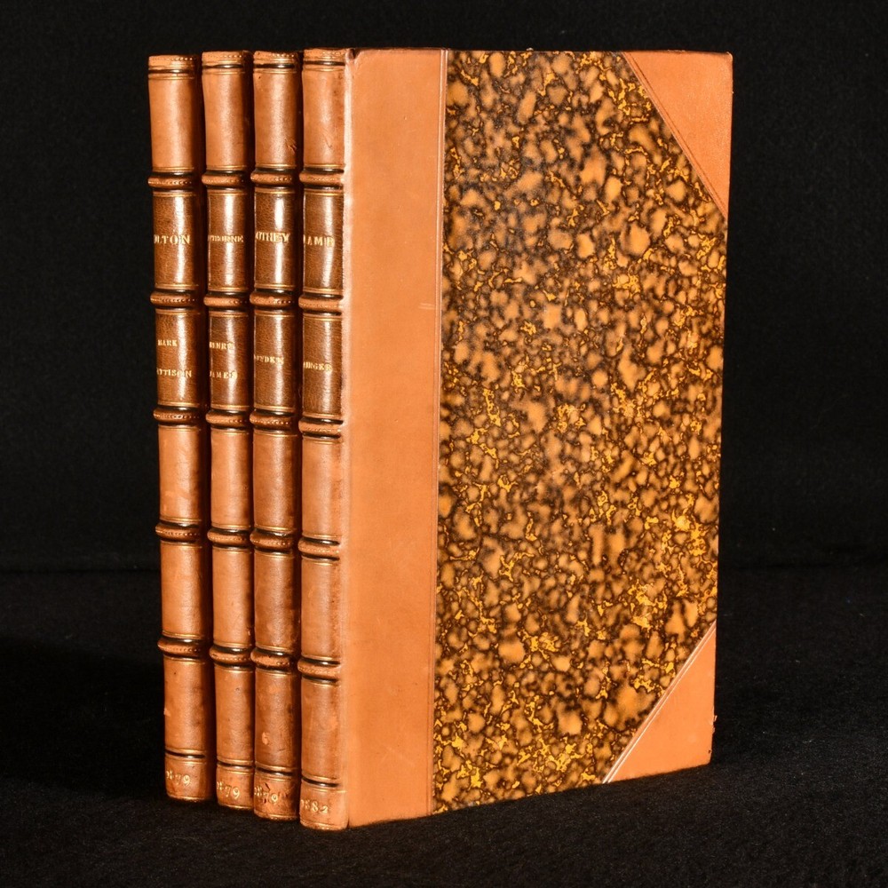 Click here to see our other books! English Men of Letters: Milton; Hawthorne; Southey; Lamb John Morley [ed.] 1879-82 Macmillan and Co. : London 7.5" by 5" vi, [2], 220; vi, [2], 183; vi, [2], 199; x, [2], 186pp. SUMMARY Four volumes of biographies in John Morley's 'English Men of Letters' series in uniform H. Wood signed bindings. Leather Binding,Rebound,Signed Binding Overall Condition: Near Fine This book weighs 2 KG when packed UK Postage: £ 3.99 US Postage: £ 29.99 EU Postage : £ 21.99 European Postage: £ 23.99 Asia Postage: £ 37.99 Worldwide Postage: £ 38.99 DESCRIPTION A collection of four volumes from the 'English Men of Letters' series of biographies edited by John Morley. Comprising the following: 'Milton' by Mark Pattison; 'Hawthorne' by Henry James; 'Southey' by Edward Dowden; and 'Charles Lamb' by Alfred Ainger. CONDITION Rebound in uniform half calf bindings over marbled boards, gilt to top edge signed by H. Wood. Externally very smart with minor shelf wear only. Internally, firmly bound. Light minor spotting to endpapers, otherwise pages bright and clean. Overall Condition: Near Fine GLOSSARY OF TERMS Overall Condition (Dustwrapper condition rating is shown after that for the book itself, where a dustwrapper is present) Fine - Very well preserved copy showing very little wear Very Good Indeed - Only one or two minor faults, really a very attractive copy Very Good - Quite a wide term meaning no major faults but probably several smaller ones often expected given the age of the book, but still a respectable copy Good - Meaning not very good. Some more serious faults as will be described in the condition report under 'condition' Good Only - Meaning one or more faults that could really do with repair Fair - As with good only above but with other faults leaving a compromised copy even after repair Poor - Really bad and possibly seriously incomplete. We only sell books in this condition where their rarity or value makes them attractive none the less. Major defects will be described. GUARANTEE We offer a full money back guarantee on our descriptions. Please ask for details and conditions. We prefer PAYPAL. If you pay via PAYPAL we will post the item off the same or the next working day with the postage you have selected. Please note we cannot accept USD cheques