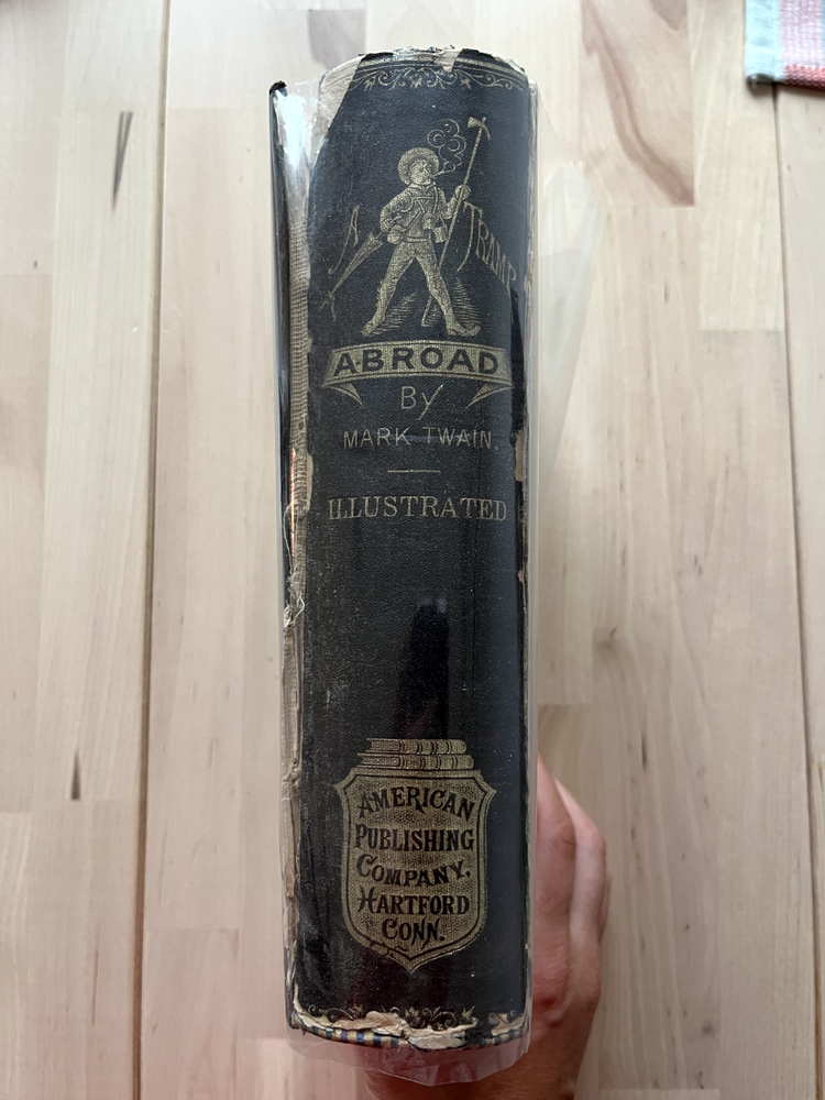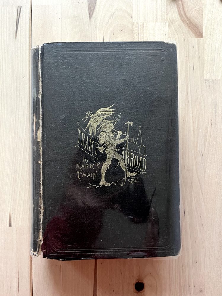 First Edition A Tramp Abroad by Mark Twain, printed in 1880. Comes in plastic cover for preservation. Readable copy - binding shows wear commensurate with being nearly 150 years old. A Tramp Abroad is a work of travel literature , including a mixture of autobiography and fictional events, by American author Mark Twain , published in 1880. The book details a journey by the author, with his friend Harris (a character created for the book, and based on his closest friend, Joseph Twichell ), through central and southern Europe . While the stated goal of the journey is to walk most of the way, the men find themselves using other forms of transport as they traverse the continent. The book is the fourth of Mark Twain's six travel books published during his lifetime and is often thought to be an unofficial sequel to the first one, The Innocents Abroad (1869). As the two men make their way through Germany, the Alps , and Italy, they encounter situations made all the more humorous by their reactions to them. The narrator (Twain) plays the part of the American tourist of the time, believing that he understands all that he sees, but in reality understanding none of it.