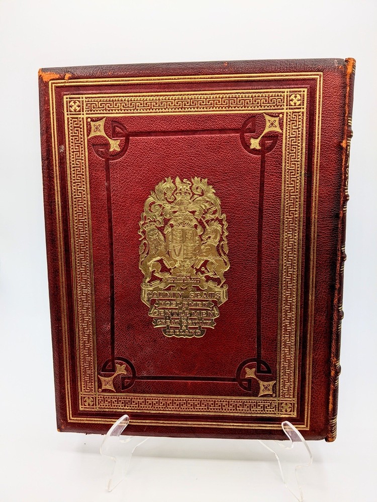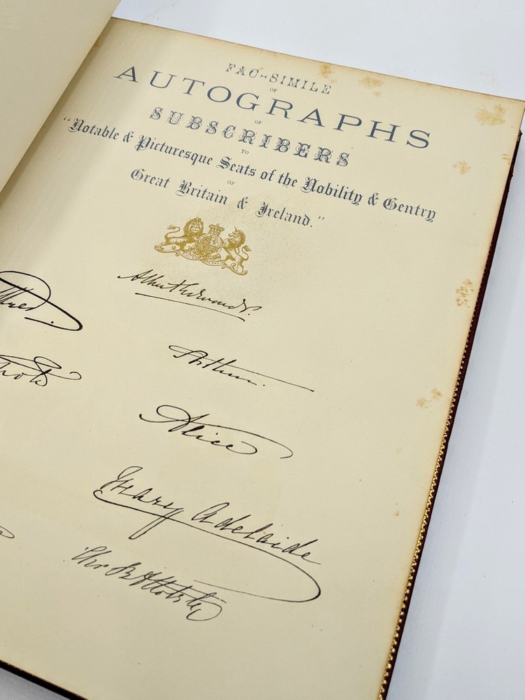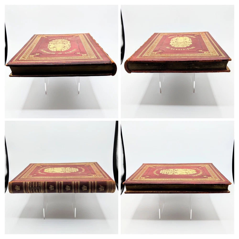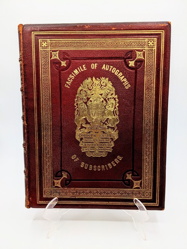 1880 Antique Book The Front Cover Title : Facsimile of Autographs County Seats of the Noblemen & Gentlemen of Great Britain & Ireland The Spine Title : Facsimile of Autographs of Subscribers to County Seats The inside Title Page : Fac-Simile of Autographs of Subscribers to the Picturesque Views of SCOTS of Noblemen and Gentlemen of Great Britain and Ireland Osborne House London : A. Clarke 1880 The Second Page : Fac-Simile of Autographs of Subscribers to “ Notable & Picturesque Seats of the Nobility & Gentry of Great Britain & Ireland” Many names of dukes, marquises, earls,viscounts, lords, honorable, foreigners of distinction, ladies of rank, baronets and knights, members of parliament. Also more names and addresses. Great reference book for history and ancestry Gilded Edges Red Leather Embossed Golden Crest featuring a Crowned Lion & an Unicorn 5 Golden Crowns on the Spine General wear and tear, scuffs on the many corners and the edges, many stains on the edges of the pages due to the age No rips, No writings THE BINDING IS INTACT Please enlarge all pictures to check any flaws you might not like Great Gift for Thanksgiving Christmas Holiday New Year’s Eve New Year’s Day Valentine’s Day Mother’s Day Father’s Day Birthday Anniversary Family Gathering Kids Children From smoke free pet free home * The Stand(s) Not Included * #58xx