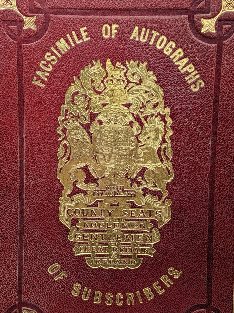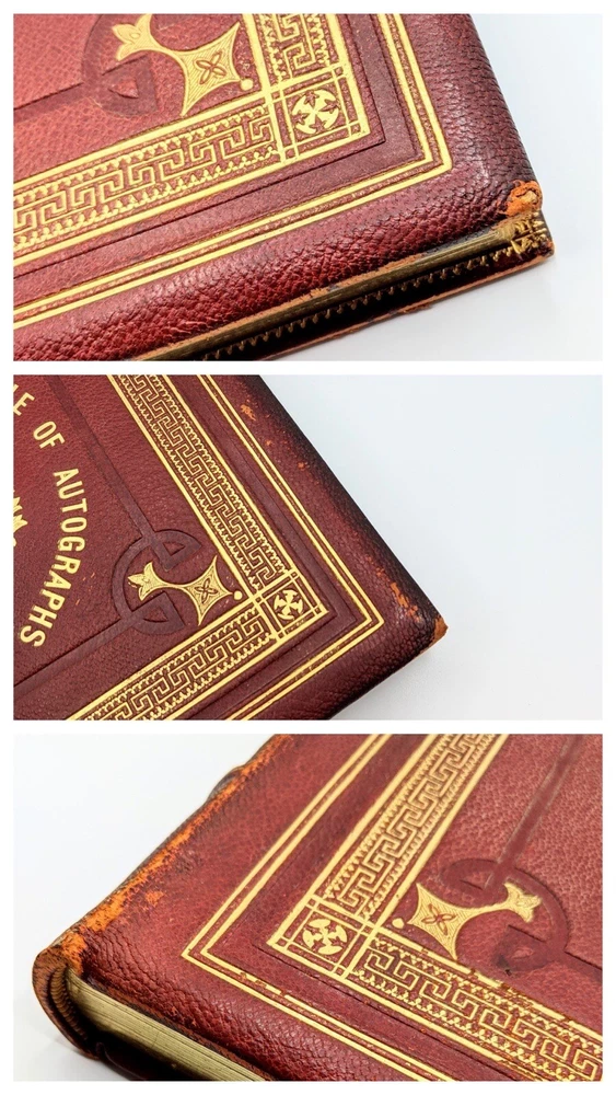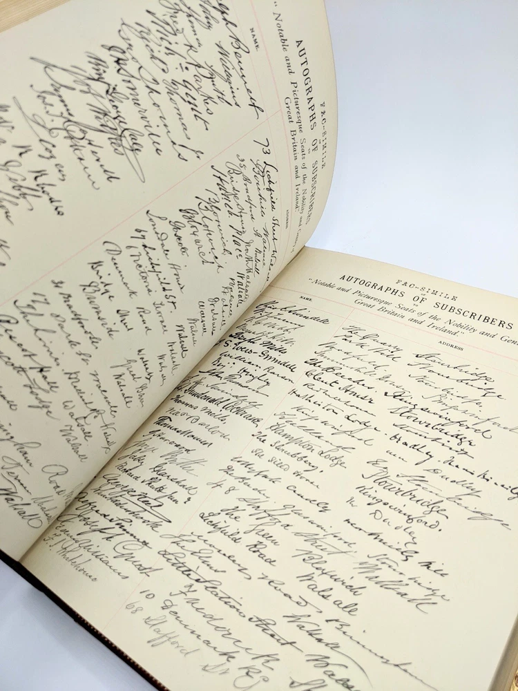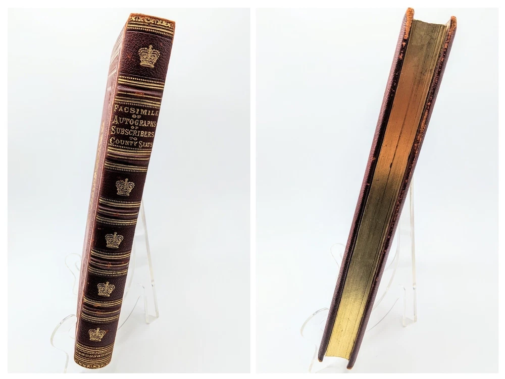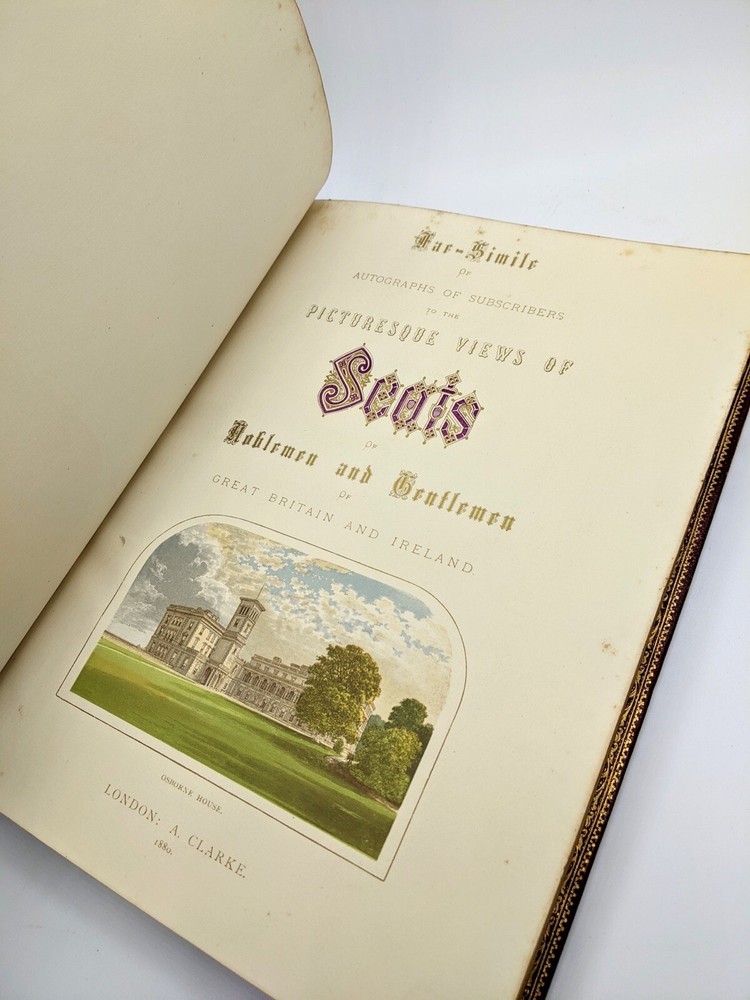 1880 Antique Book The Front Cover Title : Facsimile of Autographs County Seats of the Noblemen & Gentlemen of Great Britain & Ireland The Spine Title : Facsimile of Autographs of Subscribers to County Seats The inside Title Page : Fac-Simile of Autographs of Subscribers to the Picturesque Views of SCOTS of Noblemen and Gentlemen of Great Britain and Ireland Osborne House London : A. Clarke 1880 The Second Page : Fac-Simile of Autographs of Subscribers to “ Notable & Picturesque Seats of the Nobility & Gentry of Great Britain & Ireland” Many names of dukes, marquises, earls,viscounts, lords, honorable, foreigners of distinction, ladies of rank, baronets and knights, members of parliament. Also more names and addresses. Great reference book for history and ancestry Gilded Edges Red Leather Embossed Golden Crest featuring a Crowned Lion & an Unicorn 5 Golden Crowns on the Spine General wear and tear, scuffs on the many corners and the edges, many stains on the edges of the pages due to the age No rips, No writings THE BINDING IS INTACT Please enlarge all pictures to check any flaws you might not like Great Gift for Thanksgiving Christmas Holiday New Year’s Eve New Year’s Day Valentine’s Day Mother’s Day Father’s Day Birthday Anniversary Family Gathering Kids Children From smoke free pet free home * The Stand(s) Not Included * #58xx