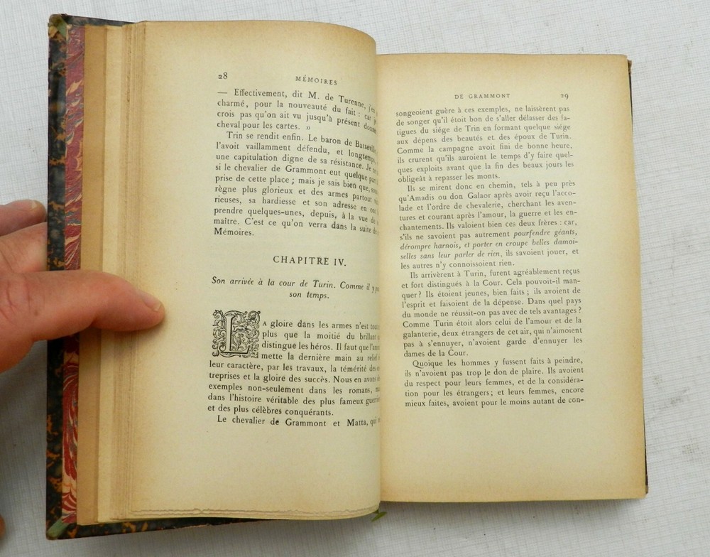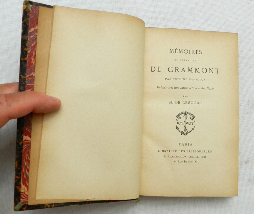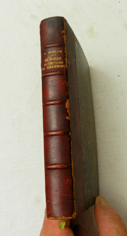 FULLY IN FRENCH. Titled and Subtitled, as translated, Memoires Du Chevalier De Grammont By Antoine Hamilton Published With an Introduction and Notes by M. de Lescure. No date of publication shown, but others have shown comparable copies in the 1880 range. One listed did show the same title page but a date of 1876 in Roman Numerals below the publisher line. Published by Librairie Des Bibliophiles, E. Flammarion, Successeur. Half leather with five bands on spine, gilt spine letters, marble boards with moderate to heavy corner wear, light to moderate wear where boards meet the spine. The boards do remain solidly attached. There are marble endpapers, gilt page tops, light green page marker ribbon, no interior marks in 364 clean and solidly bound pages, with light age-toning around the page edges. On the author and this book from Wikipedia: "Antoine (or Anthony) Hamilton, comte (c. 1645 – 1719) was a soldier and a writer of literature. As a Catholic of Irish and Scottish ancestry, he fled with his family to France during the Interregnum and later sided with James II against the Prince of Orange, which led him into another French exile. As a soldier he fought in French service in the Franco-Dutch War (1672–1678) and then in the Irish Army in the Williamite War (1688–1690) where he fought on the losing side in the battles of Newtownbutler and the Boyne. As a writer he chose French as his language and adopted a light and elegant style, seeking to amuse and entertain his reader. He is mainly known for the Mémoires du comte de Grammont, which tell about the time his brother-in-law Philibert, comte de Gramont, spent at the court of Charles II at Whitehall." B33