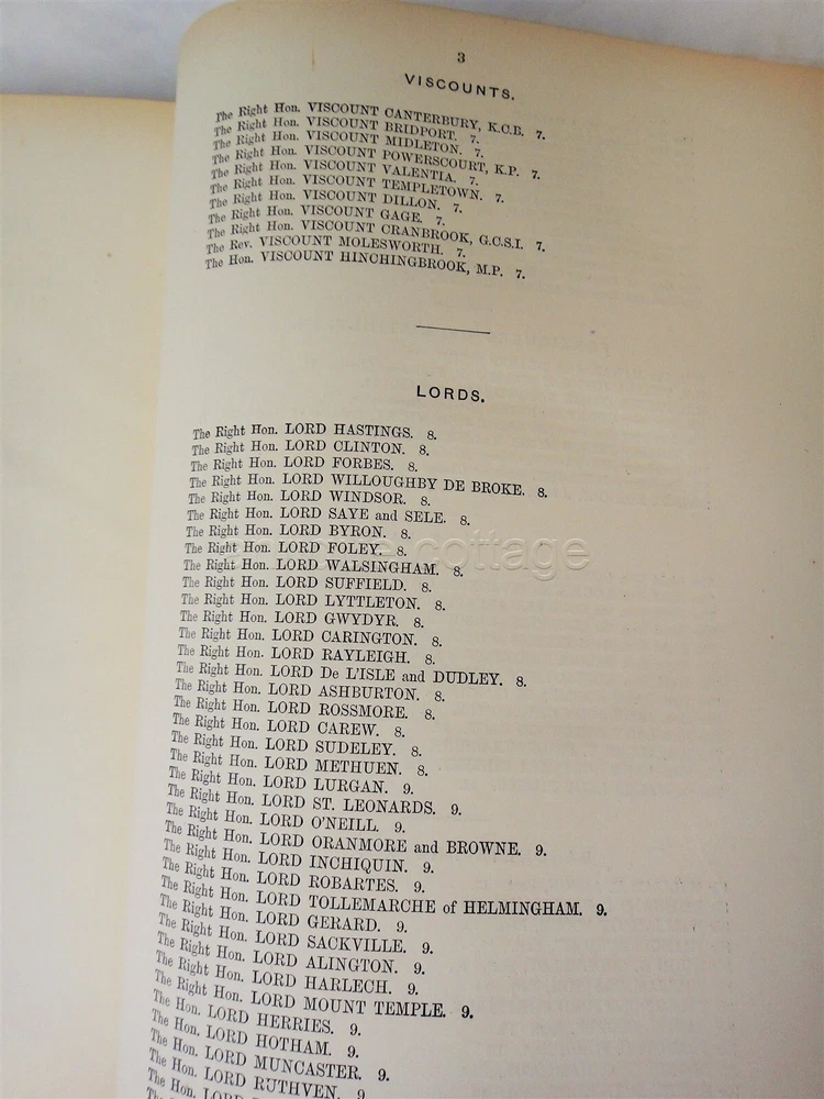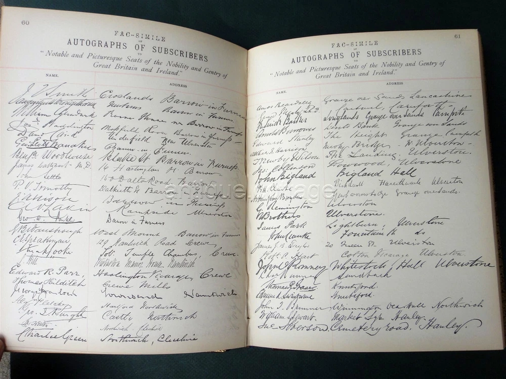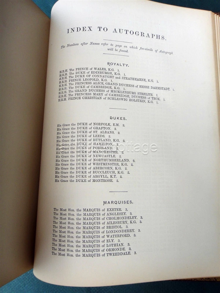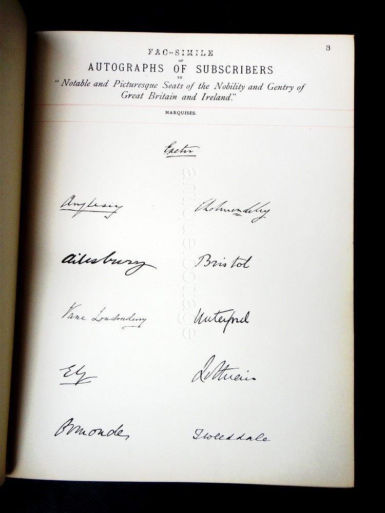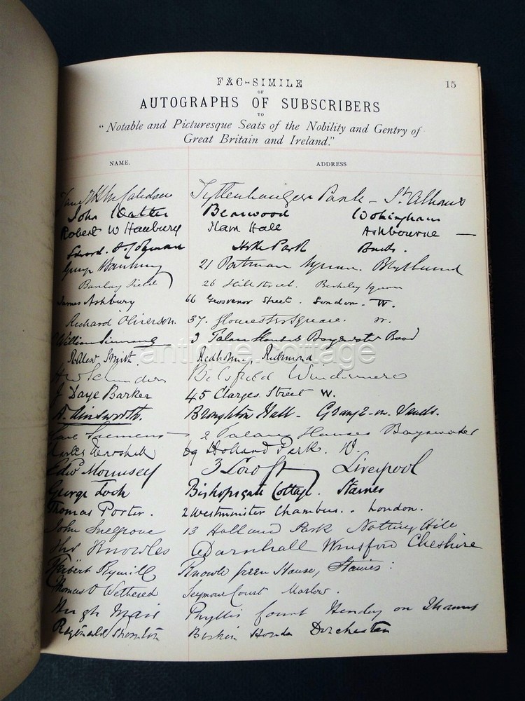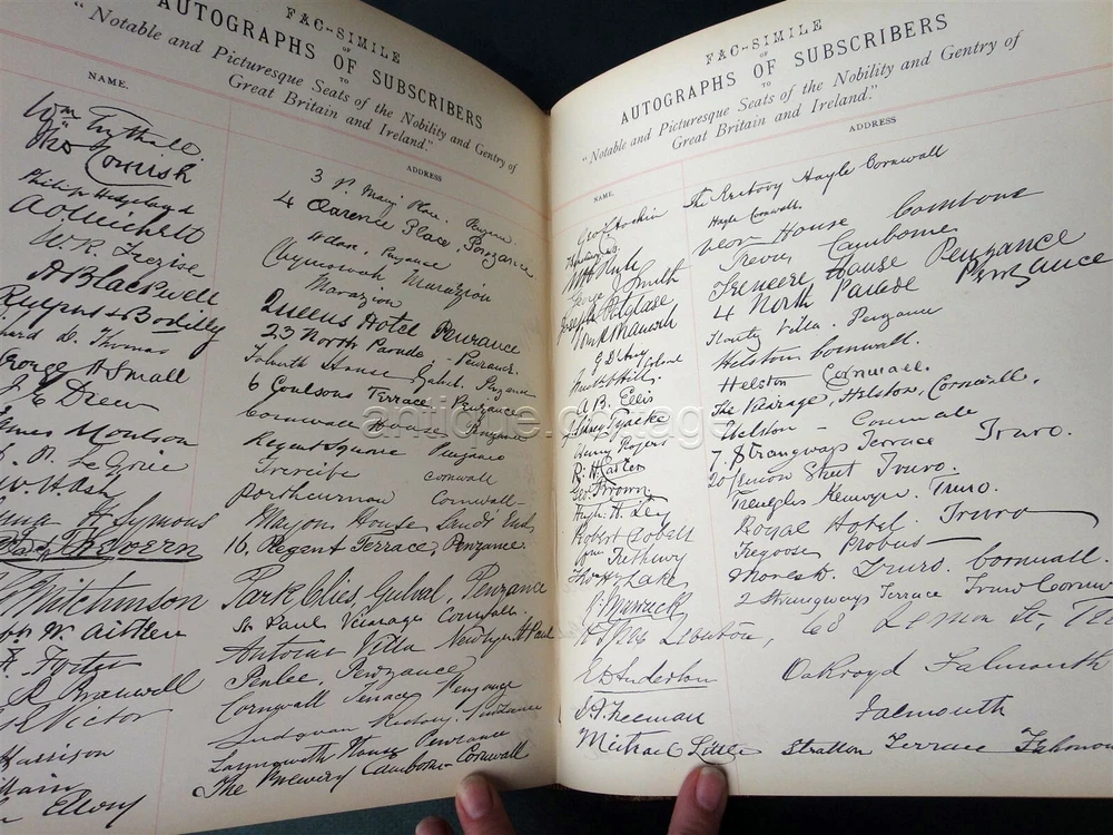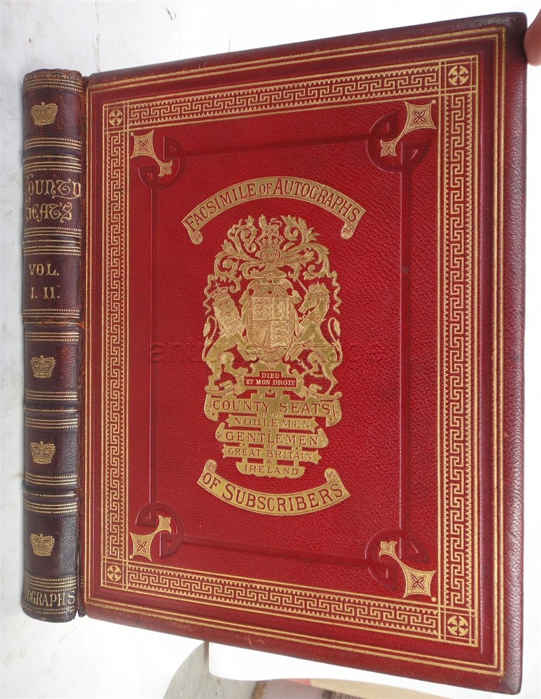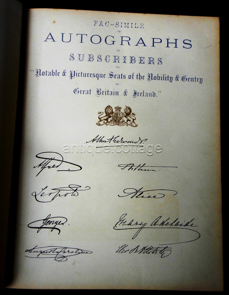 1880 antique COUNTY SEATS NOBLEMEN GENTLEMEN Great Britian Ireland AUTOGRAPHS SCROLL DOWN for MORE PHOTOS in DESCRIPTION Click HERE to view or search ANTIQUE.COTTAGE listings. 1880 antique COUNTY SEATS NOBLEMEN GENTLEMEN Great Britian Ireland AUTOGRAPHS This listing is for the leather covered book shown. FACSIMILE of AUTOGRAPHS of SUBSCRIBERS The book retains it's shiny gold 3 edges. Some light antique wear. The pages are overall clean and secure. Some wear to leather and some darkening as shown in our supersized photos. The spine is split, and a piece is almost detached and may detach by the time it arrives. But the full spine is included. Measures approx: 11"x9". # of Pages : 135 plus more for the index Great nobility signature reference book. CONDITION : See listing description and photos. - International buyers are responsible to pay VAT or other Taxes to their countries as required. - eBAY collects and remits sales tax on behalf of several states. If you are a dealer, you can write to eBay to file a form to become tax exempt. LOC: LOC2: BOOKSHELF05-TM Powered by SixBit's eCommerce Solution