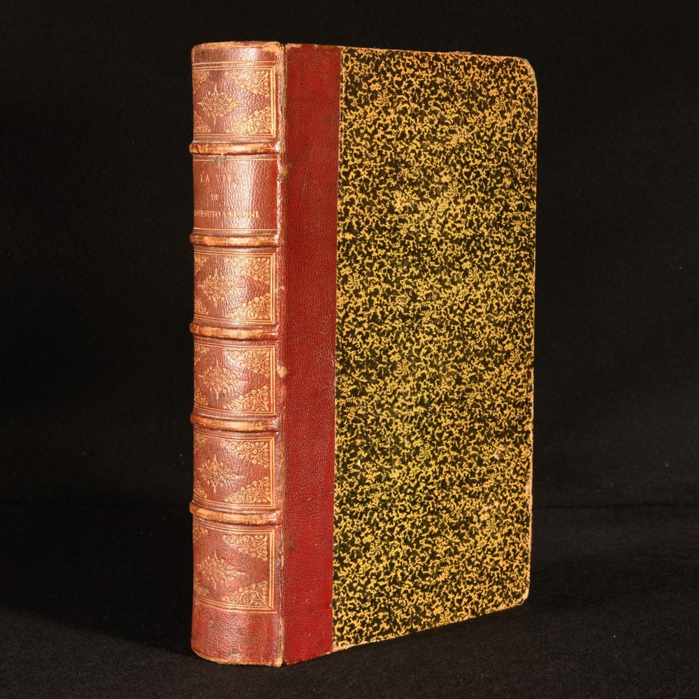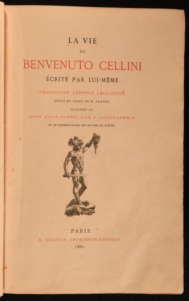 Click here to see our other books! La Vie de Benvenuto Cellini Benvenuto Cellini; Leopold Leclanche 1881 A. Quatin : Paris 10" by 7" [4], 624, [3pp] SUMMARY A French edition of this important autobiography on the life of sixteenth century artist Benvenuto Cellini. Illustrated,Leather Binding Overall Condition: Good This book weighs 2 KG when packed UK Postage: £ 3.99 US Postage: £ 29.99 EU Postage : £ 21.99 European Postage: £ 23.99 Asia Postage: £ 37.99 Worldwide Postage: £ 38.99 DESCRIPTION Translated into French by Leopold Leclanche, with notes and an index by M. Franco. The autobiography of the Italian goldsmith Benvenuto Cellini, the most important autobiography from the Renaissance. Cellini writes in great detail about his career and his loves and passions, writing in an energetic and racy manner. He was a talented goldsmith and sculptor, and is well known for his Cellini Salt Cellar, and the sculpture of Perseus with the Head of Medusa. Illustrated with ten plates, and head- and tail-pieces. Collated, complete. CONDITION In a quarter morocco binding with marbled paper to the boards. Externally, generally smart. Leather is little rubbed. Tear to the head of the front joint. Minor bumping to the extremities. Spine is faded. A small amount of loss of paper to the extremities. Rear hinge is starting but firm. Prior owner's ink inscription to the recto of the front endpaper. Internally, firmly bound. Pages are age-toned with scattered spots, a little heavier to the plates. Overall Condition: Good GLOSSARY OF TERMS Overall Condition (Dustwrapper condition rating is shown after that for the book itself, where a dustwrapper is present) Fine - Very well preserved copy showing very little wear Very Good Indeed - Only one or two minor faults, really a very attractive copy Very Good - Quite a wide term meaning no major faults but probably several smaller ones often expected given the age of the book, but still a respectable copy Good - Meaning not very good. Some more serious faults as will be described in the condition report under 'condition' Good Only - Meaning one or more faults that could really do with repair Fair - As with good only above but with other faults leaving a compromised copy even after repair Poor - Really bad and possibly seriously incomplete. We only sell books in this condition where their rarity or value makes them attractive none the less. Major defects will be described. GUARANTEE We offer a full money back guarantee on our descriptions. Please ask for details and conditions. We prefer PAYPAL. If you pay via PAYPAL we will post the item off the same or the next working day with the postage you have selected. Please note we cannot accept USD cheques