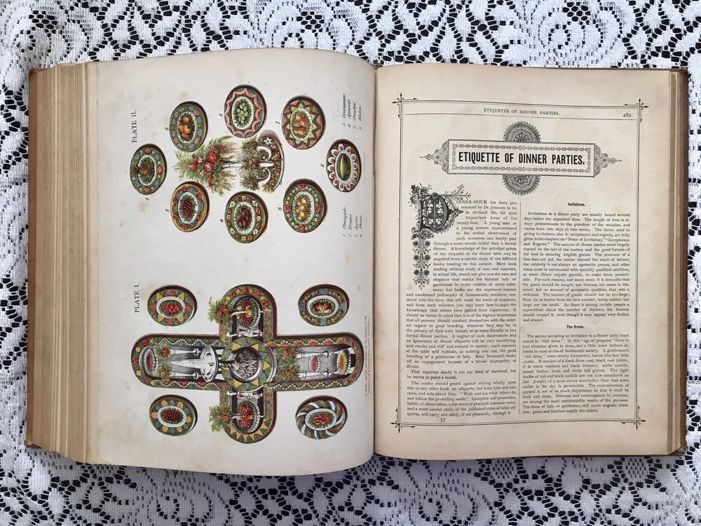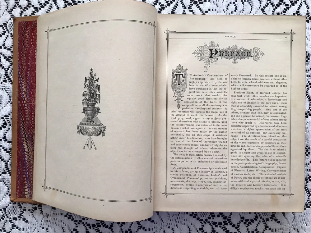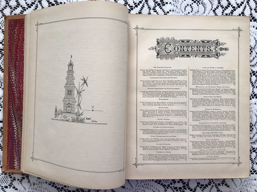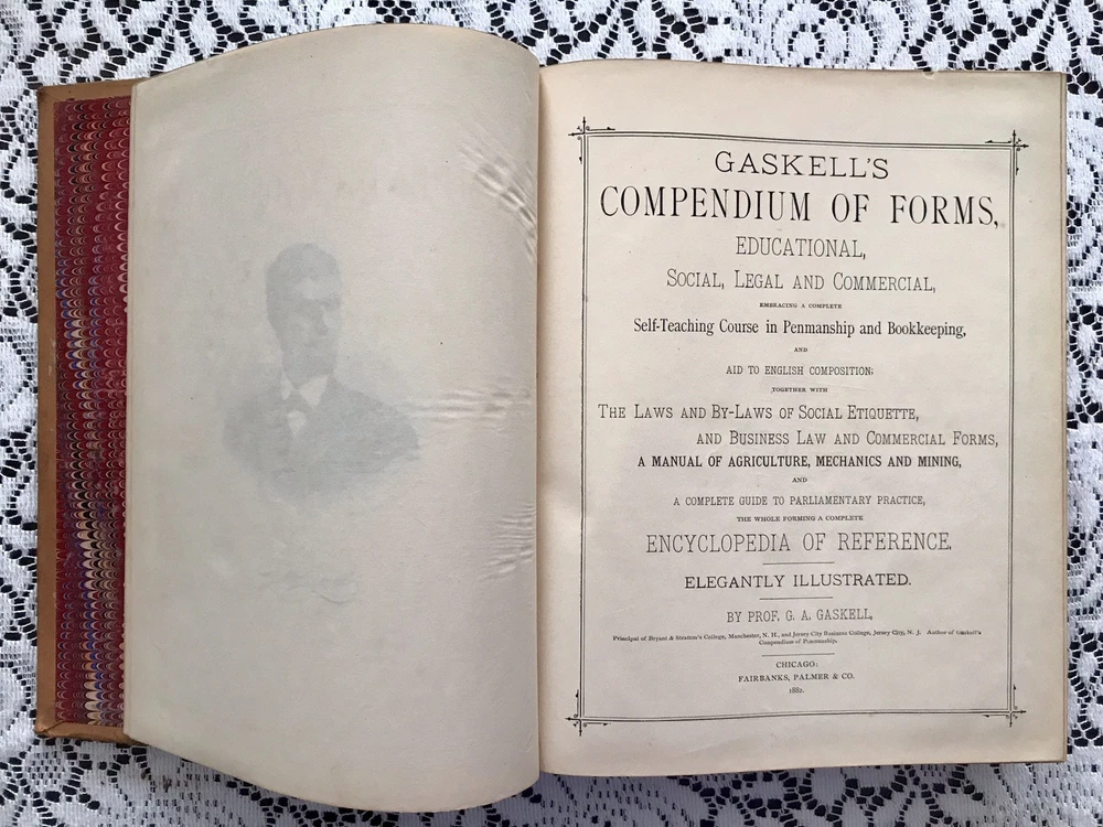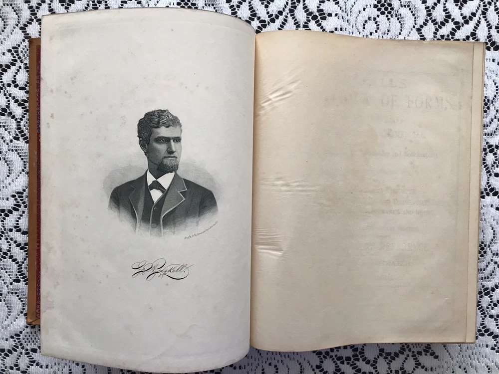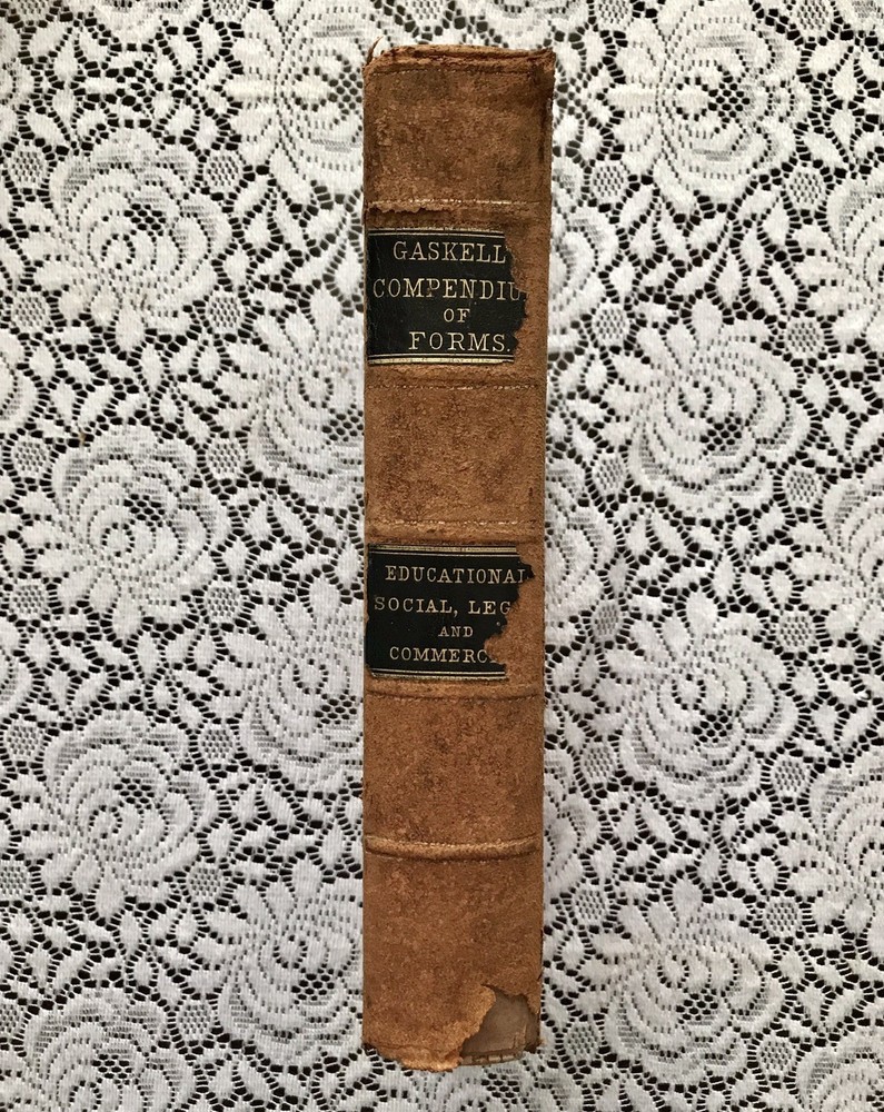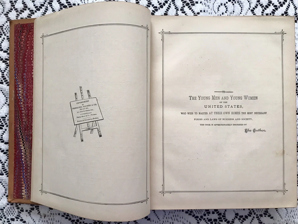 Chicago: Fairbanks, Palmer & Co., 1882. Hardcover. 586pp. Leather covered boards with gilt and black ink stamped designs on the spine. Cover in fairly good condition. The front and back covers show wear. Leather worn off on corners. Back cover has a hole. Spine Is cracked on right at top and bottom (See photos). Title stamps on spine have partially flaked off. Marbled inside sheets. Foxing / discoloration primarily on a few pages at front and back. Rest of book is in Great condition! No folds or tears. The book is sturdy. Book topic: Forms, Educational, Social, Legal and Commercial - Embracing A Complete Self-teaching Course in Penmanship and Bookkeeping, & Aid to English Composition; Together With The Laws & By-Laws of Social Etiquette, & Business Law & Commercial Forms, A Manual if Agriculture, Mechanics & Mining, & A Complete Guide to Parliamentary Practice,... Elegantly Illustrated Measurements (approx): 8.5” x 11” x 2” Weight: 5 lbs