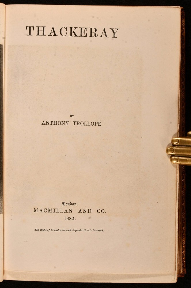Click here to see our other books! Thackeray Anthony Trollope 1882 Macmillan and Co : London 7.5" by 5" vi, [2], 210pp SUMMARY Anthony Trollope's brilliant biography on the life of popular author William Makepeace Thackeray. Illustrated,Leather Binding Overall Condition: Near Fine This book weighs 1 KG when packed UK Postage: £ 3.99 US Postage: £ 22.99 EU Postage : £ 16.99 European Postage: £ 17.99 Asia Postage: £ 22.99 Worldwide Postage: £ 28.99 DESCRIPTION A short biography of the popular Victorian author William Makepeace Thackeray. He was best known for his satirical novel 'Vanity Fair'. Illustrated with a frontispiece, and forty-eight plates. Collated, complete. Anthony Trollope was a prolific Victorian author, best known for his series 'Chronicles of Barsetshire'. Some of his other successful novels include 'The Warden', 'The Way We Live Now', 'The Eustace Diamonds', and 'Barchester Towers'. The twelfth thousand. From the library of W. A. Foyle at Beeleigh Abbey. William Foyle was the co-founder of Foyles bookshop, founding the leading bookshop in 1903 alongside his brother. He purchased Beeleigh Abbey during the Second World War, an impressive twelfth century monastery in Essex, which became home to his library, one the largest private libraries in England. CONDITION In a rebacked calf binding. Externally, smart. Light bumping to the extremities. A little light marks and rubbing to the boards. Evidence of a bookplate being formelry adhered to the front paste down. Internally, firmly bound. Pages are bright and clean with a few scattered spots. Overall Condition: Near Fine GLOSSARY OF TERMS Overall Condition (Dustwrapper condition rating is shown after that for the book itself, where a dustwrapper is present) Fine - Very well preserved copy showing very little wear Very Good Indeed - Only one or two minor faults, really a very attractive copy Very Good - Quite a wide term meaning no major faults but probably several smaller ones often expected given the age of the book, but still a respectable copy Good - Meaning not very good. Some more serious faults as will be described in the condition report under 'condition' Good Only - Meaning one or more faults that could really do with repair Fair - As with good only above but with other faults leaving a compromised copy even after repair Poor - Really bad and possibly seriously incomplete. We only sell books in this condition where their rarity or value makes them attractive none the less. Major defects will be described. GUARANTEE We offer a full money back guarantee on our descriptions. Please ask for details and conditions. We prefer PAYPAL. If you pay via PAYPAL we will post the item off the same or the next working day with the postage you have selected. Please note we cannot accept USD cheques