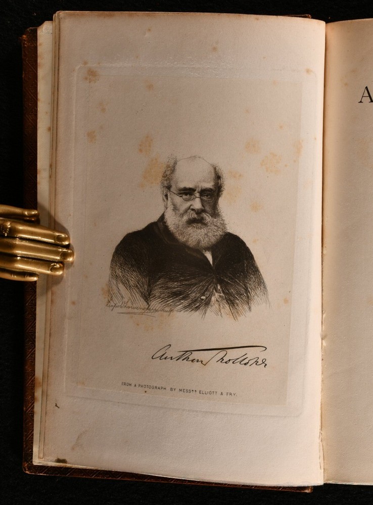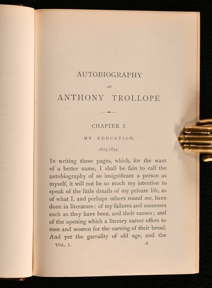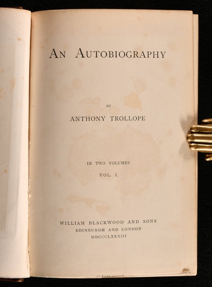 Click here to see our other books! An Autobiography Anthony Trollope 1883 William Blackwood and Sons : Edinburgh and London 8" by 5.5" xi, 227pp SUMMARY A leather bound first edition of Anthony Trollope's autobiography, complete with a frontispiece illustration of the author and bound as two volumes in one. First Edition,Leather Binding Overall Condition: Very Good This book weighs 1.5 KG when packed UK Postage: £ 3.99 US Postage: £ 23.99 EU Postage : £ 18.99 European Postage: £ 19.99 Asia Postage: £ 31.99 Worldwide Postage: £ 32.99 DESCRIPTION Anthony Trollope (1815-1882) was an English novelist, with the Chronicles of Barsetshire being his best known works, as well as 'The Warden' and 'The Way We Live Now'. His works were extremely popular during his lifetime, and remain in favour with critics. With a frontispiece illustration of the author. A first edition. Two volumes bound as one. With the gilt stamp of Mason University College, a university college in Birmingham, England founded by Sir Josiah Mason. CONDITION In a full calf binding. Externally generally smrta, with the spine a little rubbed resulting in slight loss to the leather. Internally, firmly bound. Pages are bright and clean. Overall Condition: Very Good GLOSSARY OF TERMS Overall Condition (Dustwrapper condition rating is shown after that for the book itself, where a dustwrapper is present) Fine - Very well preserved copy showing very little wear Very Good Indeed - Only one or two minor faults, really a very attractive copy Very Good - Quite a wide term meaning no major faults but probably several smaller ones often expected given the age of the book, but still a respectable copy Good - Meaning not very good. Some more serious faults as will be described in the condition report under 'condition' Good Only - Meaning one or more faults that could really do with repair Fair - As with good only above but with other faults leaving a compromised copy even after repair Poor - Really bad and possibly seriously incomplete. We only sell books in this condition where their rarity or value makes them attractive none the less. Major defects will be described. GUARANTEE We offer a full money back guarantee on our descriptions. Please ask for details and conditions. We prefer PAYPAL. If you pay via PAYPAL we will post the item off the same or the next working day with the postage you have selected. Please note we cannot accept USD cheques