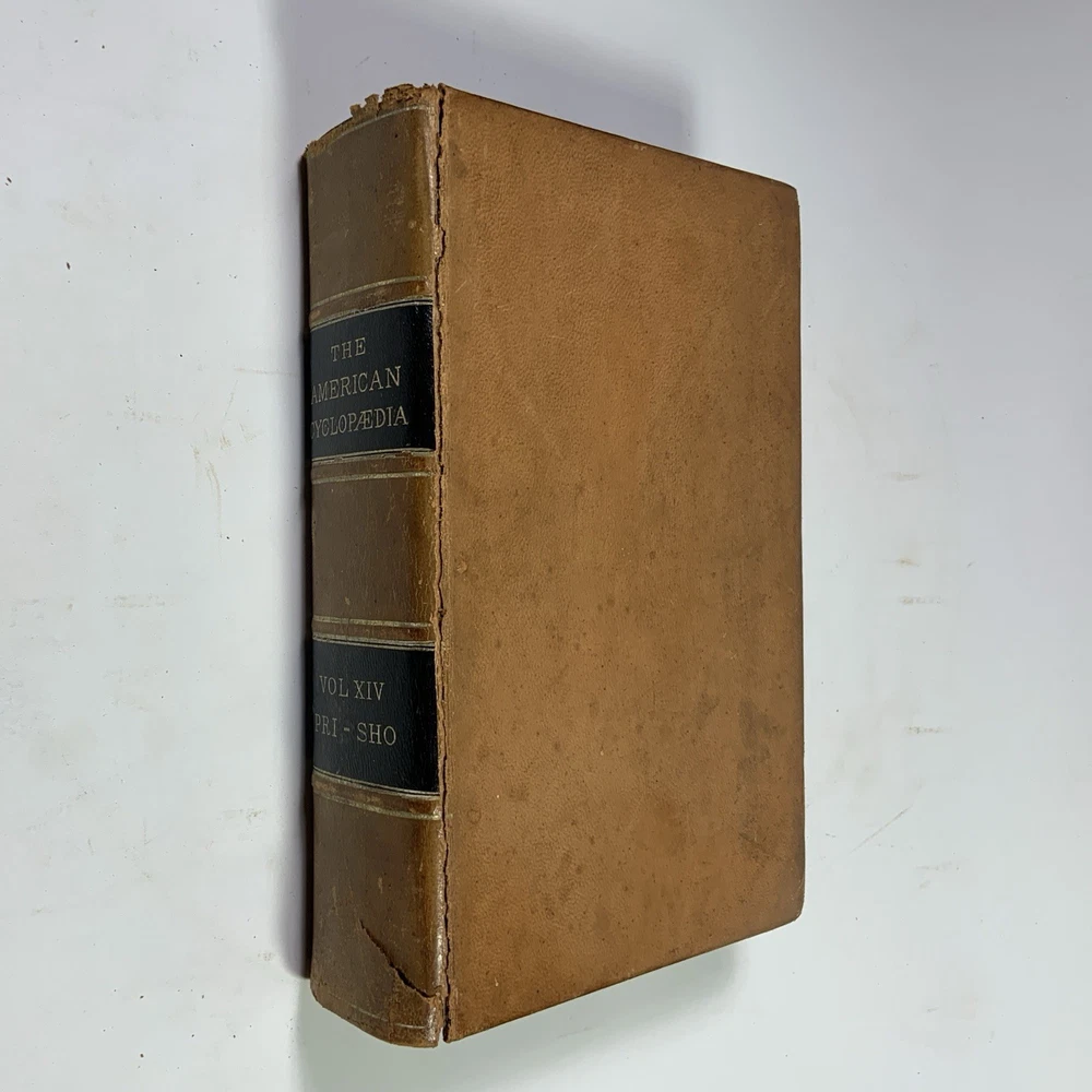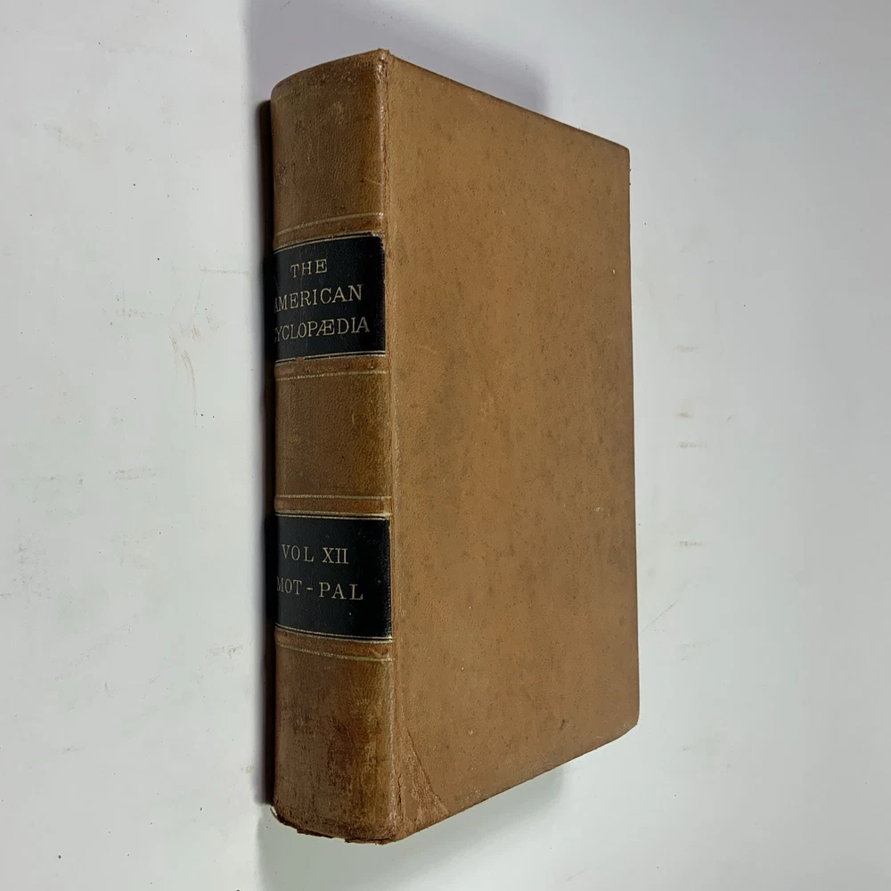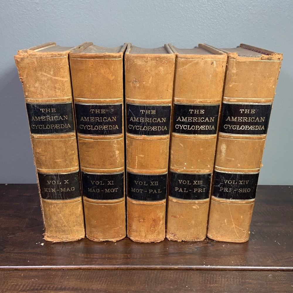 This is a partial set of The American Cyclopaedia , volumes X through XIV, published by D. Appleton & Co. The set includes: Volume X (1883) Volume XI (1883) Volume XII (1883) Volume XIII (1883) Volume XIV (1883) All volumes are original 19th-century editions, leather-bound with marbled page edges. Condition: The leather covers show typical wear for their age, including corner and edge damage, surface peeling, and some splitting along the spine joints. Some volumes have noticeable splitting and should be handled with care, though all covers remain attached. Page edges also show discoloration and wear from age and handling. Inside, the pages are aged but in good, readable condition. Most are unmarked, though some volumes may contain prior owner notations such as pricing, acquisition dates, names, or dates completed. A solid partial set for collectors, historical research, or period decor. Please feel free to message with questions or additional photos. Free shipping via Fed Ex within the continental U.S. only. The American Cyclopaedia, D. Appleton, antique encyclopedia, Victorian reference books, leather-bound books, partial set 1800s, collectible history, vintage nonfiction, historical library decor