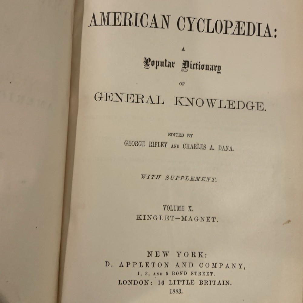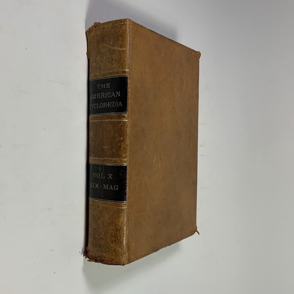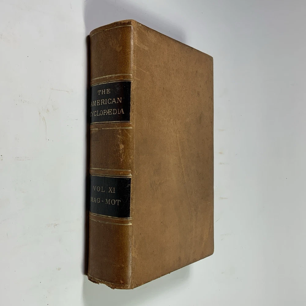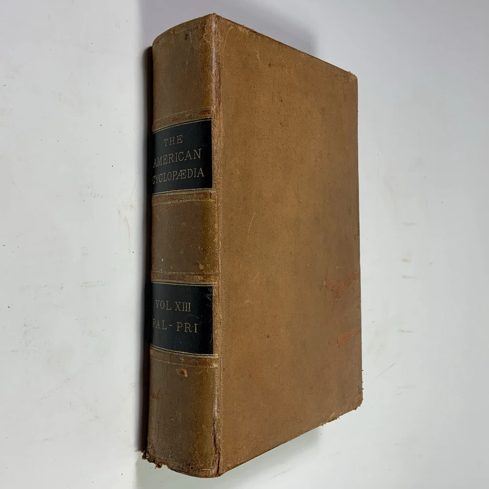 This is a partial set of The American Cyclopaedia , volumes X through XIV, published by D. Appleton & Co. The set includes: Volume X (1883) Volume XI (1883) Volume XII (1883) Volume XIII (1883) Volume XIV (1883) All volumes are original 19th-century editions, leather-bound with marbled page edges. Condition: The leather covers show typical wear for their age, including corner and edge damage, surface peeling, and some splitting along the spine joints. Some volumes have noticeable splitting and should be handled with care, though all covers remain attached. Page edges also show discoloration and wear from age and handling. Inside, the pages are aged but in good, readable condition. Most are unmarked, though some volumes may contain prior owner notations such as pricing, acquisition dates, names, or dates completed. A solid partial set for collectors, historical research, or period decor. Please feel free to message with questions or additional photos. Free shipping via Fed Ex within the continental U.S. only. The American Cyclopaedia, D. Appleton, antique encyclopedia, Victorian reference books, leather-bound books, partial set 1800s, collectible history, vintage nonfiction, historical library decor