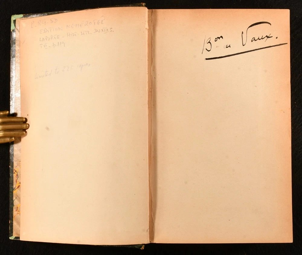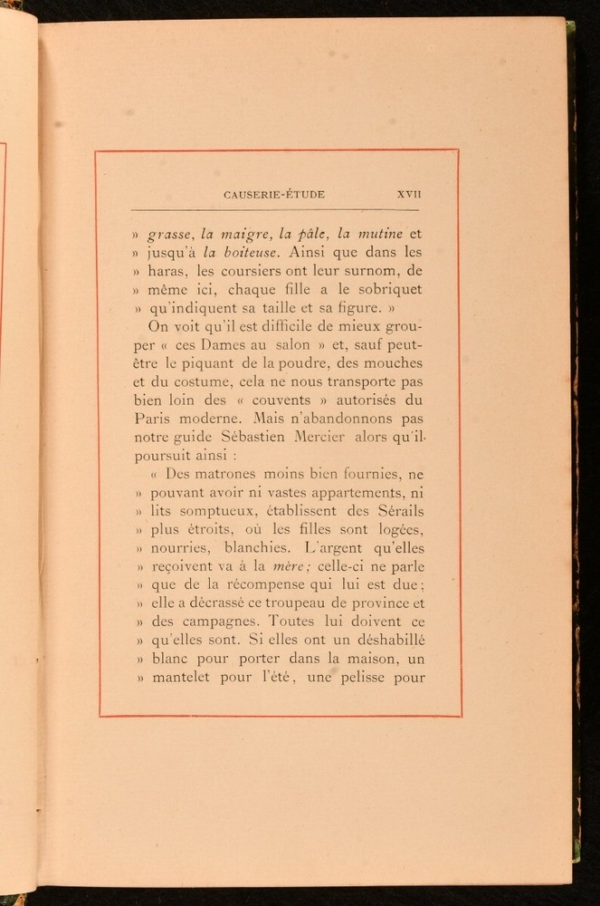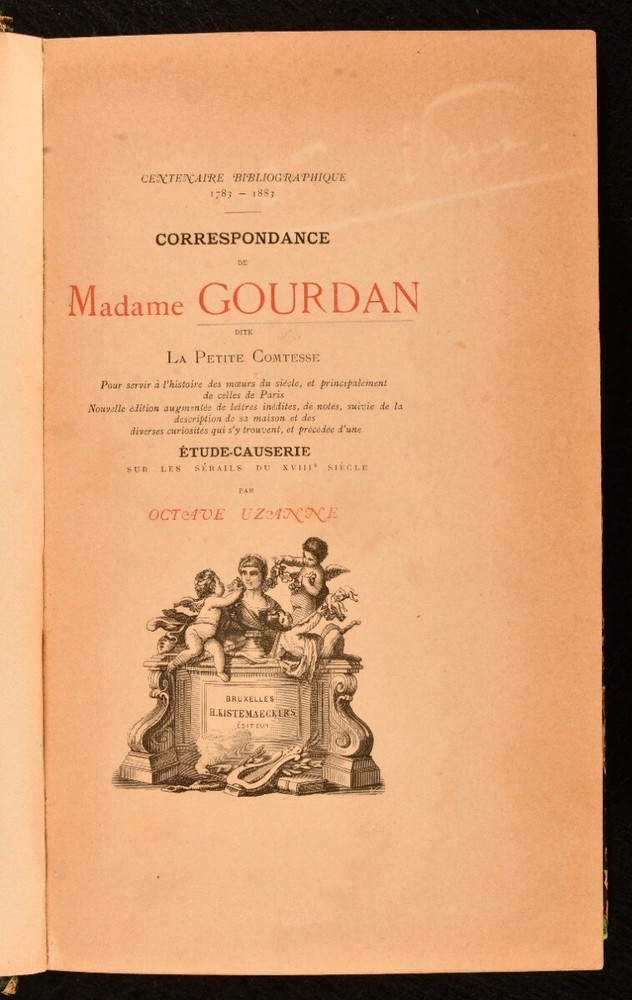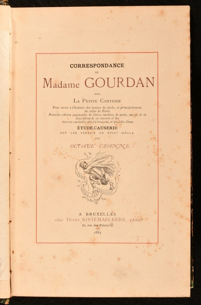 Click here to see our other books! Correspondance de Madame Gourdan dite La Petite Comtesse Octave Uzanne 1883 Henry Kistemaeckers : Brussels 8.5" by 5" [6], lviii, [5], 6-277, [1]pp SUMMARY A new edition copy in French of Correspondance de Madame Gourdan. Leather Binding Overall Condition: Very Good This book weighs 1.5 KG when packed UK Postage: £ 3.99 US Postage: £ 23.99 EU Postage : £ 18.99 European Postage: £ 19.99 Asia Postage: £ 31.99 Worldwide Postage: £ 32.99 DESCRIPTION A new edition. In the original French. Limited to 777 copies. With the original paper wraps bound to the front and rear of the volume. This volume contains the correspondence of Madame Gourdan, who gained the nickname of the Little Countess as the owner of an exclusive French brothel. this new edition has been expanded with unpublished letters and notes. Written by Octave Uzanne. With a frontispiece. CONDITION In quarter morocco with marbled boards. Externally, smart with rubbing to the extremities and spine and with marks to the boards. The hinges are starting but remain firm. Previous owner inscriptions to the reverse of the title page and next page. Internally, firmly bound with generally bright pages with some spotting to the odd page. Overall Condition: Very Good GLOSSARY OF TERMS Overall Condition (Dustwrapper condition rating is shown after that for the book itself, where a dustwrapper is present) Fine - Very well preserved copy showing very little wear Very Good Indeed - Only one or two minor faults, really a very attractive copy Very Good - Quite a wide term meaning no major faults but probably several smaller ones often expected given the age of the book, but still a respectable copy Good - Meaning not very good. Some more serious faults as will be described in the condition report under 'condition' Good Only - Meaning one or more faults that could really do with repair Fair - As with good only above but with other faults leaving a compromised copy even after repair Poor - Really bad and possibly seriously incomplete. We only sell books in this condition where their rarity or value makes them attractive none the less. Major defects will be described. GUARANTEE We offer a full money back guarantee on our descriptions. Please ask for details and conditions. We prefer PAYPAL. If you pay via PAYPAL we will post the item off the same or the next working day with the postage you have selected. Please note we cannot accept USD cheques