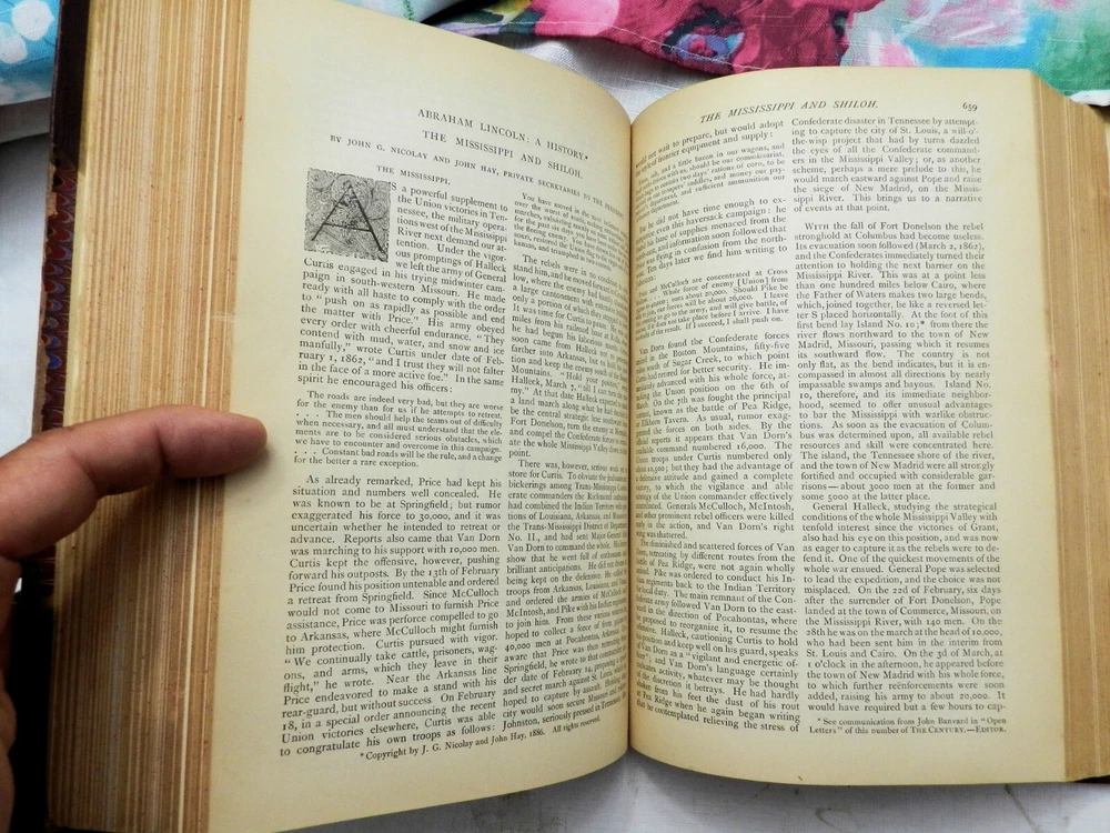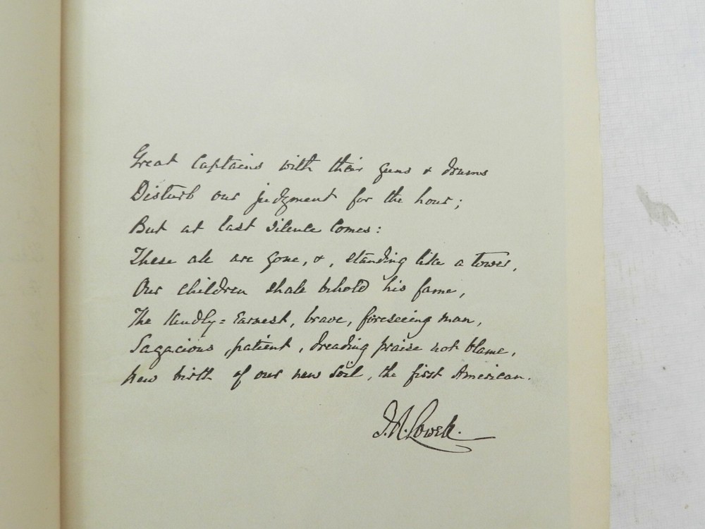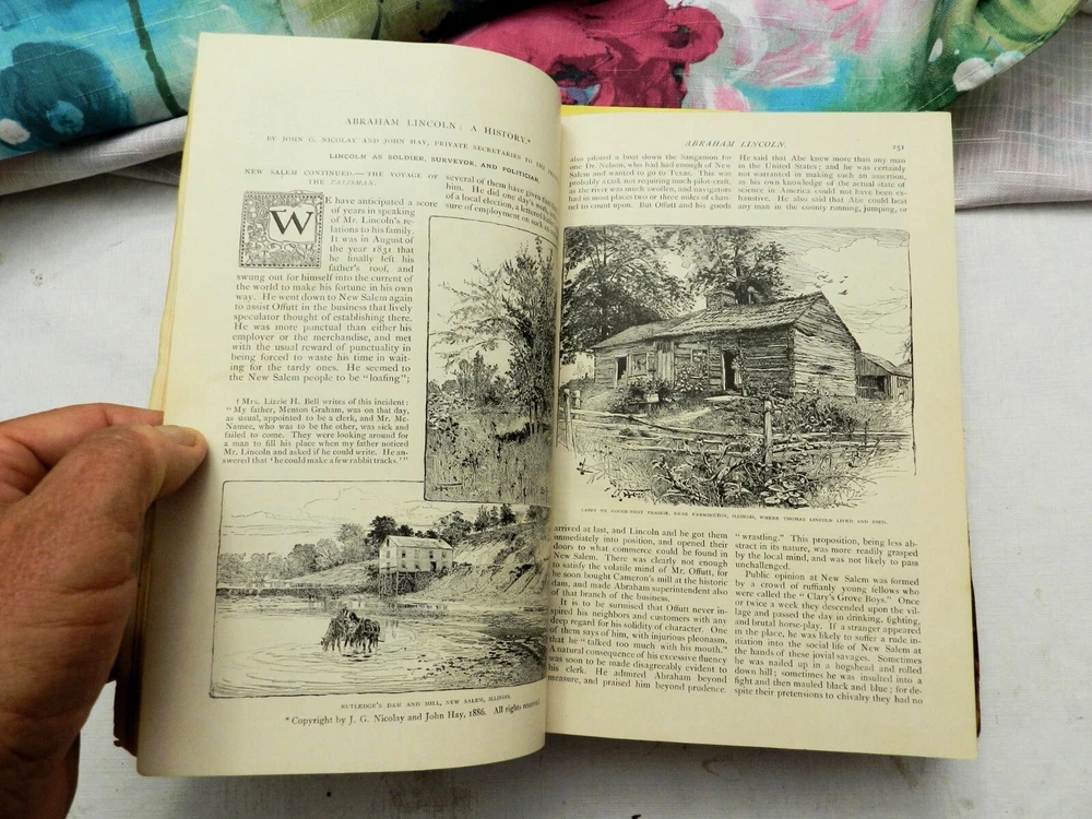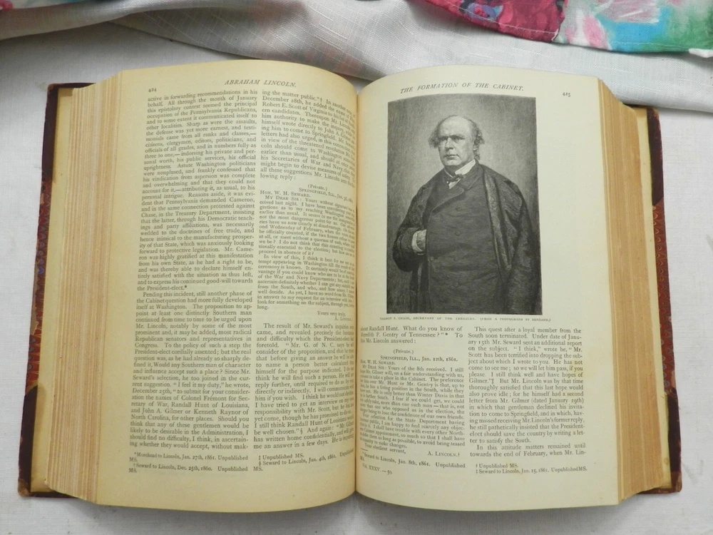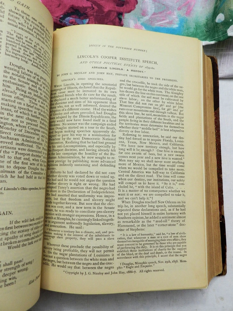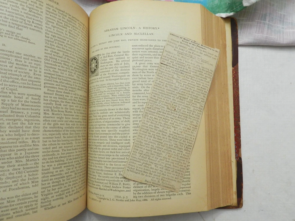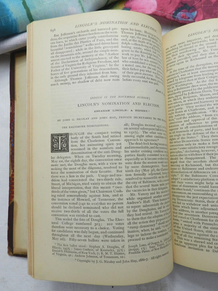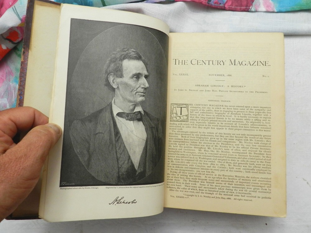 ULTRA RARE, LIKELY ONE OF A KIND, COMPILATION OF ORIGINAL ARTICLES WHICH APPEARED IN THE CENTURY MAGAZINE BETWEEN 1883 AND 1890 AUTHORED BY NICOLAY AND HAY ON THE LIFE OF LINCOLN. John Nicolay and John Hay were President Lincoln's private secretaries. These two individuals were provided the private papers of Abraham Lincoln and from them, and other materials, produced a series of articles on the life of Abraham Lincoln which were published between 1883 and 1889 in The Century Magazine. The volume of The Century Magazine in 1883 in which the first article appeared was Vol 33, and the final article by the pair was in Vol 39, published in 1889. In 1890, The Century Magazine produced a coveted 10-Vol bound set of the original magazines which contained each magazine published between 1883 and 1889 which included all the Nicolay and Hay articles, and of course a treasure trove of other articles which appeared in the magazines. I have been unable to find the particular single volume which is offered in this listing. These are original Nicolay and Hay Century Magazine articles alone in this time frame. I can't claim this is the complete set of the Nicolay and Hay articles - it may just be an important subset collected by an individual for this privately bound collection. There is the single title page which includes the title, Life of Lincoln, the identification of the two authors, and the private binder Geo. E. Williams of Washington DC. It also notes the year of publication, 1892, on the title page. The next page is a facsimile of a handwritten poem, presumably about President Lincoln. Then the articles begin. A listing photo shows the Lincoln portrait and the Preface to this entire serialized series, titled, Abraham Lincoln : A History. The very last Nicolay and Hay article is from Vol 39, p. 561, titled, "The Capture of Jefferson Davis - The End of Rebellion - Lincoln's Fame". The book ends with 3 articles which appeared after this last article, and are not authored by Nicolay and Hay. They are: Vol 39, p. 586, titled, Pursuit and Capture of Jefferson Davis by I. The Commander of the Union Cavalry (article ended with the name of this commander presumably, James Harrison Wilson), II - By An Eye-Witness (ending with the name, Wm. P. Stedman) Vol 40, p. 305-311, Memoranda on the Life of Lincoln Vol 40, p. 371-382, Greeley's Estimate of Lincoln, An Unpublished Address by Horace Greeley. Obviously, I have not done any compilation of all the articles in this collection - there may be others also not authored by Nicolay and Hay such as these last three. Listing photos show examples of title pages of Nicolay and Hay articles, some interesting pages that includes parts of the articles but also back sides of the leaf with curious pieces. Found in the flip-through is a newspaper articles pertaining to one of the articles by Nicolas Hay. It is included with the book. The book was found with front and rear boards fully detached but the spine and text block were very solid and clean. The boards were reattached and the leather refurbished and sealed. What results is an attractive and sturdy complete 3/4 Leather book with a compelling interior! The boards now show light to moderate corner and edge wear. The front and rear have 2 blank endpaper leaves. Here is a longer history of the work of Nicolay and Hay in Century Magazine, found online: "Abraham Lincoln: A History, by President Lincoln’s private secretaries, John Nicolay and John Hay, stands even today as the most massive single work ever written on the sixteenth president. The publication of the ten-volume set by the Century Company in 1890 gave the public the first comprehensive life based upon Lincoln’s own papers – papers that Robert Todd Lincoln made exclusively available to Nicolay and Hay. No other biographers had access to these papers until James G. Randall in 1947. The list of great Lincoln writers who did not have access to Robert’s collection includes Albert Beveridge and Carl Sandburg. The publication of the ten volumes in well-known green cloth binding did not, however, represent the first opportunity for the public to sample the work. Century Magazine, the publication that created the famous compilation, Battles and Leaders of the Civil War, published the chapters of Abraham Lincoln: A History serially during the 1880’s. By the time students of Abraham Lincoln’s life read Nicolay and Hay in 1890, they could already have read much of the story in the Century...." B113