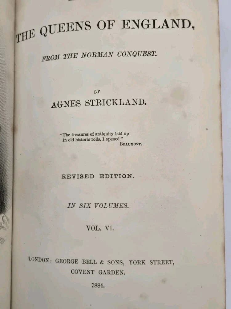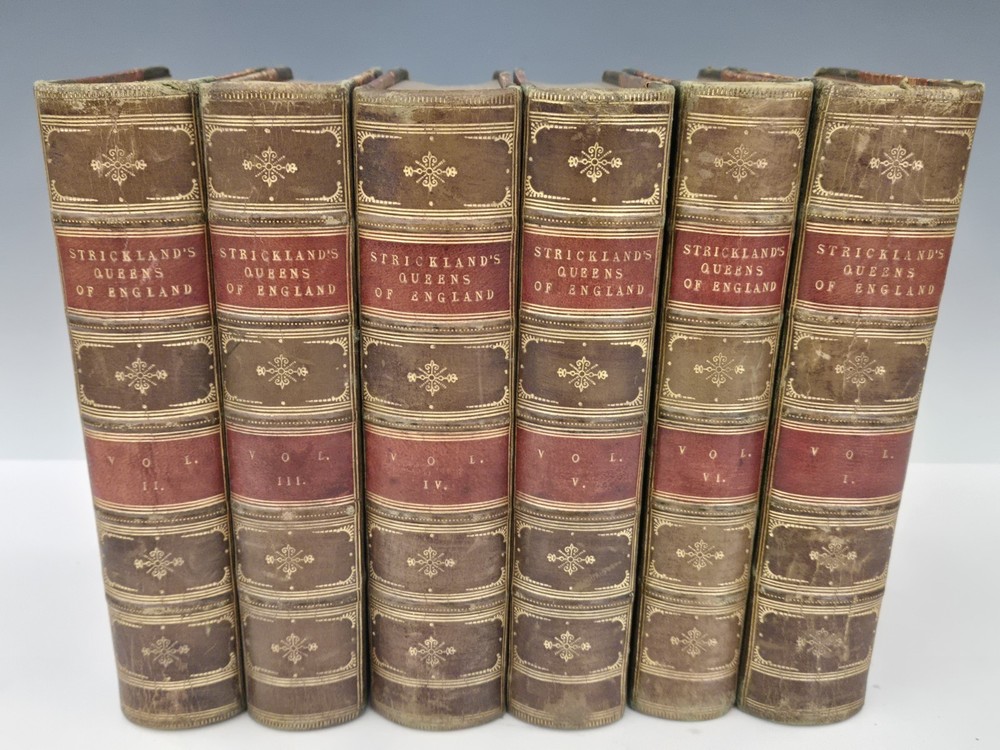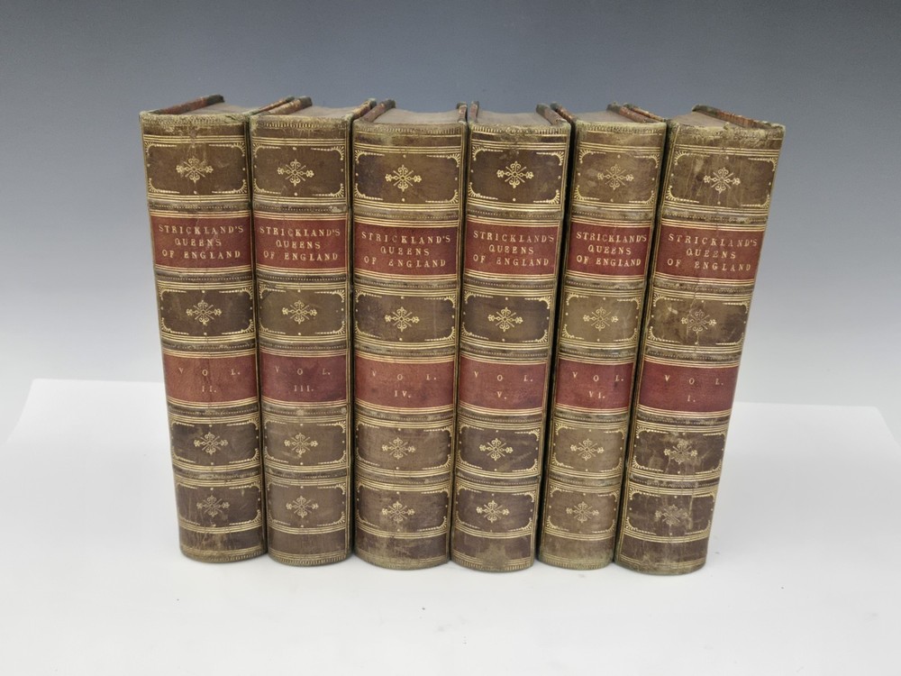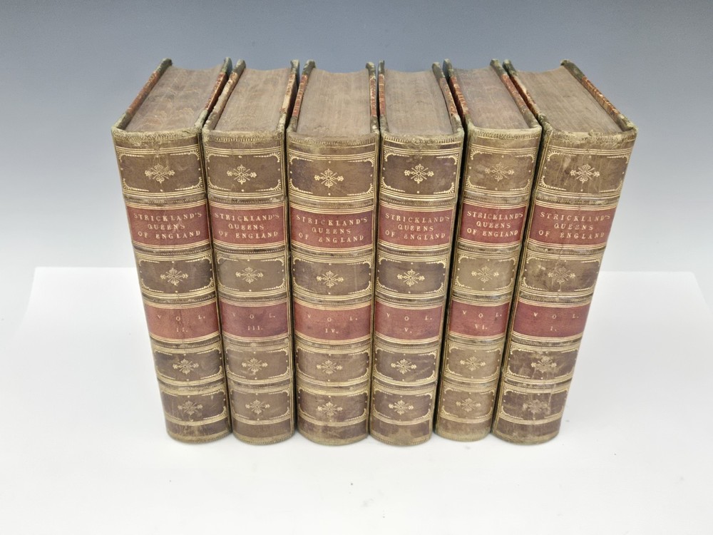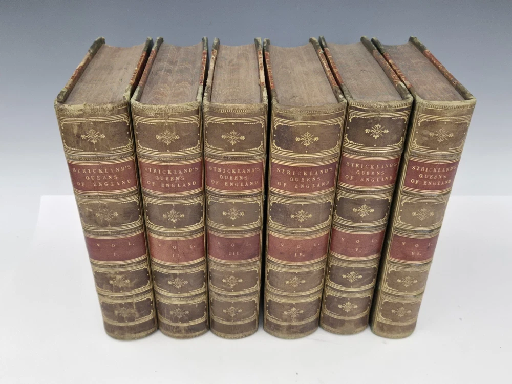 Set ....in six leather-bound volumes titled "Lives of the Queens of England" by Agnes Strickland, revised edition in 1883-84. In good antique condition as shown in photos binding still in good shape some foxing on pages not bad. Marbled boards and ANY QUESTIONS PLEASE ASK THANKS See my eBay page for more antique books... PLEASE do not bid if you are not going to complete the transaction. We reserve the right to negate any sale where the item has not been paid for in full within 10 days of the end of auction......or from any buyer who has not made contact within that time period. We fully guarantee every item that we offer.....with buyer paying return shipping if we have made an error or mis represented any item. Concerning any sales where there is duties or taxes applied by the country or state of destination for purchased item. It is the full responsibility of the purchaser to pay any and all taxes, duties, tariffs, etc……that might be imposed by the country or state of destination for item. Furthermore, we will not alter the sales amount of any item sold in order to negate taxes or duties on said item. All international bidders must email and inquire about shipping destinations and costs……before they bid. Some items offered on ebay are subject to prior sale. Some of the items offered for sale on Ebay are also for sale in our bricks and mortar store in Phila., Pa. There is chance that an item could sell in our store, before we are able to end the listing on ebay, thereby negating the ebay sale. This is a rare occurance, but is possible. Pa. residents add 6% sales tax or furnish us with valid tax exemption number. By bidding on this item you agree to the terms of sale, as we have stated them above.