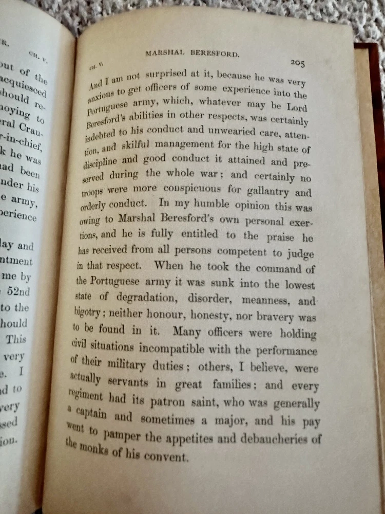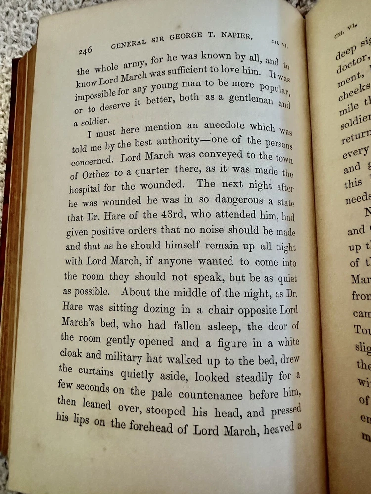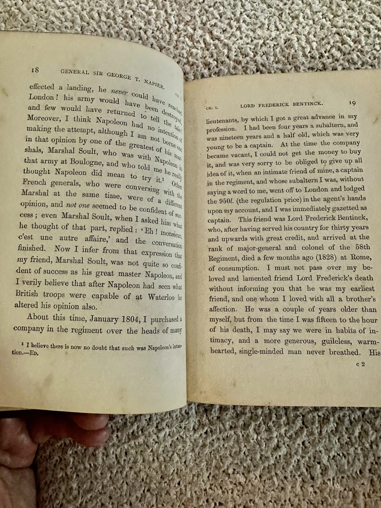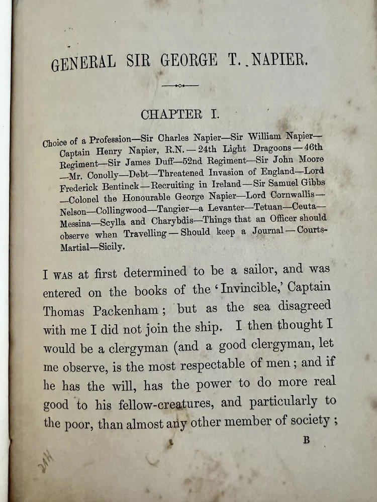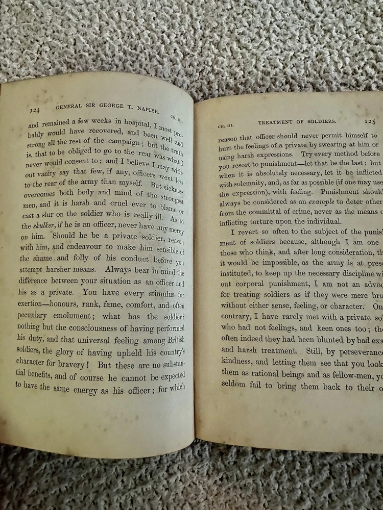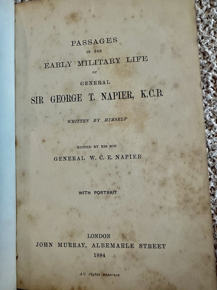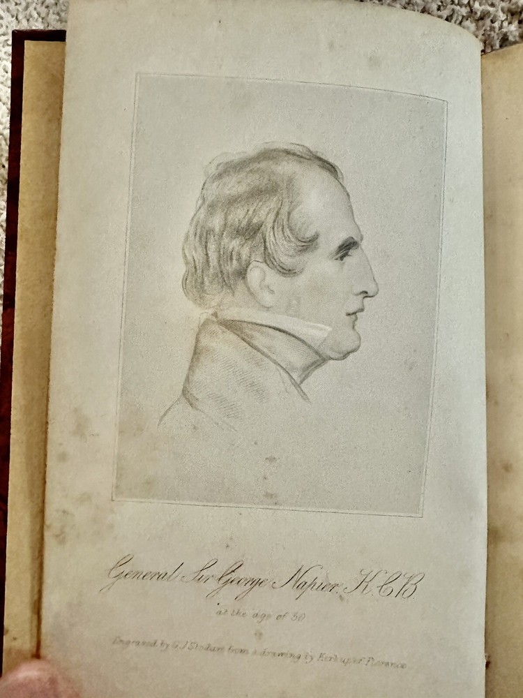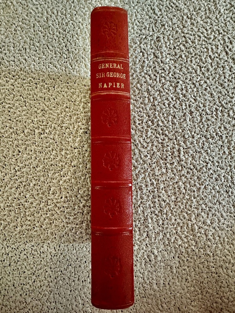 1884 First Edition Passages in the Early Military Life of Sir General George T. Napier, K.C.B. Written by Himself Edited by his son General W.C.E. Napier with Portrait (see photo) Good condition (see photos) Leather binding with red leather ribbed spine No writing Some foxing (see photos) Binding very tight (see photos) pp. 295 Dimensions: 8" x 5 1/4" x 1 1/8" Sir George Thomas Napier KCB (1784 – 1855) was a British Army officer who saw service in the Peninsular War and later commanded the army of the Cape Colony. He entered the British Army in 1800, and served with distinction under Sir John Moore and the Duke of Wellington in the Peninsula—losing his right arm at the 1812 storming of Ciudad Rodrigo,where, as a major in the 52nd Foot, he led the Light Division's storming party. He became major-general in 1837, KCB in 1838 and lieutenant-general in 1846. He was governor and Commander-In-Chief of the army in the Cape Colony from 1839 to 1843, during which time the abolition of slavery and the expulsion of the Boers from Natal were the chief events. He was offered, but declined, the chief command in India after the Battle of Chillianwalla, and also that of the Sardinian army in 1849. He became full general in 1854. He died at Geneva, Switzerland on 16 September 1855, aged 71. His autobiography, Passages in the Early Military Life of General Sir G.T. Napier, was published by his surviving son, General William Craig Emilius Napier (the author of an important work on outpost duty) in 1885. Wikipedia