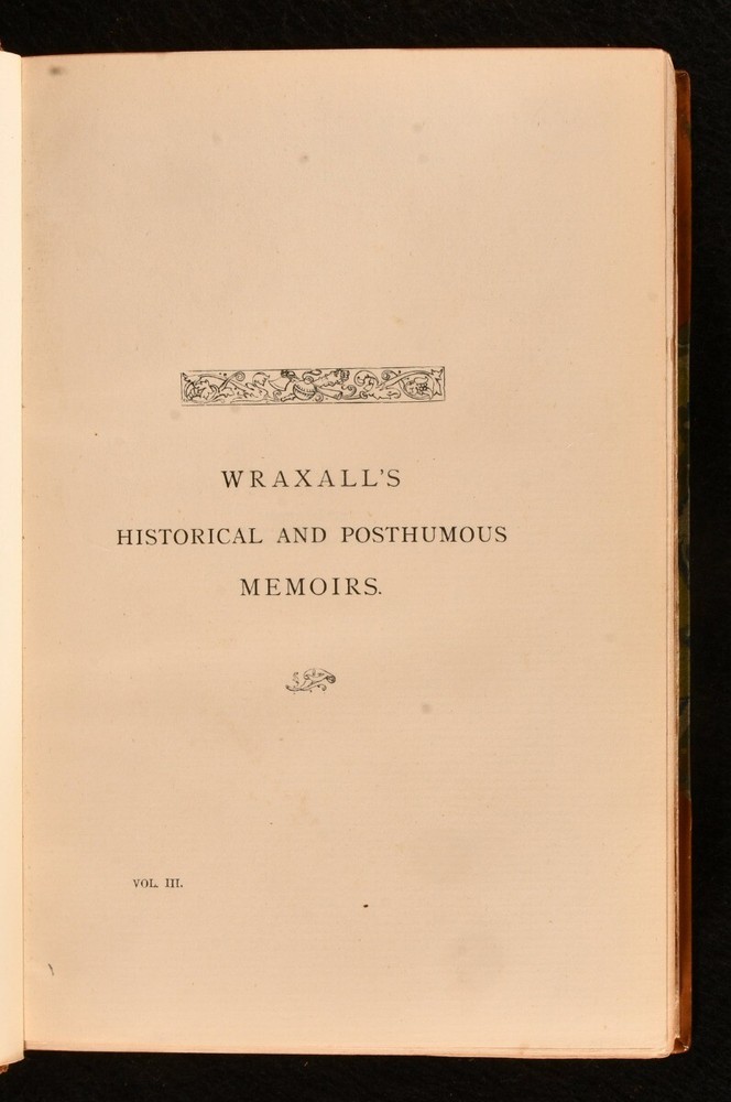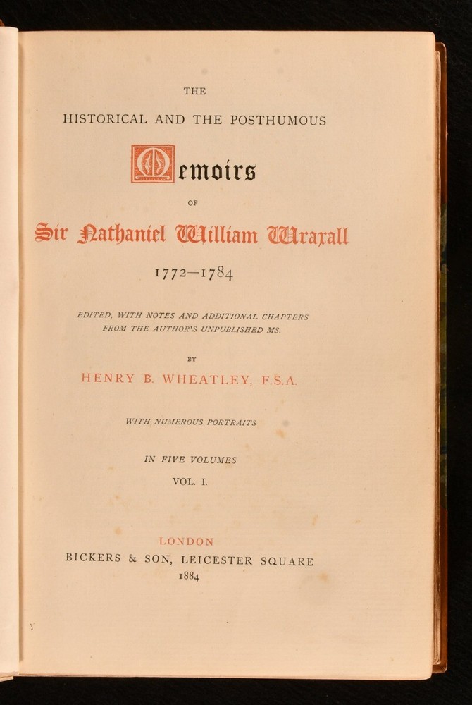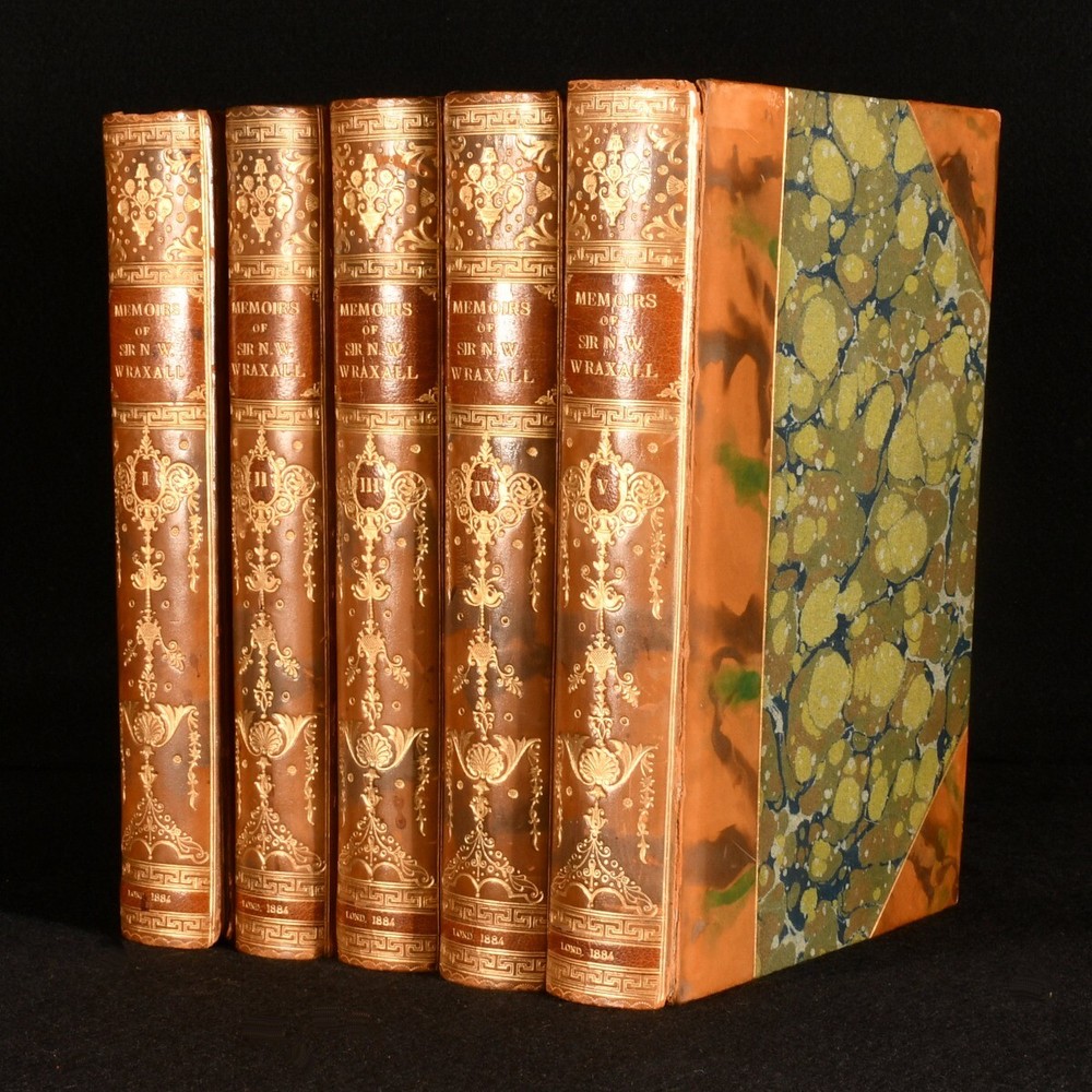 Click here to see our other books! The Historical and Posthumous Memoirs of Sir Nathaniel William Wraxall 1772-1784 Edited, with Notes and Additional Chapters From the Author's Unpublished MS. Henry B. Wheatley 1884 Bickers & Son : London 9" by 6" xxxii, 430; 448; 459; 464; 461pp. SUMMARY A handsome set of Nathaniel Wraxall's memoirs, with extra illustrations, bound in half calf by Riviere. Illustrated,Leather Binding,Rebound,Signed Binding Overall Condition: Very Good Indeed This book weighs 6 KG when packed UK Postage: £ 4.49 US Postage: £ 47.99 EU Postage : £ 28.99 European Postage: £ 49.99 Asia Postage: £ 79.99 Worldwide Postage: £ 159.99 DESCRIPTION A new edition. Complete in five volumes. With extra illustrations bound in. Uniformly bound in decorative half calf with gilt detail to the spine, by Riviere and Sons. With the publisher's original cloth front covers bound in. The memoirs, both historical and posthumous, of Sir Nathaniel William Wraxall, alongside notes by Henry B. Wheatley. Wraxall was an English author and politician, who worked for the East India Company during the expeditions against Gujarat and Bharuch. Throughout his life, he met notable people such as Queen Caroline Matilda and Count Ernst Schimmelmann. Henry B. Wheatley was a British author and editor. He is best known for his work, 'London Past and Present', which was considered a standard text for those interested in the study of London. This set comprises of: Vol. I - With a portrait frontispiece and twenty-two full page plates. Collated complete. Vol. II - With a portrait frontispiece and nine full page plates. Collated complete. Vol. III - With a portrait frontispiece and twelve full page plates. Collated complete. Vol. IV - With a portrait frontispiece and fifteen full page plates. Collated complete. Vol. V - With a portrait frontispiece and thirteen full page plates. Collated complete. Each volume has a bookplate for one, 'Walter Blake', to the front paste-down and a matching gilt stamp to the rear paste-down. The half title pages are present. CONDITION Uniformly bound in half calf by Riviere & Sons. Externally, very smart with light rubbing to the extremities. Light marks to the spine of volume one. The joints are cracked in volumes one, four and five, and strained in volumes two and three, but all are still very firm. Bookplate to the front paste-downs. Small bookseller's label to the front paste-downs. Gilt stamp to the rear paste-downs. Internally, firmly bound. Pages generally bright and clean with some age-toning to the edges and light spotting throughout. Spotting to the frontispieces. Scattered handling marks throughout. The occasional offsetting on the pages opposite plates. Mark to the plate on page 307 of volume one. Loss to the frontispiece of volume two, although this does not affect the image. Small amount of loss to the lower plate on page 81 of volume five. Overall Condition: Very Good Indeed GLOSSARY OF TERMS Overall Condition (Dustwrapper condition rating is shown after that for the book itself, where a dustwrapper is present) Fine - Very well preserved copy showing very little wear Very Good Indeed - Only one or two minor faults, really a very attractive copy Very Good - Quite a wide term meaning no major faults but probably several smaller ones often expected given the age of the book, but still a respectable copy Good - Meaning not very good. Some more serious faults as will be described in the condition report under 'condition' Good Only - Meaning one or more faults that could really do with repair Fair - As with good only above but with other faults leaving a compromised copy even after repair Poor - Really bad and possibly seriously incomplete. We only sell books in this condition where their rarity or value makes them attractive none the less. Major defects will be described. GUARANTEE We offer a full money back guarantee on our descriptions. Please ask for details and conditions. We prefer PAYPAL. If you pay via PAYPAL we will post the item off the same or the next working day with the postage you have selected. Please note we cannot accept USD cheques