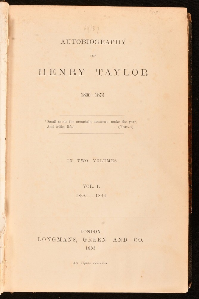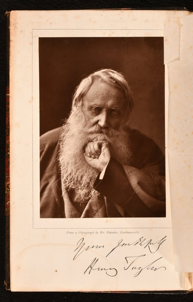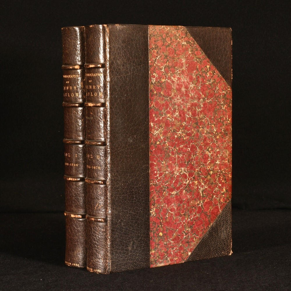 Click here to see our other books! Autobiography of Henry Taylor 1800-1875 Henry Taylor 1885 Longmans, Green, and Co. : London 9" by 6" x, 375; viii, 345pp. SUMMARY A smart first edition of English dramatist and poet, Henry Taylor's autobiography. First Edition,Leather Binding,Signed Binding Overall Condition: Very Good This book weighs 1.5 KG when packed UK Postage: £ 3.99 US Postage: £ 23.99 EU Postage : £ 18.99 European Postage: £ 19.99 Asia Postage: £ 31.99 Worldwide Postage: £ 32.99 DESCRIPTION Complete in two volumes. Fist edition. With portrait frontispiece to volume one. The autobiography of Henry Taylor, an English dramatist, poet, Colonial Office of Barbados official, and man of letters who was good friends with Robert Southey. This work explores his life from boyhood, through his appointment to the Colonial Office and the beginning of his writing career, to his travels in later life. With commentary on friends and literary acquaintances throughout his life. Bound by R. W. Smith. CONDITION Bound in half black crushed morocco with marbled boards. Externally, smart with light shelf wear and rubbing to the extremities. Light fading to the spine and the odd mark to the board. Internally, firmly bound. Pages are very bright with the odd spot to volume one and very light scattered spotting to volume two. Minor loss to the tissue guard of the frontispiece in volume one. Bound by R. W. Smith. Overall Condition: Very Good GLOSSARY OF TERMS Overall Condition (Dustwrapper condition rating is shown after that for the book itself, where a dustwrapper is present) Fine - Very well preserved copy showing very little wear Very Good Indeed - Only one or two minor faults, really a very attractive copy Very Good - Quite a wide term meaning no major faults but probably several smaller ones often expected given the age of the book, but still a respectable copy Good - Meaning not very good. Some more serious faults as will be described in the condition report under 'condition' Good Only - Meaning one or more faults that could really do with repair Fair - As with good only above but with other faults leaving a compromised copy even after repair Poor - Really bad and possibly seriously incomplete. We only sell books in this condition where their rarity or value makes them attractive none the less. Major defects will be described. GUARANTEE We offer a full money back guarantee on our descriptions. Please ask for details and conditions. We prefer PAYPAL. If you pay via PAYPAL we will post the item off the same or the next working day with the postage you have selected. Please note we cannot accept USD cheques