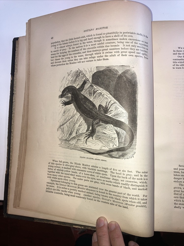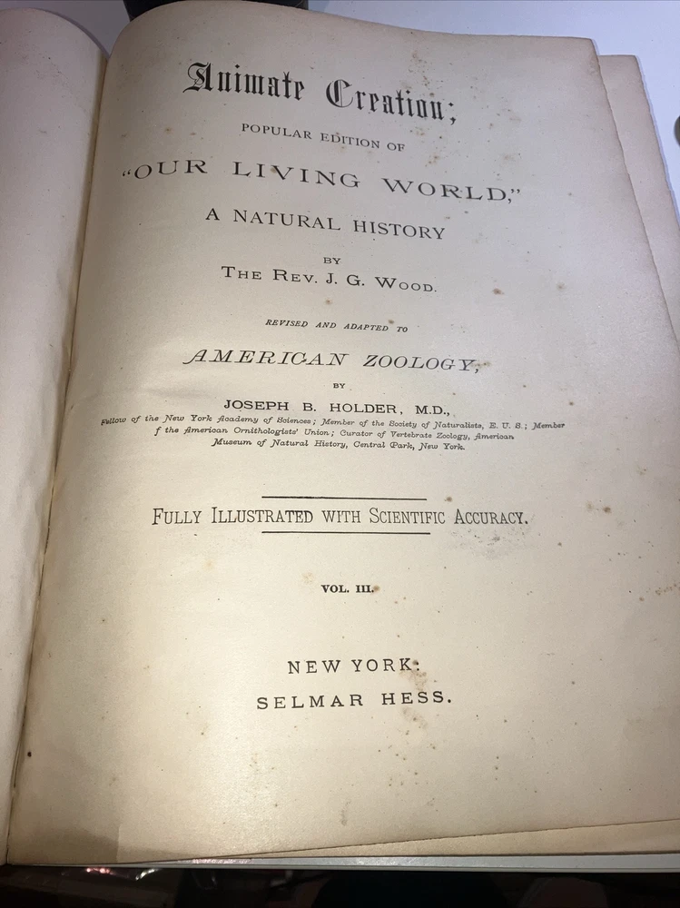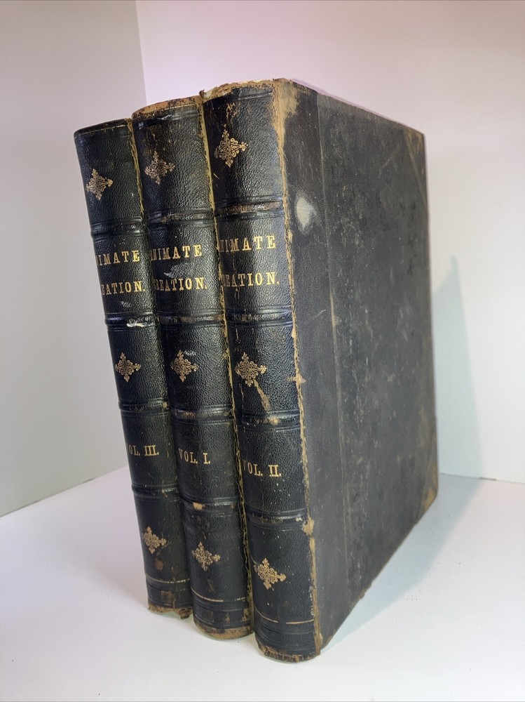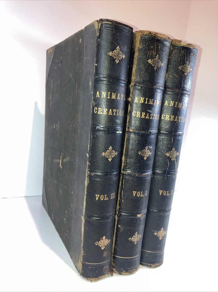 This antique book set, titled "1885 Animate Creation", is a highly sought-after collection of three volumes by Rev. J.G. Wood. The books feature beautiful chromolithographs and are bound in leather. The set was published by Selmar Hess in New York and is an original printing from 1885. The books cover a variety of topics related to North American wildlife and are written in English. This complete set is a must-have for collectors of antique books and features special attributes such as being fully illustrated. Don't miss out on the chance to own this valuable set! Covers are average for age pages are in good shape , as with the pictures are stunning , some of the tissue type paper is gently stuck to chromolithographs since it hasn’t been opened in so long or possibly ever , location 3d.
