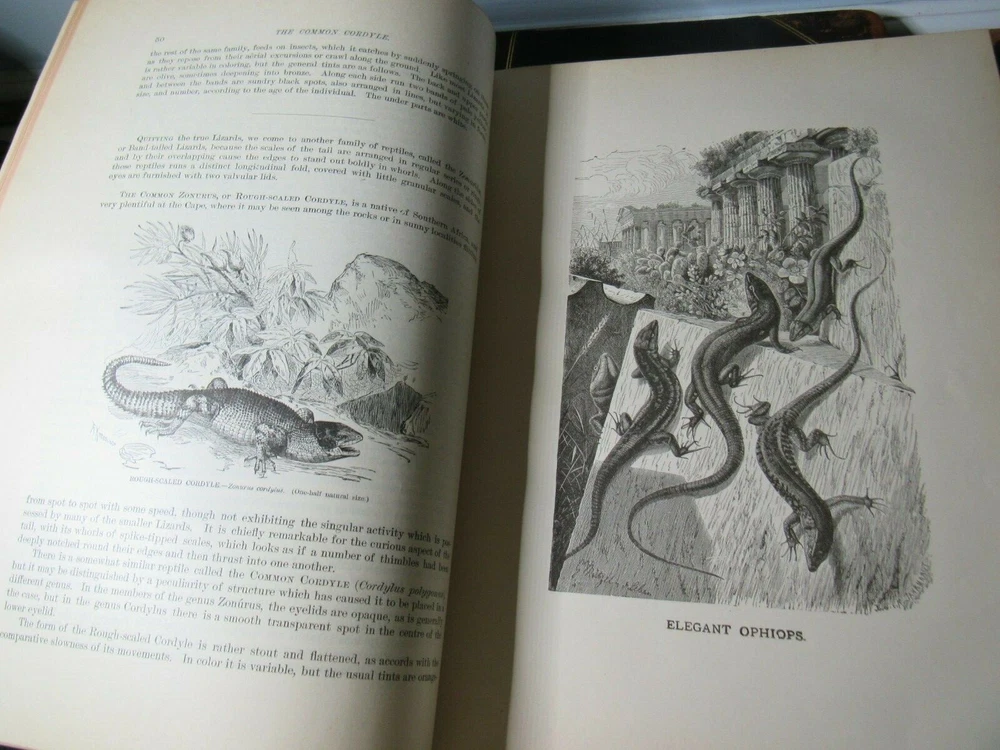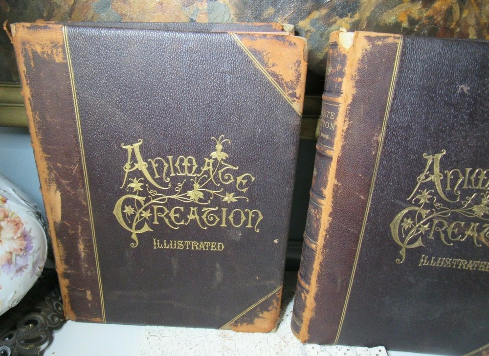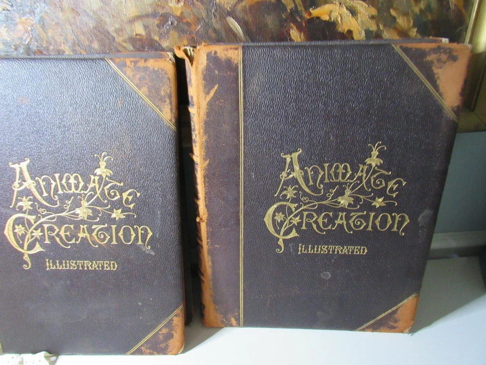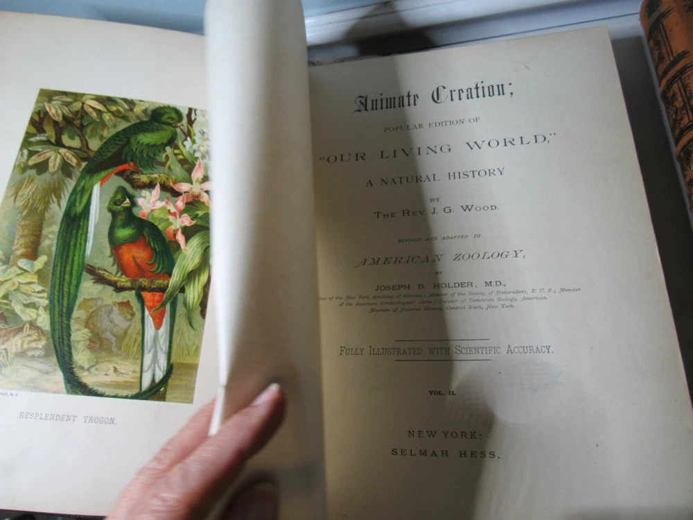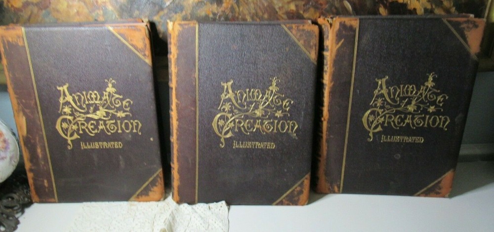 · Animate Creation; popular edition of our living world, a natural history by the Rev. J. G Wood · 3 Volumes leather bound for 1885. Beautiful color pictures and black and white in the book. · Vol 1: Mammalia 10 color plates; 20 full page black and white illustrations. pp. 640 and index. Vol 2 : Birds. 10 color plates; 20 full page black and white illustrations. 632 pp. and index. Vol 3: Fishes, Reptiles, Mollusca, Insects, Crustacea, and more. ; 10 color plates, 20 full page black and white illustrations. 598 pp. and index. The 3 volumes set has some harsh wear to the covers. See pictures. Rub and deterioration to spines and corners. Insides appear in great condition. The color plates are beautiful. They are very heavy. Measure 13" x 10 x 1 3/4-1 7/8" depending on volume. The three together weigh 22 lbs. 5 oz. prior to packaging. Gold gilt lettering on covers and spines. Bindings are good. I want to find a good home for them with someone who knows how to care for them. With books old as this, if you require more pictures, let me know. This is all eBay has for their sites. Thanks for checking this out! No returns on printed materials. Sorry. Any questions, ask. Check out the pictures as they are part of the description. If you see or don’t see something, please ask for clarification. Please check out my other items for sale. Anything in pictures that is not in description is probably not part of sale. Please ask before purchase if you think it may be part of sale. When buying vintage items, keep in mind it may show characteristics of age, including allowable base wear, wear, rub, light scratches, discoloration, bubbles, pattern irregularities, folds in glass, straw marks (inclusions/cooling marks) or mold marks. *** Items must be returned to receive your money back. ***PLEASE NOTE *** Due to so many people not returning feedback after I have left them theirs, I will no longer give buyers any until it is given first. Sorry, but I’m missing hundreds and it’s time for a change. Feedback is extremely important to us and eBay * If you are satisfied with our transaction, please take a moment to leave Positive Feedback. YOUR Satisfaction is our #1 Priority!