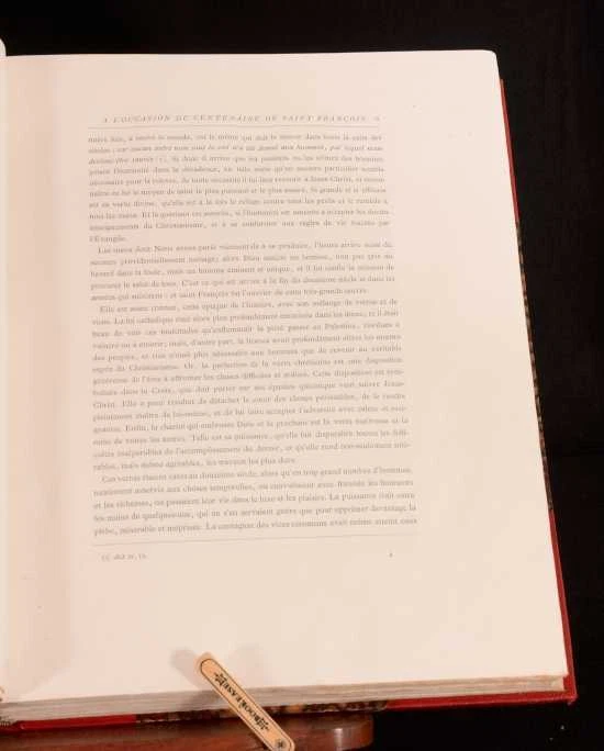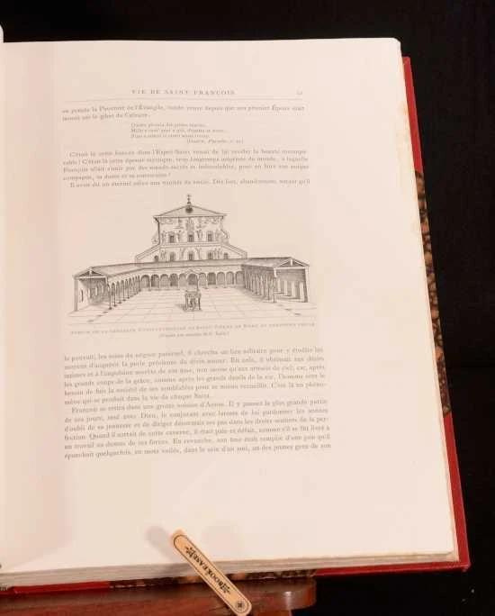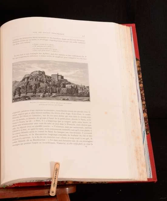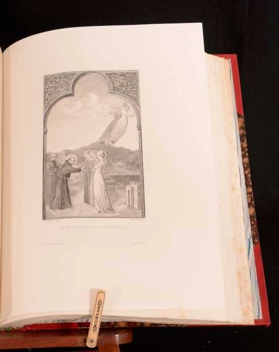 Click here to see our other books! Saint Francois D'Assise Leopold De Cherance; Henri De Grezes; Ubald De Chanday 1885 E. Plon & Nourrit : Paris 14.5" x 11.5" xvi, 438pp SUMMARY An illustrated biography of Francis of Assisi. Illustrated,Leather Binding,Very Scarce Overall Condition: Near Fine This book weighs 3 KG when packed UK Postage: £ 3.99 US Postage: £ 36.99 EU Postage : £ 25.99 European Postage: £ 27.99 Asia Postage: £ 47.99 Worldwide Postage: £ 69.99 DESCRIPTION In the original French. An illustrated biography of Francis of Assisi in excellent condition, attractively bound in half morocco. Francis is one of the most famous Roman Catholic saints. He lies behind the Franciscan orders, which include the men's Order of Friars Minor, the female Order of Saint Clare, the Third Order of Saint Francis, and the Custody of the Holy Land. The authors of this work were all from the Order of Friars Minor. This work has two parts: the first deals with the events of his life, and the second with events following his death. As well as the aforementioned plates, it contains a plethora of beautiful vignettes. These powerfully depict the extraordinary life of their subject, who notably was the first recorded person to perceive stigmata upon his own body. Francis was canonised in 1228, and became the patron saint of Italy. This French work is a testament to his lasting hold on the imagination of the Catholic world. Complete here with 35 plates. CONDITION In half morocco. Externally excellent, with only very minor rubbing to the extremities of the boards and spine.The leather retains an admirable colour. There is some spotting to the fore edge. Otherwise bright and clean throughout. Complete with 35 plates. Firmly bound. Overall Condition: Near Fine GLOSSARY OF TERMS Overall Condition (Dustwrapper condition rating is shown after that for the book itself, where a dustwrapper is present) Fine - Very well preserved copy showing very little wear Very Good Indeed - Only one or two minor faults, really a very attractive copy Very Good - Quite a wide term meaning no major faults but probably several smaller ones often expected given the age of the book, but still a respectable copy Good - Meaning not very good. Some more serious faults as will be described in the condition report under 'condition' Good Only - Meaning one or more faults that could really do with repair Fair - As with good only above but with other faults leaving a compromised copy even after repair Poor - Really bad and possibly seriously incomplete. We only sell books in this condition where their rarity or value makes them attractive none the less. Major defects will be described. GUARANTEE We offer a full money back guarantee on our descriptions. Please ask for details and conditions. We prefer PAYPAL. If you pay via PAYPAL we will post the item off the same or the next working day with the postage you have selected. Please note we cannot accept USD cheques
