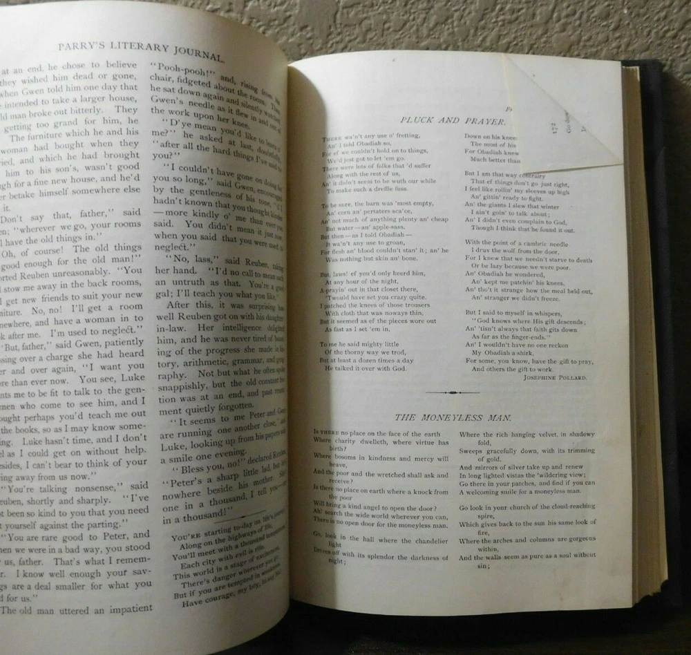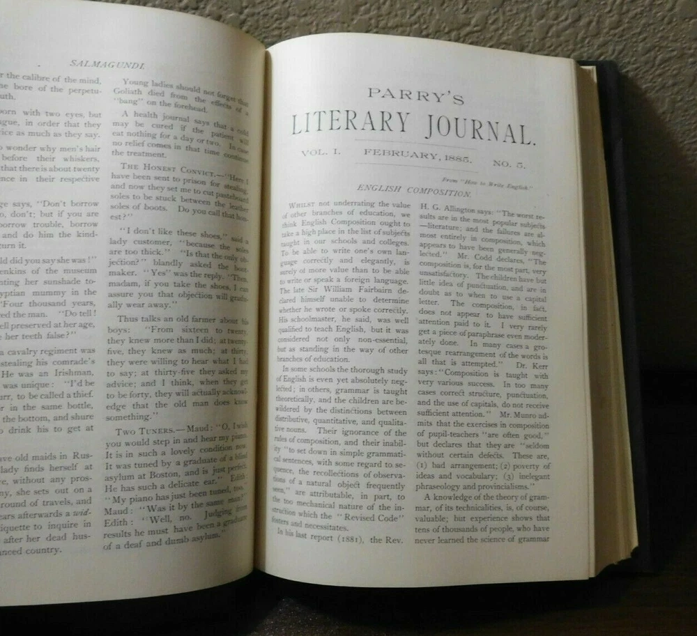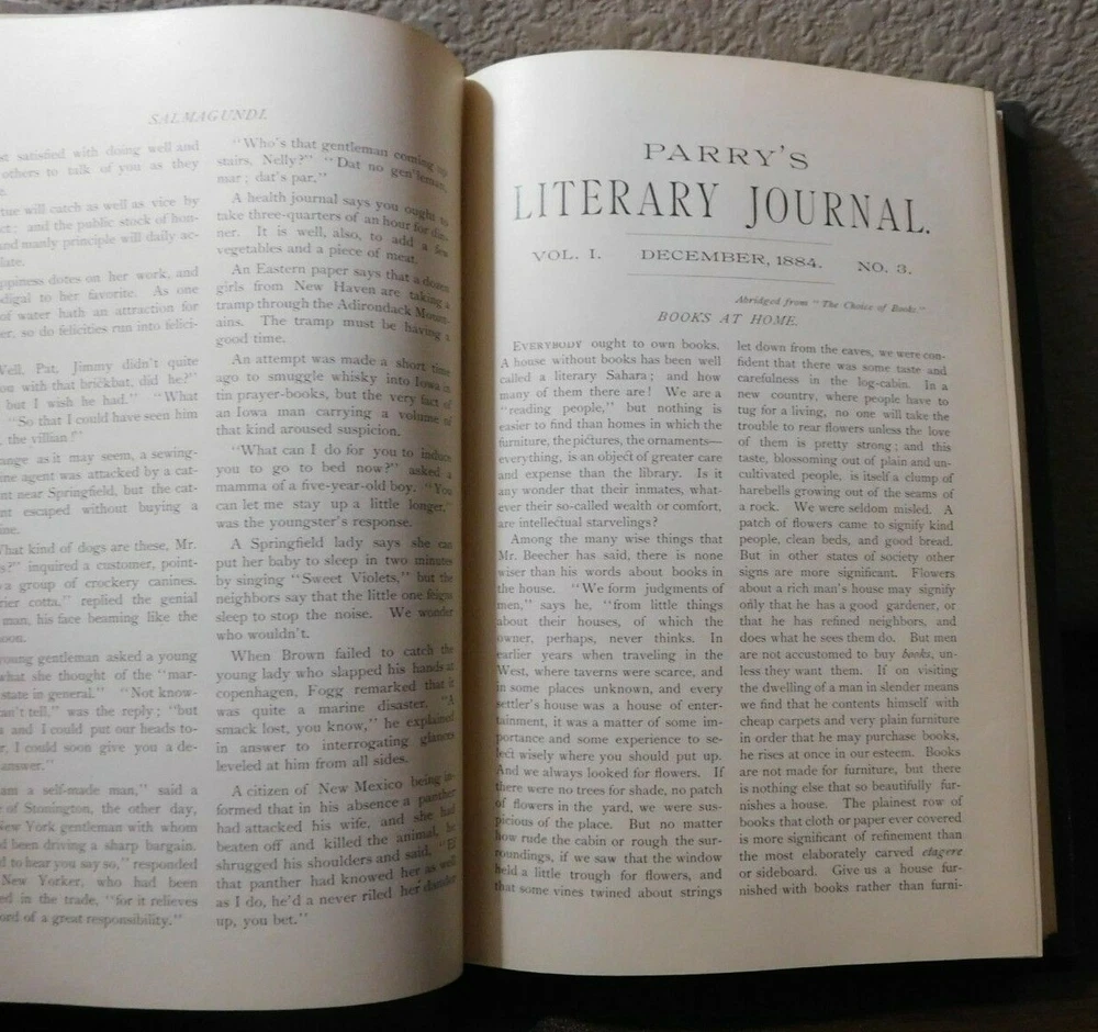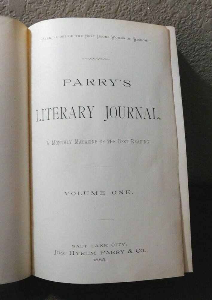 PARRY'S LITERARY JOURNAL A Monthly magazine of the Best Reading Volume One Salt Lake City, Utah Jos. Hyrum Parry & CO. 1885 This book contains every issue of the book from October 1884 to September 1885. It measures about 6 1/4" x 9 3/4" Condition: Used, Good The hardback cover has a leather spine and corners. The leather has light rubbing but no fraying. The cloth covered boards are in very good condition. The binding is tight. It has about 10 pages with creased corners. SEE MY STORE FOR MORE GREAT ITEMS Please read description carefully and look closely at all pictures. If you have questions or concerns ALWAYS send messages through Ebay messaging and NOT my email address. I am happy to entertain offers but NEVER include shipping in your offer price. Shipping cost is always as stated in item listing. Shipping and Handling Shipping is figured by exact USPS shipping cost, delivery confirmation cost, and $2.00 packaging and handling fee. * I do offer combined shipping based on the weight of the books. To receive the shipping discount items MUST be paid for together. This is an Ebay rule, not mine . To do this, please place items in your Ebay cart and then you will be invoiced for all items together * If item is extremely large or needs special attention the packaging and handling fee might be more, this is very rare!