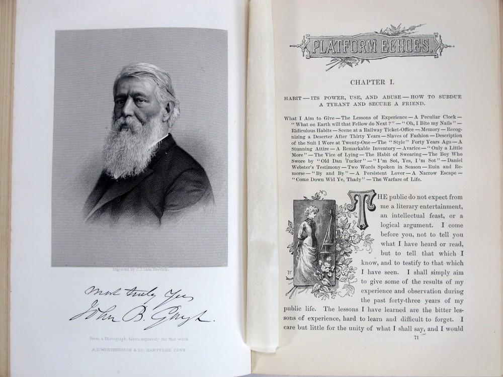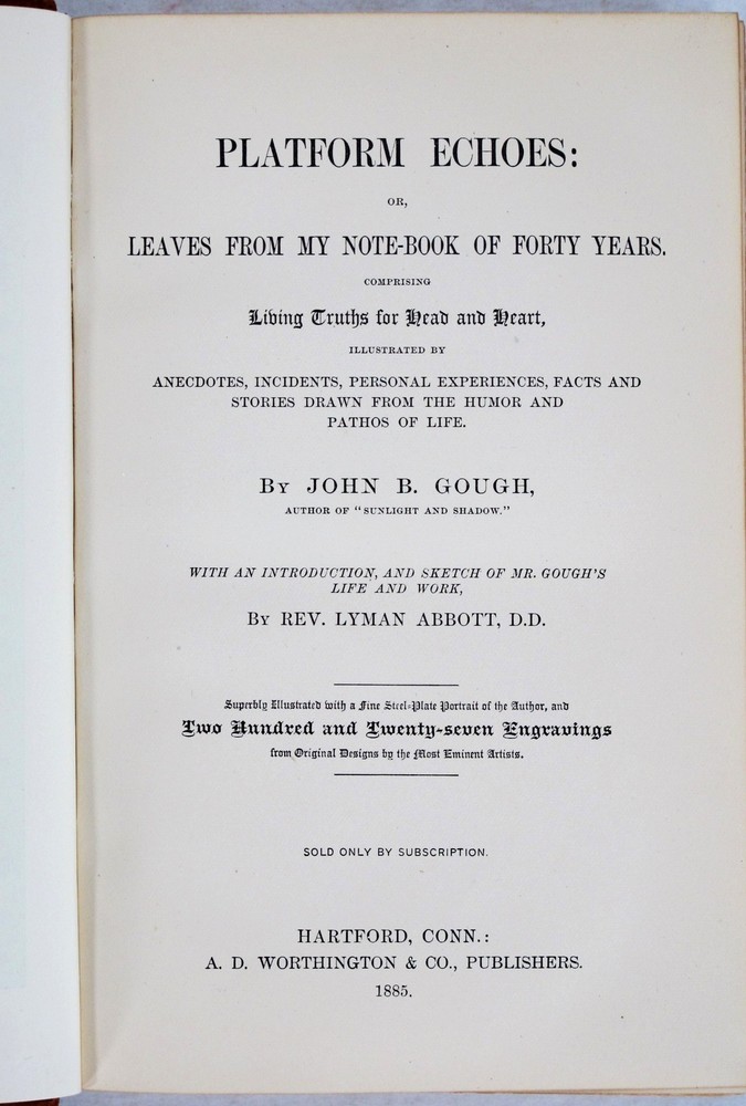 WELCOME TO MY AUCTION YOU ARE VIEWING Platform Echoes or, Leaves From My Note-Book of Forty Years by John B. Gough Illustrated A.D. Worthington & Co . Hartford 1885 First Edition Sold Only by Subscription Item Description: 1st edition of Pl atform Echoes: or, Leaves From My Note-Book of Forty Years by John B. Gough . Comprising Living Truths for Head and Heart. Illustrated by Anecdotes, Incidents, Personal Experiences, Facts and Stories drawn from the Humor and Pathos of Life. With an Introduction, and Sketch of Mr. Gough 's Life and Work, by Rev . Lyman Abbott . Published by A.D. Worthington & Co ., Hartford , 1885, 1885. First Edition. Sold Only By Subscription. Hardcover . Condition: Very Good condition. The leather binding is clean and tightly bound. F ront board has a small scrape. The hinges are solid and tight. The pages are clean, bright and unmarked. There is no writing or markings, no foxing, no bookplates. Original full calf leather binding with raised bands to the spine, two morocco leather spine labels with gilt lettering and gilt rule. Pink endpapers . Superbly illustrated with a frontispiece portrait of the author, and Two Hundred and Twenty-Seven Engravings from Original Designs by the Most Eminent Artists including F. O. C Darley, Wm. L. Sheppard and T.W. Williams. xxxviii, 639 pages. 6 x 9" tall. Temperence: Addresses, Lectures, Essays, Biography. An excellent addition to a library or collection. John B. Gough , 1817-1886. Born in London. Sent to America at age 12 to learn a trade. Once in America, John lost employment and was continually in debt. When the death of his mother occurred and his employment problems continued, Gough turned to drinking. Soon after Gough realized what a mess his life was becoming because of the alcohol, a Temperance advocate approached him and convinced Gough to sign a pledge and come to a meeting. At this meeting he made his first speech on Temperance and signed a pledge to totally abstain from alcohol. He began to tell his story, and became one of the most famous temperance " Speachers " of his time. During his career he delivered some 9,000 lectures to more than 9 million people in America, Canada, England, Scotland and Ireland. After his death in 1886 the New York Times claimed he was one of the best known public speakers here and in Great Britain and one their most influencial social reformers. Contents: HABIT ITS POWER, USE, AND ABUSE; HOW TO SUBDUE A TYRANT AND SECURE A FRIEND; TO YOUNG MEN SOWING THE WIND AND REAPING THE WHIRLWIND; A TALE OF RUIN, REMORSE, AND DEATH; WHO ARE THE VICTIMS?; LIFE IN A BAR-ROOM; LIFE HISTORIES TRACED IN TEARS AND WRITTEN IN BLOOD; SLIPPERY PLACES; TRAPS FOR THE UNWARY; PATHETIC SCENES AND INCIDENTS; HOME SHADOWS; WHO IS MY NEIGHBOR?; LIFE IN THE BACK STREETS OF NEW YORK; VOICES FROM THE SLUMS. AGENTS OF THE DEVIL; HOW LIQUOR-SELLERS MAKE PAUPERS, FEED JAILS, AND INCITE CRIME. Buy with confidence... Fast Shipping--Includes Free Delivery Confirmation and Insurance. We have 18 years experience selling on Ebay. We maintain 100% Feedback. Please Check out my other items ! Be sure to add me to your favorites list ! Condition glossary: MINT - as new FINE - clean and with no wear but not as crisp as mint NEAR FINE - clean with only minimal shelf wear - no writing or tears VERY GOOD - clean with light shelf wear, possible owner's name, any marks or tears are disclosed GOOD - worn edges and corners, possible smudges or markings inside, edge tears, FAIR - more wear than "good", not attractive at all but still solid enough to read EX-LIBRARY - Any book listed as ex-lib may contain the following flaws: front free endpaper removed, library card pocket, jacket glued to the endpapers, tape and sticker residue, other library notations, discard stamps, etc. We Ship: Worldwide. We Offer: USPS Domestic and International Shipping We Ship 5 Days a Week. Monday-Friday Free Delivery Confirmation--Confirmation Number will be automatically emailed to you as soon as your shipping label is printed. Cross-border buyers are responsible for any customs, duties, etc. imposed by the buyer's home country. RETURNS : Returns are accepted. While every effort is made to accurately describe every item minor flaws may not always be noted. Please review the description and condition of an item prior to bidding. If you have any questions please do not hesitate to Email us. REFUNDS: You may return your item for a full refund within 30 days. You are required to ship the item back with insurance and tracking at your own expense. Refunds will be issued in the form in which item was paid. We at Lorikayltd strive for 5 Stars and 100% Feedback. No sale is final until you are satisfied with your purchase. We know you have many choices buying online--and we appreciate your business Auction Template Design © In My Cedar Chest - Unauthorized Duplication Prohibited.