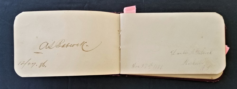 1886 antique AUTOGRAPH ALBUM rockville ri LYRA BABCOCK handwritten leather SCROLL DOWN for MORE PHOTOS in DESCRIPTION Click HERE to view or search ANTIQUE.COTTAGE listings. This listing is for the sweet little autograph. Measures approx 3.75"x4.5". This leather covered book has the following signatures: - Lyra A. Babcock, Rockville RI - A. S. Babcock - Lantie A. Babcock, Rockville - Mary P. Palmer - Jared G. barber - Bessie Barber - A. A. Barber - Nellie Langworthy - Mabel Burdick - Welcome B. Babcock, Ashaway - Mary R. Babcock, Ashaway - George Woodman - ? - Gardner Burdick - Cora L. Keny, Hope Valley - May L. E. McLearn, Rockville - Charlotte P. Woodmancy, Rockville - Esther L. Clarke - J. Clarke - Robert Peck, New York City - Lyena W. Laufhear, Rockville There are additional blank pages and 3 pages with blue flower print. Excellent original early family, and/or town genealogy, history, antique, museum, collectible heirloom and/or ephemera. CONDITION : See listing description and photos. Some warp to the cover. Some cracks on spine. Other light wear. - International buyers are responsible to pay VAT or other Taxes to their countries as required. - eBAY collects and remits sales tax on behalf of several states. If you are a dealer, you can write to eBay to file a form to become tax exempt. LOC: LOC2: SMALLBOOKS17-TMK Powered by SixBit's eCommerce Solution
