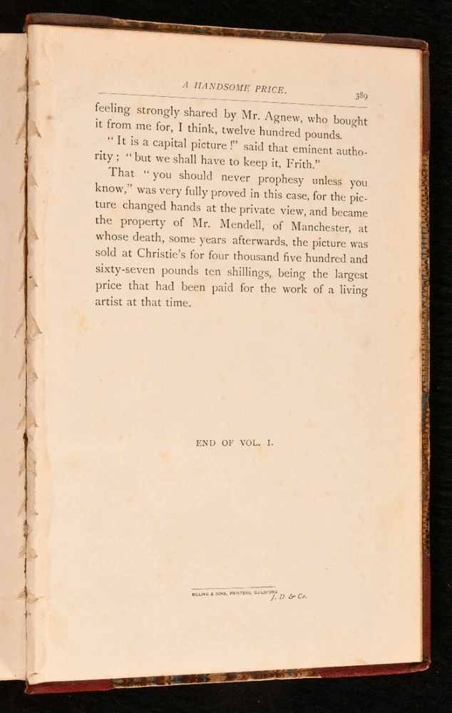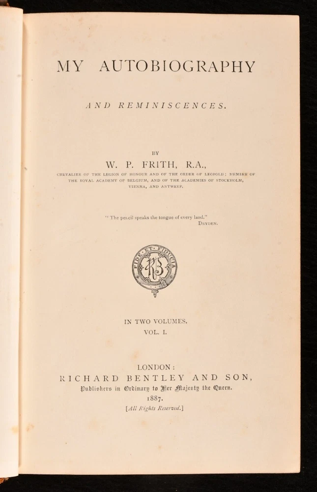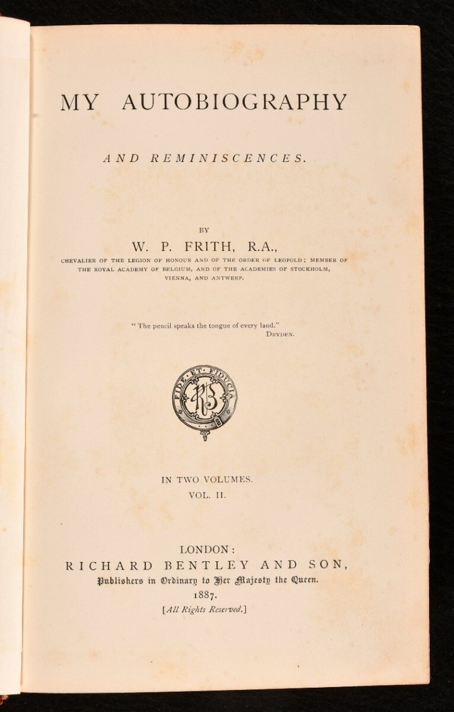 Click here to see our other books! My Autobiography and Reminiscences W. P. Frith 1887 Richard Bentley : London 8.5" by 5.5" viii, 389; vi, 352pp. SUMMARY The first edition of William Powell Frith's autobiographical work, complete in two uniform volumes. First Edition,Leather Binding,Rebound Overall Condition: Good This book weighs 2 KG when packed UK Postage: £ 3.99 US Postage: £ 29.99 EU Postage : £ 21.99 European Postage: £ 23.99 Asia Postage: £ 37.99 Worldwide Postage: £ 38.99 DESCRIPTION William Powell Frith was a prominent English painter, known for his genre subjects and panoramic narrative works of life in the Victorian era. The present work consists of his autobiography, complete in two volumes, the first edition of 1887, uncommonly seen complete. Here he expresses his distaste for modern art developments. His autobiography was very popular due to its informal style, showcasing his talent for story-telling. This work was followed by a third autobiographical volume titled Further Reminiscences. Complete with half titles. Featuring a frontispiece to each volume. CONDITION Rebound in uniform half morocco bindings over marbled boards, renewed endpapers. Externally sound with shelf wear, rubbed to spine, boards, and extremities, light fading to back-strip. From library bookplate to front pastedown, with previous ownership inscriptions to endpaper, one signed 1896. Internally, firmly bound. Occasional minor spotting to odd leaf, otherwise pages generally bright and clean throughout. Overall Condition: Good GLOSSARY OF TERMS Overall Condition (Dustwrapper condition rating is shown after that for the book itself, where a dustwrapper is present) Fine - Very well preserved copy showing very little wear Very Good Indeed - Only one or two minor faults, really a very attractive copy Very Good - Quite a wide term meaning no major faults but probably several smaller ones often expected given the age of the book, but still a respectable copy Good - Meaning not very good. Some more serious faults as will be described in the condition report under 'condition' Good Only - Meaning one or more faults that could really do with repair Fair - As with good only above but with other faults leaving a compromised copy even after repair Poor - Really bad and possibly seriously incomplete. We only sell books in this condition where their rarity or value makes them attractive none the less. Major defects will be described. GUARANTEE We offer a full money back guarantee on our descriptions. Please ask for details and conditions. We prefer PAYPAL. If you pay via PAYPAL we will post the item off the same or the next working day with the postage you have selected. Please note we cannot accept USD cheques