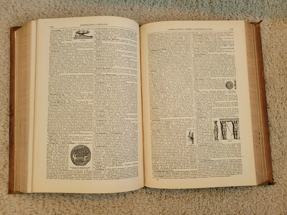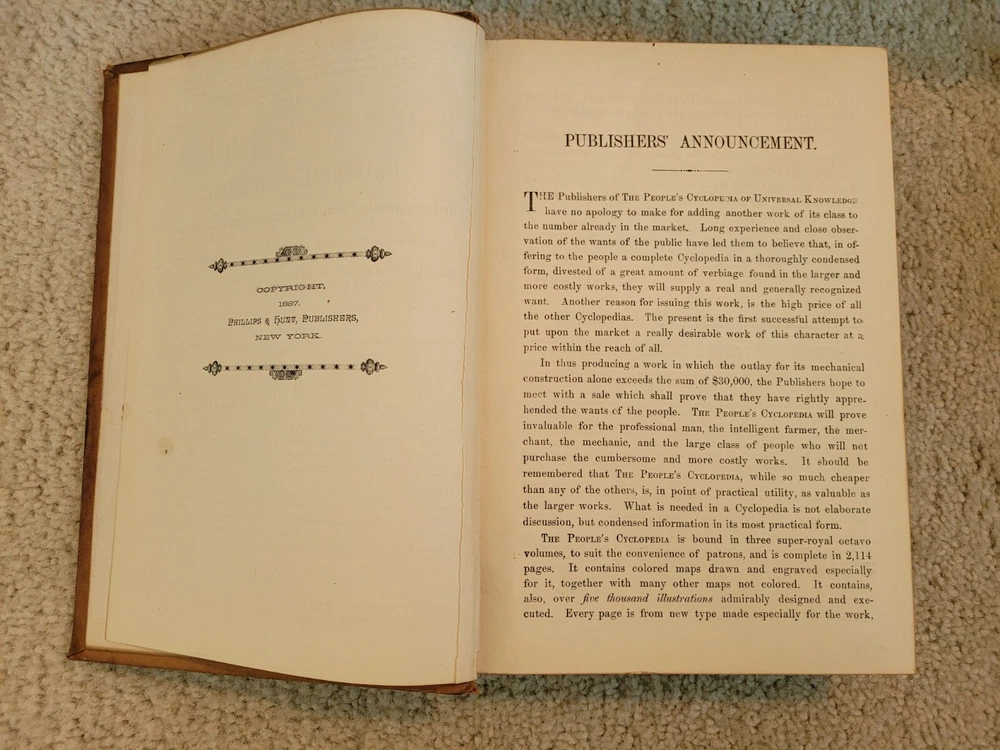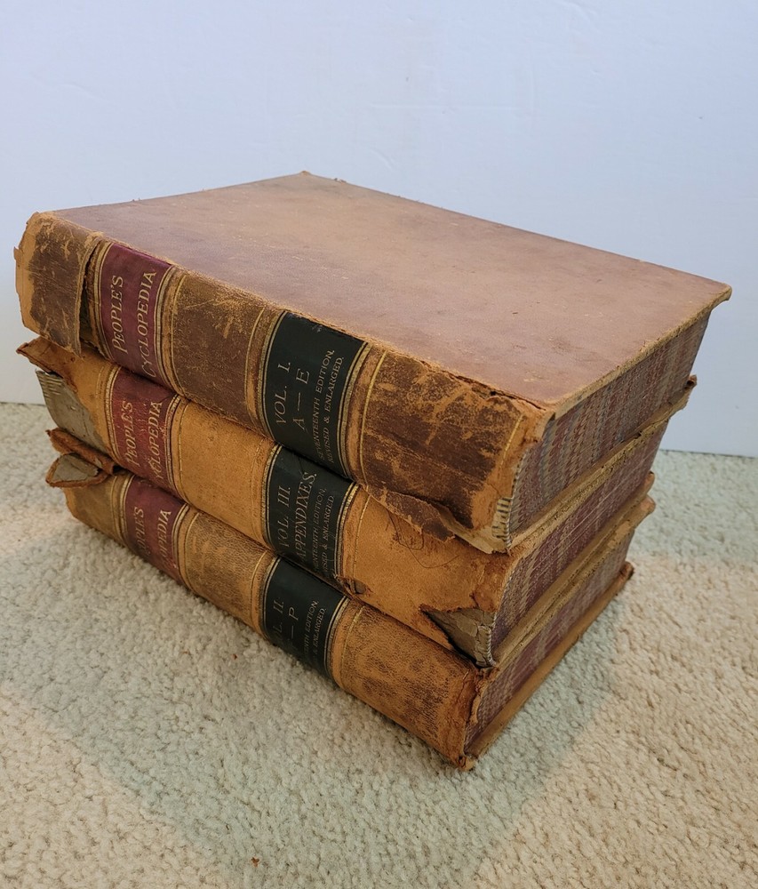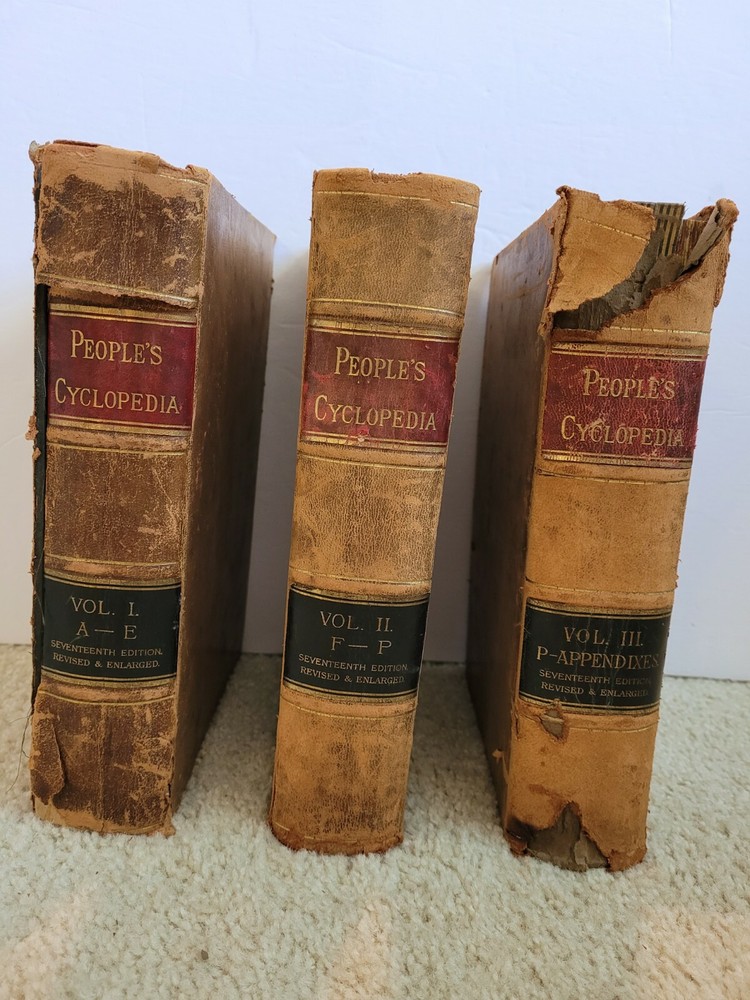 People's Cyclopedia of Universal Knowledge 3 Vol Set Year: 1887 17th Edition Volume I - A - E Volume II - F - P Volume III - P - Appendices Total: 2147 pages Phillips & Hunt Publishers New York Condition: The tan colored leather hardcovers are in poor condition.The leather is literally falling apart and disintegrating, leaving tan powder on things so be cautious!! The hardcover backing fell off Volume I and the binding is beginning to come loose. Volume II is in the best shape of the three and it's binding is still good. Volume III has tears on the Hardcover but the binding is still pretty good. The interior pages are clean and well preserved with the exception of discolorations from age on the edges of some, but no missing pages on all three. This came from my great, great uncle's library so it is inscribed and stamped with his name inside. Please see all photos. COMES FROM A SMOKE & PET FREE HOME IF YOU ARE UNHAPPY WITH YOUR PURCHASE, PLEASE CONTACT ME ABOUT IT FIRST, BEFORE LEAVING NEGATIVE FEEDBACK. I STRIVE FOR A 5 STAR EXPERIENCE FOR ALL MY CUSTOMERS. RETURNS: ALL NEW ITEMS MUST BE RETURNED SEALED AND UNUSED. ALL OTHER ITEMS MUST BE RETURNED IN THE SAME CONDITION AS WHEN SENT. BUYER PAYS RETURN SHIPPING WITH TRACKING SHIPPING: I ONLY CHARGE THE ACTUAL SHIPPING COST AND SOMETIMES A SMALL HANDLING FEE OF $1.00 AT THE MOST AND USUALLY ONLY ON INTERNATIONAL SHIPPING. PLEASE TAKE THIS INTO CONSIDERATION WHEN LEAVING FEEDBACK. I STRIVE TO GET YOU THE LOWEST PRICE POSSIBLE WHILE STILL PACKING YOUR ITEM WELL SO IT GETS TO YOU IN ONE PIECE. I HAVE NO CONTROL OVER USPS PRICES AND AM A SMALL-TIME SELLER WHO DOESN'T GET BIG CORPORATE SHIPPING DISCOUNTS. TO GET COMBINED SHIPPING DISCOUNTS ON “BUY IT NOW” LISTINGS, PLEASE ADD ALL ITEMS TO YOUR CART FIRST TO PAY FOR ON ONE INVOICE. IF THE SHIPPING DISCOUNT CALCULATOR ISN’T WORKING, MESSAGE ME. IF YOU ARE OVERCHARGED, I WILL REFUND THE DIFFERENCE. INTERNATIONAL BUYERS PLEASE NOTE: IMPORT DUTIES, TAXES, AND CHARGES ARE NOT INCLUDED IN THE ITEM PRICE OR SHIPPING COST. THESE CHARGES ARE THE BUYER'S RESPONSIBILITY. PLEASE CHECK WITH YOUR COUNTRY'S CUSTOMS OFFICE TO DETERMINE WHAT THESE ADDITIONAL COSTS WILL BE PRIOR TO BIDDING OR BUYING