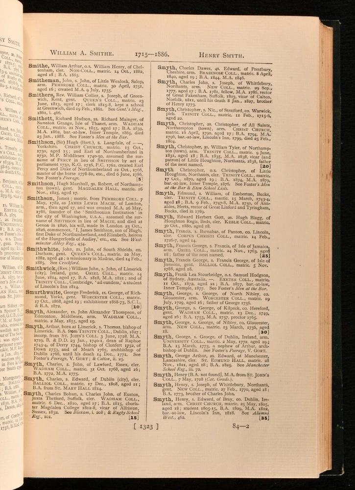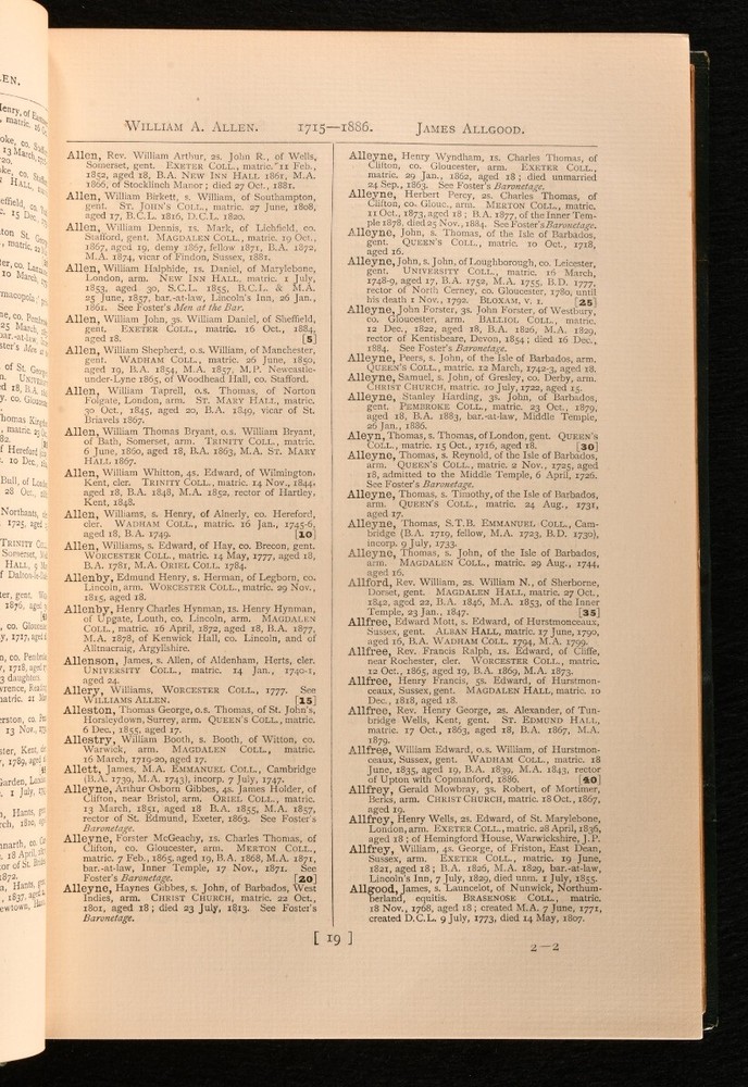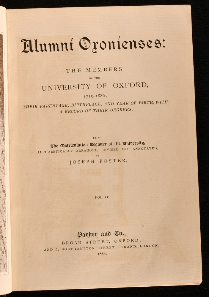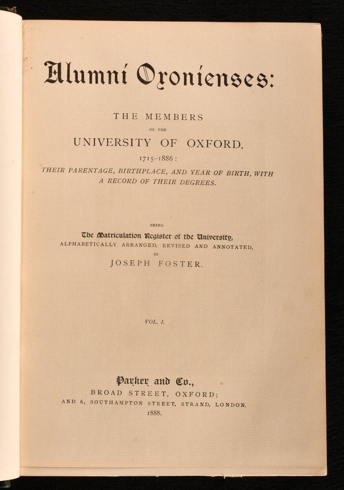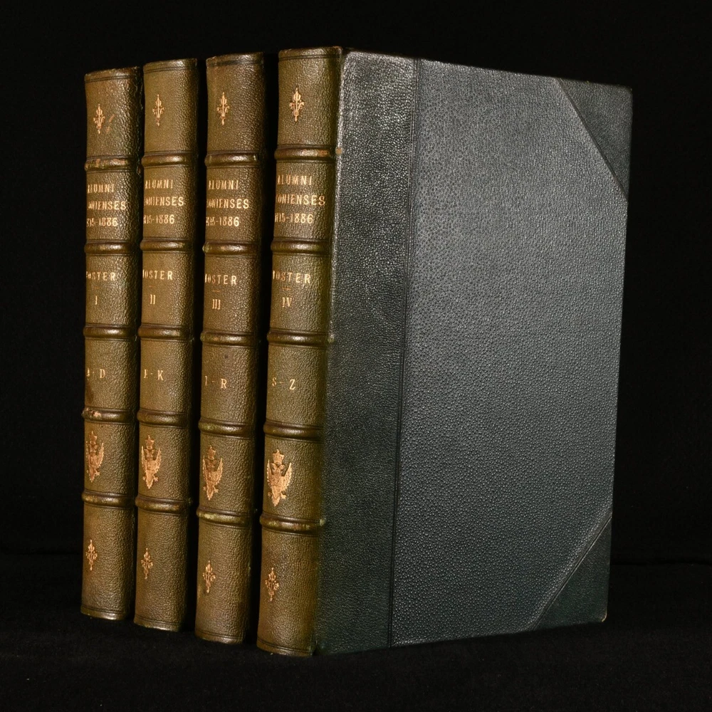 Click here to see our other books! Alumni Oxonienses: The Members of the University of Oxford 1715-1866: Their Parentage, Birthplace, and Year of Birth, with a Record of their Degrees, Being the Matriculation Register of the university Alphabetically Arranged, Revised, and Annotated. Joseph Foster [ed.] 1888 Parker and Co. : Oxford 10.5" by 7" ix, [1], 1-401; [6], 402-807; [6], 808-1240, [3]; [6], 1241-1633pp. SUMMARY A lovely set bound in leather of this illustrated matriculation register of the University of Oxford from 1715 to 1886, with biographical notes on all alumni. Illustrated,Leather Binding,Publishers' Original Binding,Uncommon Overall Condition: Very Good Indeed This book weighs 6 KG when packed UK Postage: £ 4.49 US Postage: £ 52.99 EU Postage : £ 30.99 European Postage: £ 55.99 Asia Postage: £ 89.99 Worldwide Postage: £ 189.99 DESCRIPTION A complete matriculation register of the University of Oxford in four volumes, charmingly bound in leather. An alphabetically arranged, revised, and annotated list of the members of the University from 1715 to 1886, with biographical notes such as parentage, birthplace, year of birth, and a record of their degrees. Edited by Joseph Foster. Profusely illustrated throughout with images from the University. Collated, only lacking plate facing page forty eight to volume one, titled 'Part of Quadrangle from an engraving by Skelton.' 'Library, with view of Christ Church Cathedral by J M W Turner from Skelton' to Volume Two facing p.721 instead of p.727, 'Fellows Building from an engraving by Skelton' to Volume Two facing p.745 instead of p.743, and 'Sheldonian, Interior, "Oxford Almanack", 1820' facing p.1497 instead of p.1499. CONDITION In the original publisher's half morocco binding and cloth covered boards with gilded top edges. Externally very smart with only minor shelfwear and minor rubbing to the leather. Volume One has a slight damping mark to the rear board, slightly cockling the rear pastedown. A minor touch of edge wear. The leather to the spine is slightly faded. Internally, firmly bound. The pages are bright and clean, with the occasional unopened leaf. Profusely illustrated throughout. Collated, only lacking plate facing page forty eight to volume one, titled 'Part of Quadrangle from an engraving by Skelton.' 'Library, with view of Christ Church Cathedral by J M W Turner from Skelton' to Volume Two facing p.721 instead of p.727, 'Fellows Building from an engraving by Skelton' to Volume Two facing p.745 instead of p.743, and 'Sheldonian, Interior, "Oxford Almanack", 1820' facing p.1497 instead of p.1499. With two pages of advertisements to the rear to volume three. Overall Condition: Very Good Indeed GLOSSARY OF TERMS Overall Condition (Dustwrapper condition rating is shown after that for the book itself, where a dustwrapper is present) Fine - Very well preserved copy showing very little wear Very Good Indeed - Only one or two minor faults, really a very attractive copy Very Good - Quite a wide term meaning no major faults but probably several smaller ones often expected given the age of the book, but still a respectable copy Good - Meaning not very good. Some more serious faults as will be described in the condition report under 'condition' Good Only - Meaning one or more faults that could really do with repair Fair - As with good only above but with other faults leaving a compromised copy even after repair Poor - Really bad and possibly seriously incomplete. We only sell books in this condition where their rarity or value makes them attractive none the less. Major defects will be described. GUARANTEE We offer a full money back guarantee on our descriptions. Please ask for details and conditions. We prefer PAYPAL. If you pay via PAYPAL we will post the item off the same or the next working day with the postage you have selected. Please note we cannot accept USD cheques