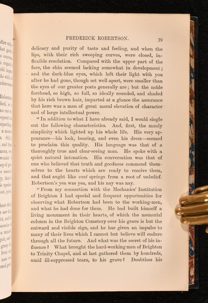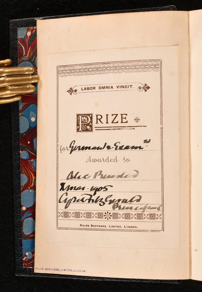 Click here to see our other books! Memoir of Alexander J. Ross, D.D. Rector of Snelston Derbyshire and sometime Vicar of St. Philip's Stepney Adelaide Ross 1888 Wm. Isbister Limited : London 7.5" by 5" xi, 300pp. SUMMARY A lovely copy of this scarce biographical work of Alexader J. Ross, in a fine Relfe Brothers full calf prize binding. Fine Binding,Illustrated,Leather Binding,Prize Binding,Rebound,Scarce,Signed Binding Overall Condition: Near Fine This book weighs 0.75 KG when packed UK Postage: £ 3.99 US Postage: £ 19.99 EU Postage : £ 15.99 European Postage: £ 16.99 Asia Postage: £ 21.99 Worldwide Postage: £ 25.99 DESCRIPTION An uncommon work of memoir off Alexander J. Ross, compiled by his wife Adelaide from a gathering of his thoughts and teachings in a biographical from whichtraces the life from childhood to end. A interesting insight into the life and writing of a man known to be one of the leaders of liberal thought in Christian Theology. In a fine full calf Relfe Brothers signed binding, prize binding awarded to Alice B. in 1905 for German exam. Illustrated with a photographical frontispiece of A. J. Ross tipped in. CONDITION In a full calf Relfe Brothers signed binding, with five raised bands, decorative gilt tooling to the spine and extremities of the boards, marbled endpapers and edges. Externally lovely with minor shelf wear only, a hint of sunning to the upper margin of the front board. Prize bookplate to the verso frontispiece, dated 1905. Internally, firmly bound. The pages are bright and clean. Illustrated with a photographic plate tipped in to the frontispiece. Overall Condition: Near Fine GLOSSARY OF TERMS Overall Condition (Dustwrapper condition rating is shown after that for the book itself, where a dustwrapper is present) Fine - Very well preserved copy showing very little wear Very Good Indeed - Only one or two minor faults, really a very attractive copy Very Good - Quite a wide term meaning no major faults but probably several smaller ones often expected given the age of the book, but still a respectable copy Good - Meaning not very good. Some more serious faults as will be described in the condition report under 'condition' Good Only - Meaning one or more faults that could really do with repair Fair - As with good only above but with other faults leaving a compromised copy even after repair Poor - Really bad and possibly seriously incomplete. We only sell books in this condition where their rarity or value makes them attractive none the less. Major defects will be described. GUARANTEE We offer a full money back guarantee on our descriptions. Please ask for details and conditions. We prefer PAYPAL. If you pay via PAYPAL we will post the item off the same or the next working day with the postage you have selected. Please note we cannot accept USD cheques