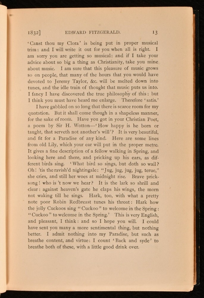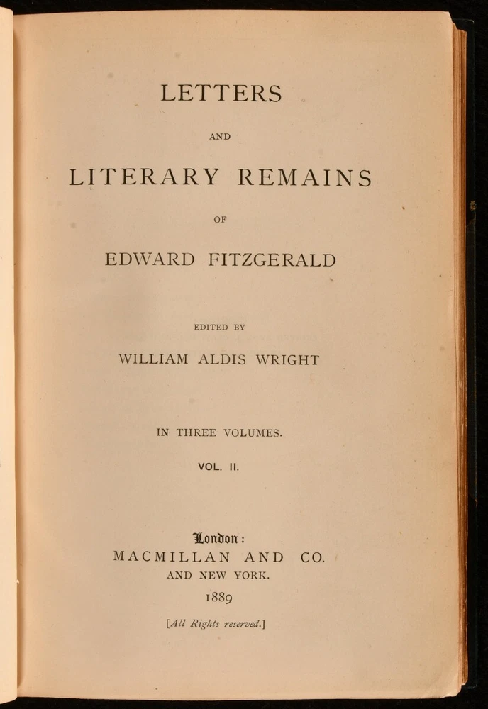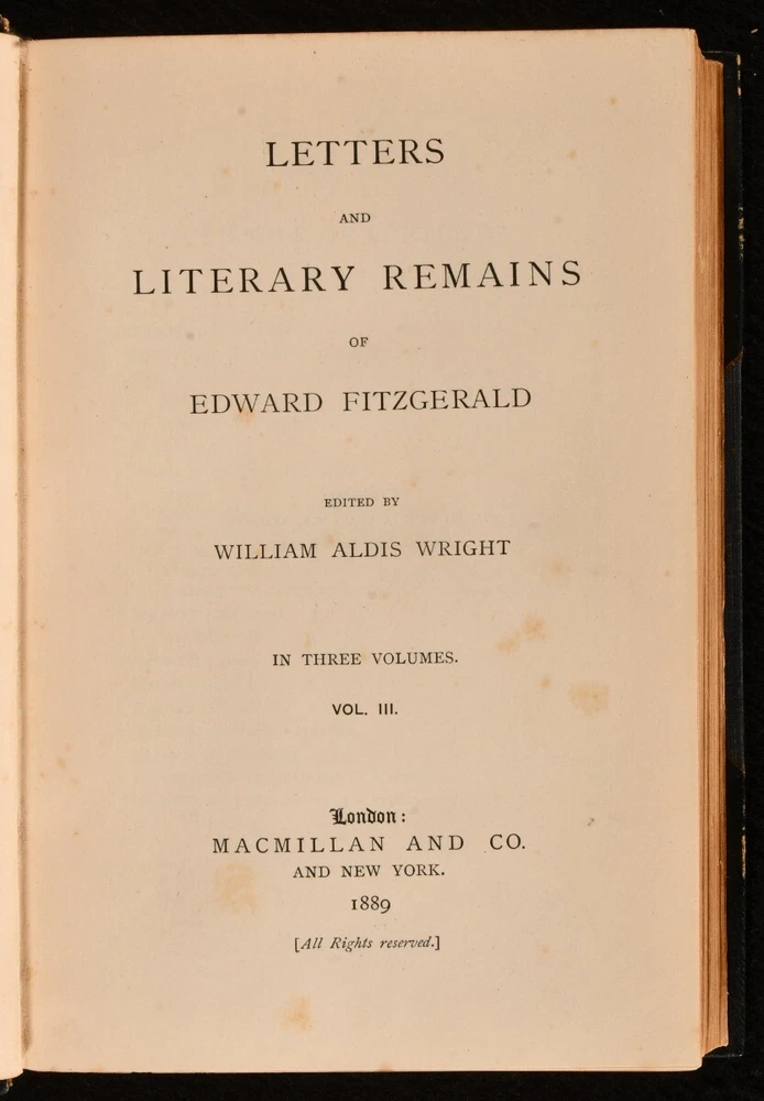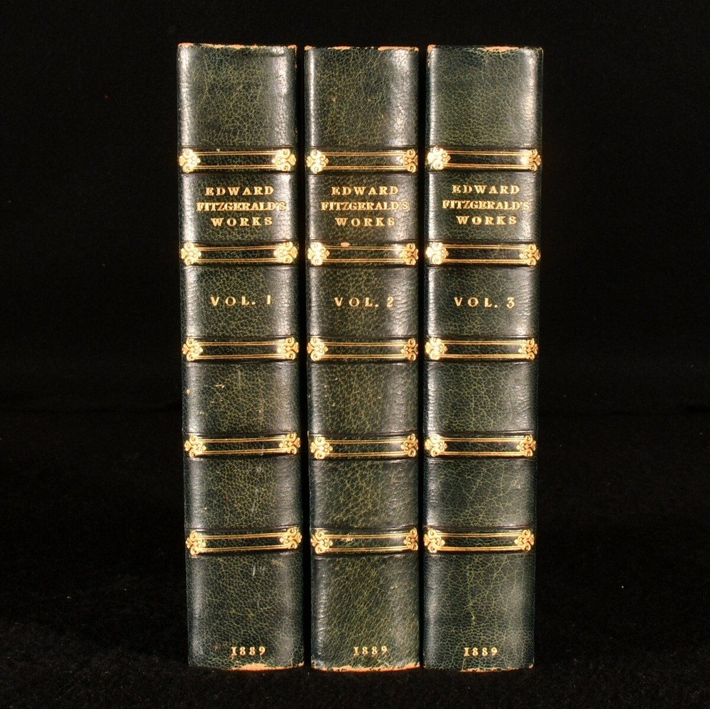 Click here to see our other books! Letters and Literary Remains of Edward Fitzgerald Edward Fitzgerald; William Aldis Wright 1889 Macmillan and Co. : London 7.5" by 5" xii, 502; [8], 488; [8], 492pp SUMMARY A lovely complete three volume set of the Letters and Literary Remains of Edward Fitzgerald, in its first edition. Rebound Overall Condition: Near Fine This book weighs 3 KG when packed UK Postage: £ 3.99 US Postage: £ 36.99 EU Postage : £ 25.99 European Postage: £ 27.99 Asia Postage: £ 47.99 Worldwide Postage: £ 69.99 DESCRIPTION A complete three volume set of Letters and Literary Remains of Edward Fitzgerald edited by William Aldis Wright. In a Roger De Coverly binding. Edward Fitzgerald was an English poet and writer, with his most famous being his English translation of The Rubaiyat of Omar Khayyam. The first volume contains letters from 1830-1883. Volume two contains the works Euphanor, Six Dreams from Calderon, The Bird Parliament, The Two Generals amongst others. The Third volume contains The Mighty Magician, Such Stuff as Dreams are Made of, Virgil's Garden and Rubaiyat of Omar Khayyam. Each volume has a frontispiece. Bound by Roger de Coverly & Sons and with a bookplate for Lord Stanley of Alderley. CONDITION Bound in half calf with cloth covered boards. Externally, lovely with some light fading to the spines. With a bookplate for Lord Stanley of Alderley to the three front pastedowns. Internally, firmly bound with bright and clean pages. Overall Condition: Near Fine GLOSSARY OF TERMS Overall Condition (Dustwrapper condition rating is shown after that for the book itself, where a dustwrapper is present) Fine - Very well preserved copy showing very little wear Very Good Indeed - Only one or two minor faults, really a very attractive copy Very Good - Quite a wide term meaning no major faults but probably several smaller ones often expected given the age of the book, but still a respectable copy Good - Meaning not very good. Some more serious faults as will be described in the condition report under 'condition' Good Only - Meaning one or more faults that could really do with repair Fair - As with good only above but with other faults leaving a compromised copy even after repair Poor - Really bad and possibly seriously incomplete. We only sell books in this condition where their rarity or value makes them attractive none the less. Major defects will be described. GUARANTEE We offer a full money back guarantee on our descriptions. Please ask for details and conditions. We prefer PAYPAL. If you pay via PAYPAL we will post the item off the same or the next working day with the postage you have selected. Please note we cannot accept USD cheques