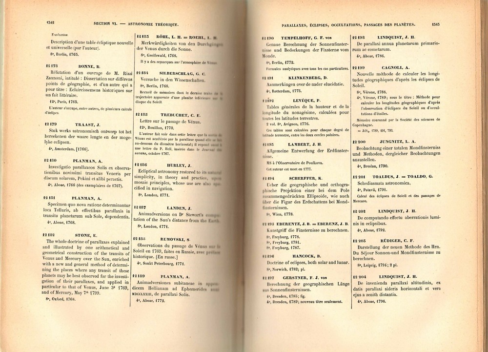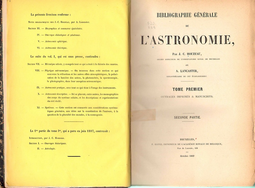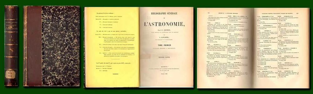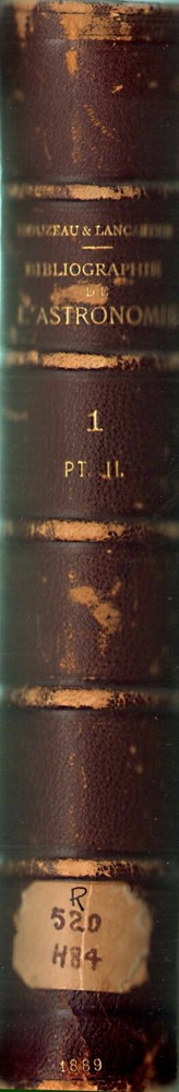 A MAMMOTH STANDARD BIBLIOGRAPHICAL REFERENCE FOR THE HISTORY OF ASTRONOMY BILBIOGRAPHIE GÉNÉRALE DE L'ASTRONOMIE, Tome Premier: Ouvrages Imprimes & Manuscrits Seconde Partie Par J.C. Houzeau et A. Lancaster 1889 Brussels first Edition in French; Heavy Leather Binding; VG condition. Description: J.C. Houzeau and A. Lancaster BIBLIOGRAPHIE GÉNÉRALE DE L'ASTRONOMIE; TOME PREMIE; SECONDE PARTIE: OUVRAGES IMPRIMES & MANUSCRITS [A General Bibliography of astronomy; Volume 1; Second Part: Printed Works and Manuscripts]. Bruxelles: F. Hayez, 1889, 7.5 x 9 x 2 in., pp i-cxx then paginated 859-1625 plus table of contents. Not illustrated. Condition: Hardbound in heavy quarter leather over marbled boards; Considerable edgewear with corners worn to boards and scuffing of spine hinges. Ex libris with the usual bookplates and call numbers but no other stamps notable. Pages age toned but not foxed. TItle page separating but still attached. Otherwise clean, very tightly bound, and unmarked throughout. Overall VG+ condition; an attractive volume. Information: This is the major bibliographical reference for historians of astronomy and researchers looking for information published before 1880. A magisterial work, written in French, but referencing major European languages, this is the second part of the first volume, containing sections III--Biographies and Letters; IV--Didactic words and General astronomy; V---Spherical Astronomy; and VI--Theoretical Astronomy; Also Note that this is volume I part 2 only. (I have already sold other volumes separately). Shipping overseas is quite expensive since this is a very heavy volume VISIT MY EBAY STORE FOR OTHER ITEMS OF INTEREST(Click This Link) Please inquire about discounts for purchases of multiple items. Shipping: Free media rate shipping in US. Higher international postage as appropriate (See the Shipping and Payment tab on this listing for an estimate and contact us before bidding if you have questions). We make every attempt to describe items clearly and completely. Please read our listings carefully, inspect posted images of the item, and let us know if you have any questions before you bid. All buyers must pay according to Ebay policies. If you have any questions about this, please email me. International bidders should contact me for a quote on shipping before bidding. Whenever possible, international shipping will be via Ebay Standard International Delivery. Import duties, taxes and charges are not included in the item price or shipping charges. These charges are the buyer's responsibility. Please check with your country's customs office to determine what these additional costs will be prior to bidding/buying.