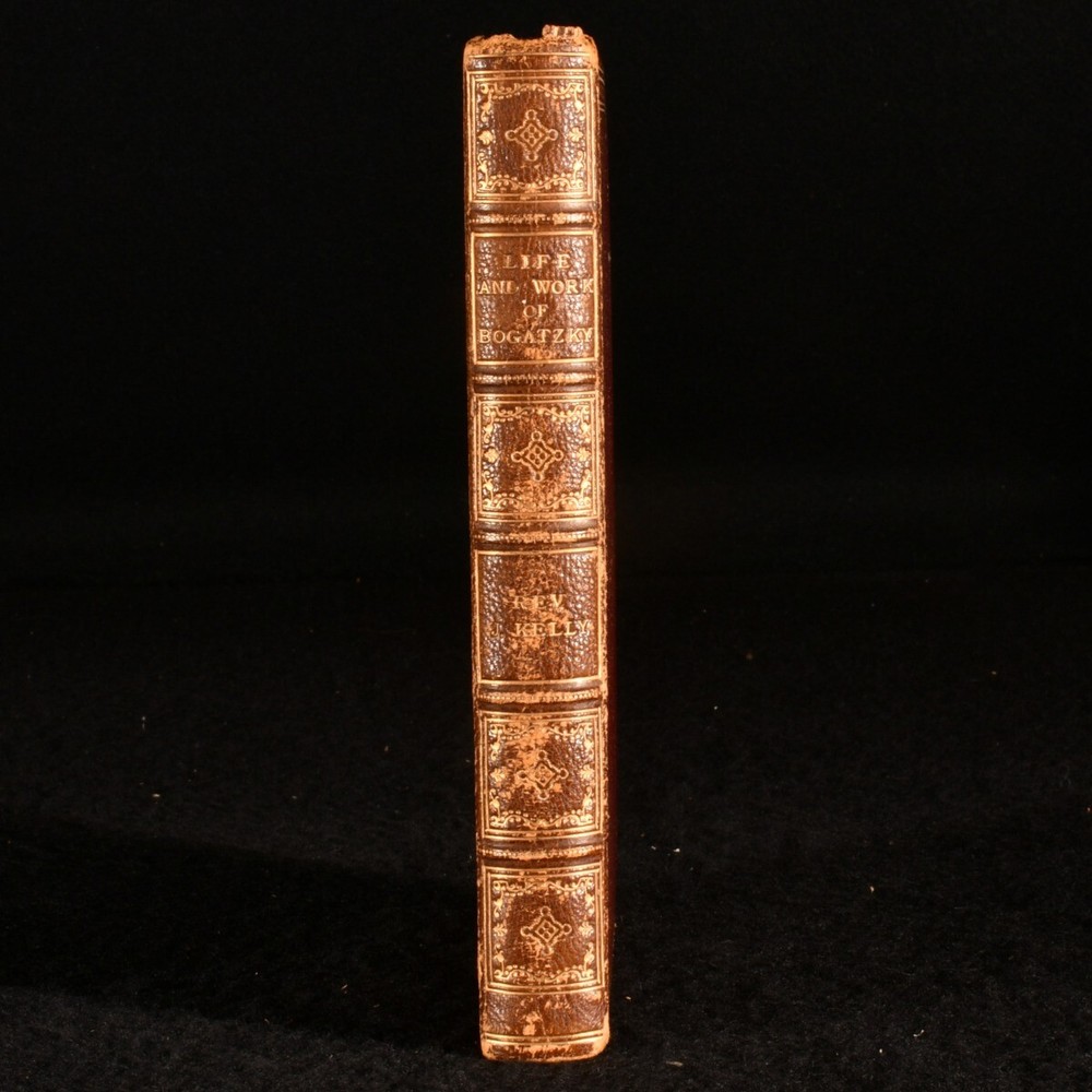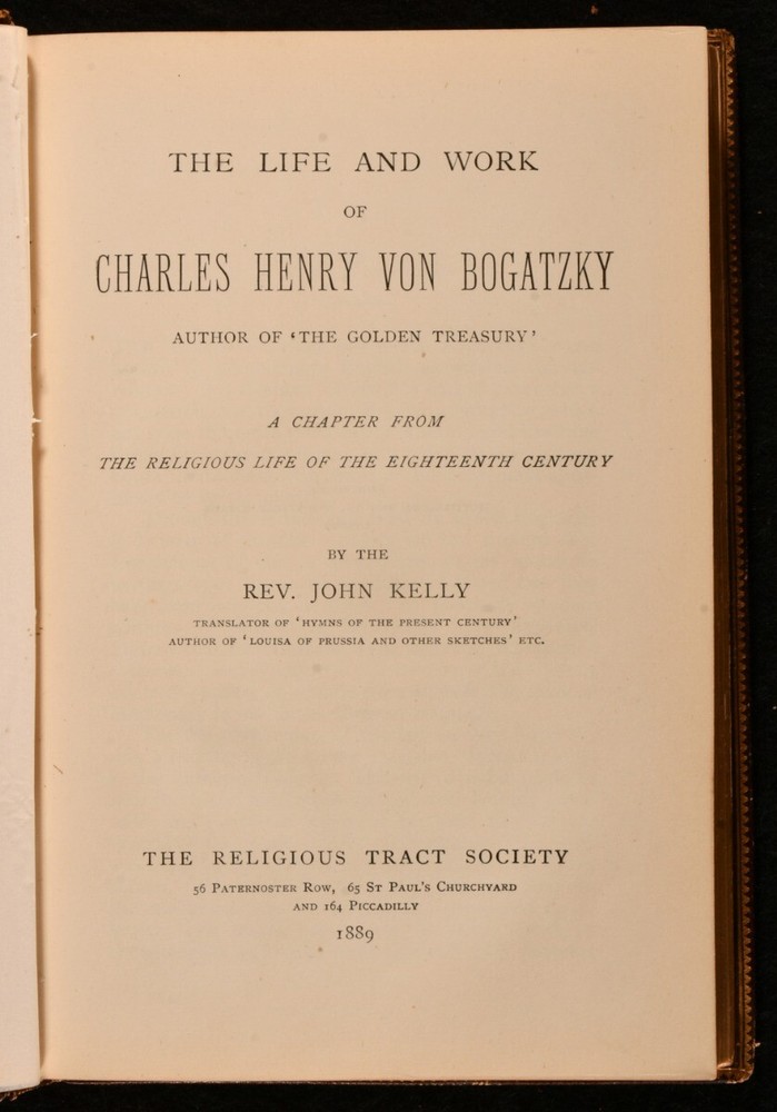 Click here to see our other books! The Life and Work of Charles Henry Von Bogatzky Rev. John Kelly 1889 The Religious Tract Society : London 7.5" by 5" [5] 272pp SUMMARY A scarce 19th century biographical sketch of Charles Henry Von Bogatzky and his work, 'The Golden Treasury', signed by the author and presented to his wife. Author's Presentation Copy,Illustrated,Leather Binding,Rebound,Scarce,Signed Overall Condition: Very Good This book weighs 0.5 KG when packed UK Postage: £ 3.99 US Postage: £ 15.99 EU Postage : £ 13.99 European Postage: £ 14.99 Asia Postage: £ 18.99 Worldwide Postage: £ 19.99 DESCRIPTION A fascinating biographical sketch of the life and career of Charles Henry Von Bogatzky, a leading figure in Germany of the Lutheran Church and a noted hymn composer. He is also the author of The Golden Treasury , a religious book for young people and children. Written by the Rev. John Kelly. A presentation copy signed by the author and given to his wife, with an ink inscription to her on one of the front free-endpapers: 'Elizabeth Ann Kelly, from her loving husband, The Author, October 1889'. Including an engraved frontispiece portrait of Bogatzky. Rebound in full leather binding with refreshed cloth endpapers. CONDITION Rebound in full leather binding with refreshed cloth endpapers. Externally, smart, with some rubbing to the head and tail of the spine, joints, and extremities. Internally, hinges lightly strained, though remaining binding is firm. A few spots to the first and last few pages, which are otherwise bright and clean. Overall Condition: Very Good GLOSSARY OF TERMS Overall Condition (Dustwrapper condition rating is shown after that for the book itself, where a dustwrapper is present) Fine - Very well preserved copy showing very little wear Very Good Indeed - Only one or two minor faults, really a very attractive copy Very Good - Quite a wide term meaning no major faults but probably several smaller ones often expected given the age of the book, but still a respectable copy Good - Meaning not very good. Some more serious faults as will be described in the condition report under 'condition' Good Only - Meaning one or more faults that could really do with repair Fair - As with good only above but with other faults leaving a compromised copy even after repair Poor - Really bad and possibly seriously incomplete. We only sell books in this condition where their rarity or value makes them attractive none the less. Major defects will be described. GUARANTEE We offer a full money back guarantee on our descriptions. Please ask for details and conditions. We prefer PAYPAL. If you pay via PAYPAL we will post the item off the same or the next working day with the postage you have selected. Please note we cannot accept USD cheques