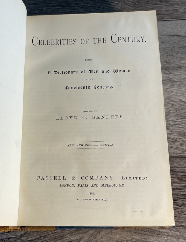 This is a rare and collectible book titled "Celebrities of the Century" by Lloyd C. Sanders. It features a collection of biographies and autobiographies of the most prominent men and women of the 19th century. The book was printed in 1890 by Cassell and is written in English. The binding is made of leather and the book is in its original language. The topic of the book is dictionaries and the subject is biography and autobiography. Beautiful gold trim is very 3/4 leather - nice condition