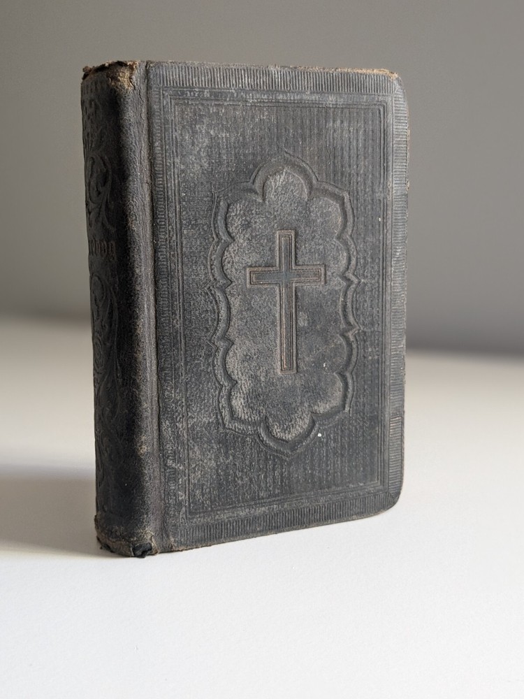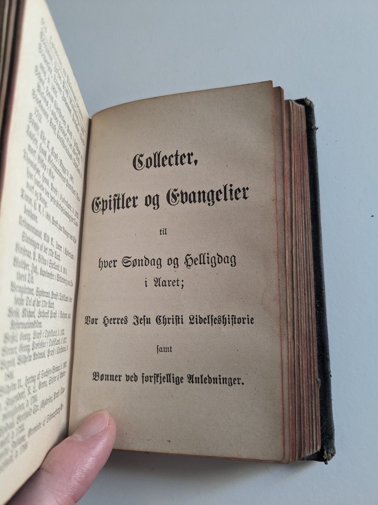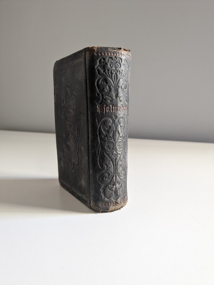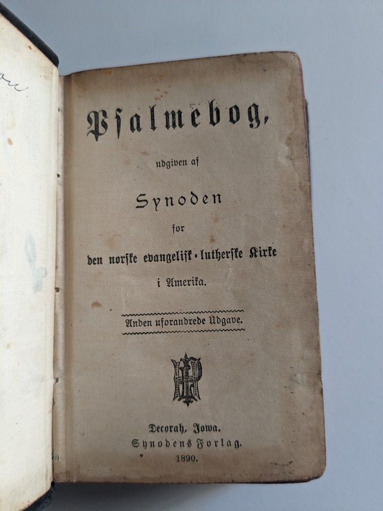 1890 Norwegian Lutheran Psalmebog (Psalm Book), bound together with Collections, Epistles, and Gospels for every Sunday and Public Holiday in the Year. Second Unchanged Edition Authored by The Synod of The Evangelical Lutheran Church in America and published by Synodens Forlag, Deborah Iowa Gilt & blind stamped full leather, edges stained red, 16mo, 5.25 x 3.5", pp. 574, 280 Good condition, generally rubbed with bumped corners, gilding faded, lacking original clasps