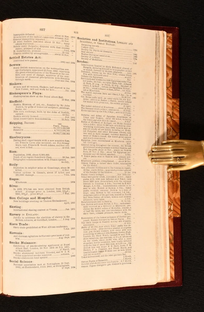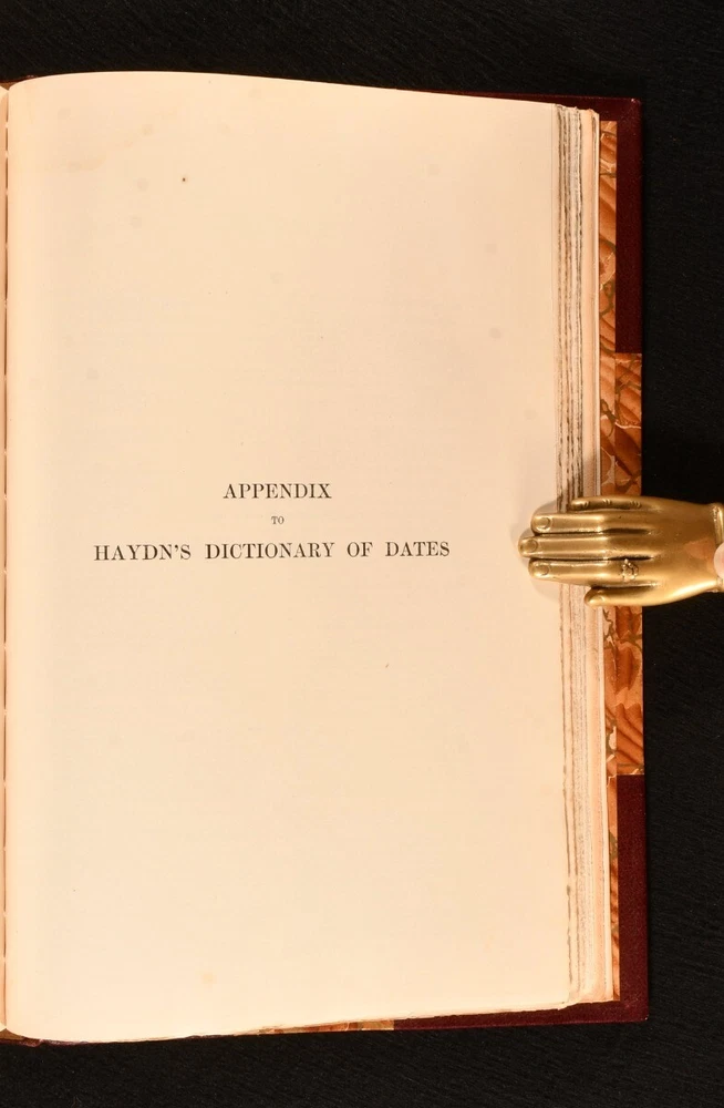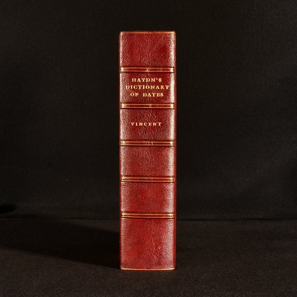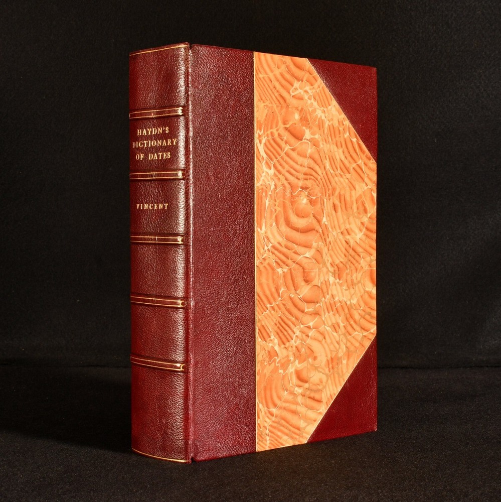 Click here to see our other books! Haydn's Dictionary of Dates and Universal Information Relating to All Ages and Nations, Containing a History of the World Benjamin Vincent 1891 Harper & Brothers : New York 10.5" by 7" xiv, 847pp. SUMMARY The 18th edition of Hadyn's dictionary of dates, revised and enlarged for American readers, rebound in a handsome leather binding. Leather Binding,Rebound Overall Condition: Very Good Indeed This book weighs 2 KG when packed UK Postage: £ 3.99 US Postage: £ 29.99 EU Postage : £ 21.99 European Postage: £ 23.99 Asia Postage: £ 37.99 Worldwide Postage: £ 38.99 DESCRIPTION The eighteenth edition of this work, revised and enlarged for American readers, rebound in a half morocco binding with marbled boards and end papers. A comprehensive dictionary of world history, arranged in alphabetical order, with a copious appendix to the rear. Included are tables of contemporary European sovereigns. With its detailed entries on people, places, events, and innovations, this work is a sweeping historical reference work compiled by Benjamin Vincent. CONDITION Rebound in a half morocco binding. Externally, in excellent condition. Internally, firmly bound. Pages are generally bright and clean, with a tidemark to the fore edge, affecting the occasional page. Some pest damage to the bottom of the last pages, not affecting the text. Overall Condition: Very Good Indeed GLOSSARY OF TERMS Overall Condition (Dustwrapper condition rating is shown after that for the book itself, where a dustwrapper is present) Fine - Very well preserved copy showing very little wear Very Good Indeed - Only one or two minor faults, really a very attractive copy Very Good - Quite a wide term meaning no major faults but probably several smaller ones often expected given the age of the book, but still a respectable copy Good - Meaning not very good. Some more serious faults as will be described in the condition report under 'condition' Good Only - Meaning one or more faults that could really do with repair Fair - As with good only above but with other faults leaving a compromised copy even after repair Poor - Really bad and possibly seriously incomplete. We only sell books in this condition where their rarity or value makes them attractive none the less. Major defects will be described. GUARANTEE We offer a full money back guarantee on our descriptions. Please ask for details and conditions. We prefer PAYPAL. If you pay via PAYPAL we will post the item off the same or the next working day with the postage you have selected. Please note we cannot accept USD cheques