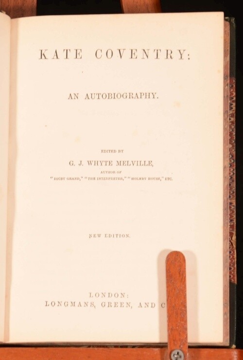 Click here to see our other books! Kate Coventry An Autobiography Kate Coventry, Henry Whyte Melville (Ed) 1891 Longmans, Green and Co : London 7" by 5" 316pp SUMMARY A copy of 'Kate Coventry; An Autobiography' edited by George John Whyte-Melville (1821–1878) was a Scottish novelist of the sporting-field and a poet. Leather Binding Overall Condition: Very Good Indeed This book weighs 0.5 KG when packed UK Postage: £ 3.99 US Postage: £ 15.99 EU Postage : £ 13.99 European Postage: £ 14.99 Asia Postage: £ 18.99 Worldwide Postage: £ 19.99 DESCRIPTION A New Edition. CONDITION In a half morocco binding with marbled boards. Externally, very smart with some shelfwear only. Internally, firmly bound and bright with spots scattered to the first and last pages. Overall Condition: Very Good Indeed GLOSSARY OF TERMS Overall Condition (Dustwrapper condition rating is shown after that for the book itself, where a dustwrapper is present) Fine - Very well preserved copy showing very little wear Very Good Indeed - Only one or two minor faults, really a very attractive copy Very Good - Quite a wide term meaning no major faults but probably several smaller ones often expected given the age of the book, but still a respectable copy Good - Meaning not very good. Some more serious faults as will be described in the condition report under 'condition' Good Only - Meaning one or more faults that could really do with repair Fair - As with good only above but with other faults leaving a compromised copy even after repair Poor - Really bad and possibly seriously incomplete. We only sell books in this condition where their rarity or value makes them attractive none the less. Major defects will be described. GUARANTEE We offer a full money back guarantee on our descriptions. Please ask for details and conditions. We prefer PAYPAL. If you pay via PAYPAL we will post the item off the same or the next working day with the postage you have selected. Please note we cannot accept USD cheques