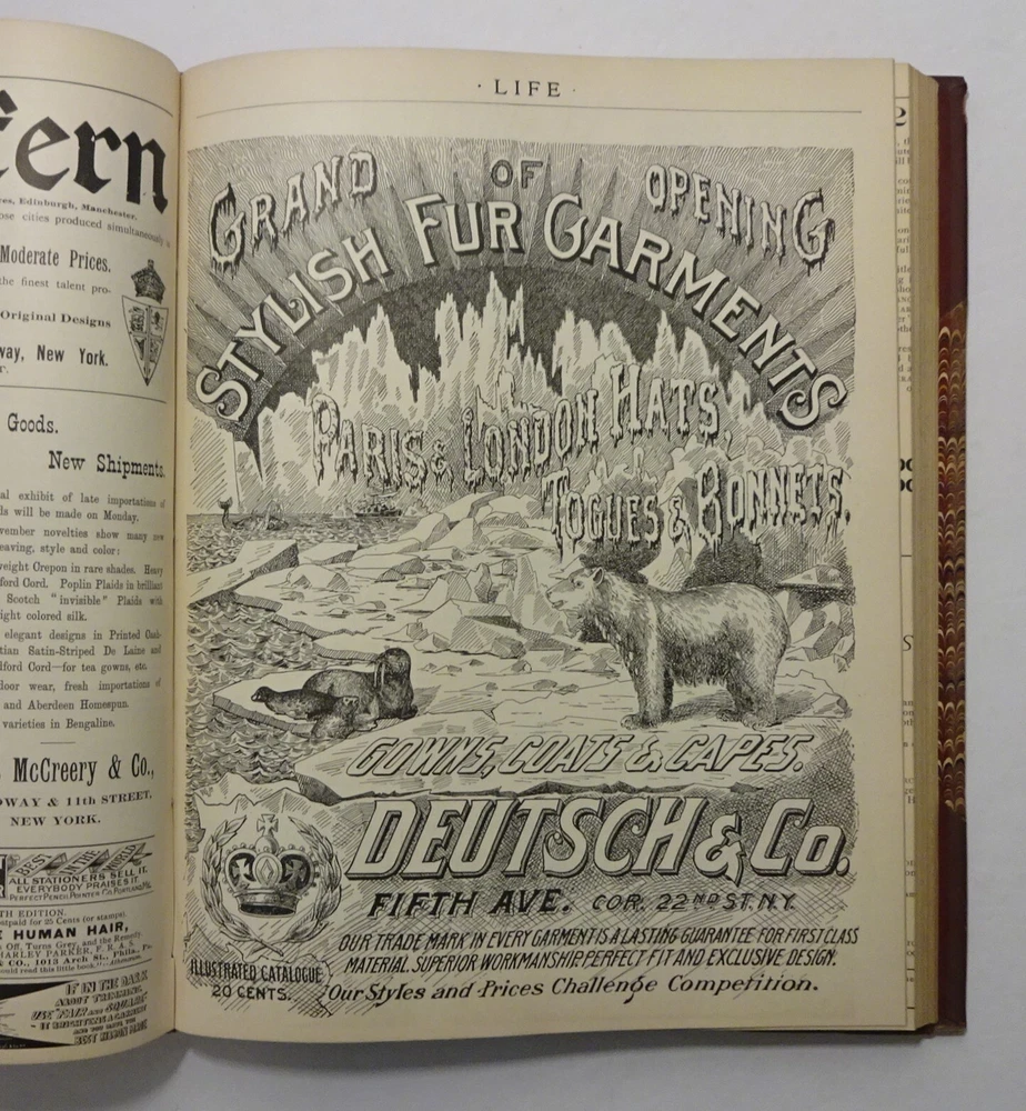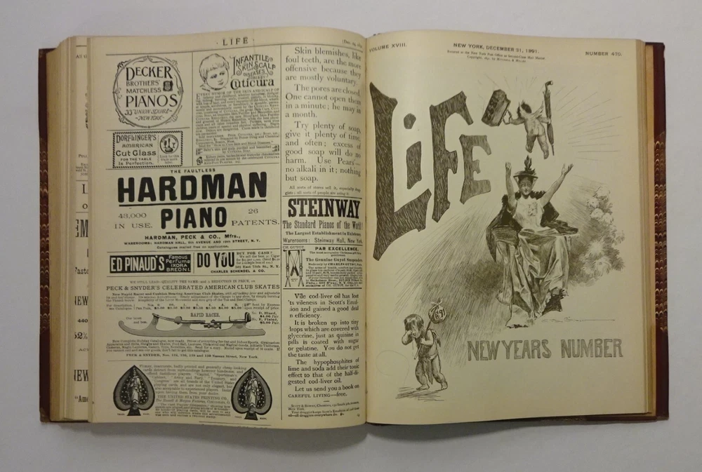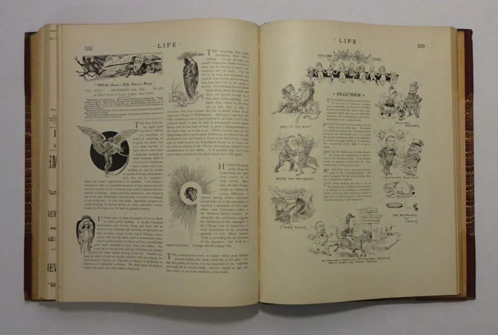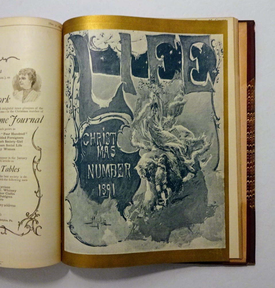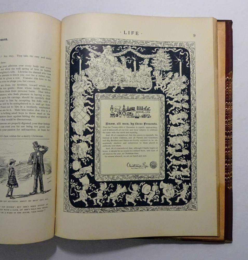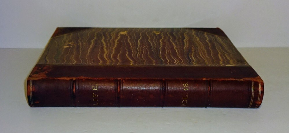 This is a bound volume of 27 issues of the publication "LIFE" magazine ranging in date from July 9, 1891 to December 31, 1891, plus a special "Christmas Number" at the back (which includes illustrations of Santa Claus). The November 19 issue and the "Christmas Number" each have color front covers. The issues are loaded with amazing illustrated advertisements. The New Year's and Christmas issues each contain a wonderful two-page illustration. The issues include works of fiction, non-fiction and poetry, most of which are illustrated. All issues come with their original front covers. Nicely bound in three-quarter leather with marbled covers, and four raised bands and gilt lettering on the spine. The following 27 issues are included: JULY: 9, 16, 23, 30. AUGUST: 6, 13, 20, 27. SEPTEMBER: 3, 10, 17, 24. OCTOBER: 1, 8, 15, 22, 29. NOVEMBER: 5, 12, 19, 26 DECEMBER: 3, 10, 17, 24, 31. Christmas Number.