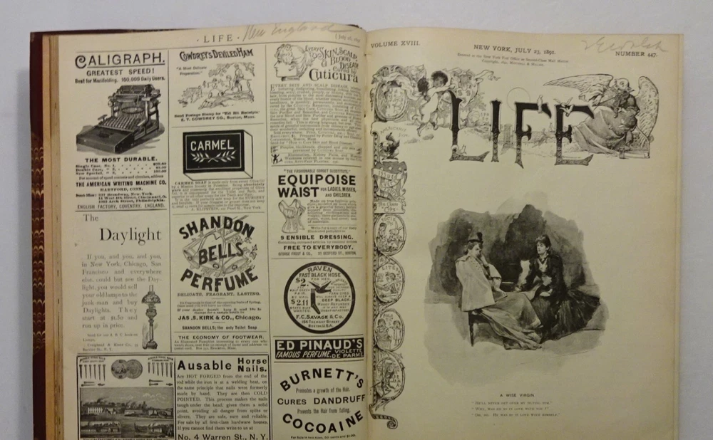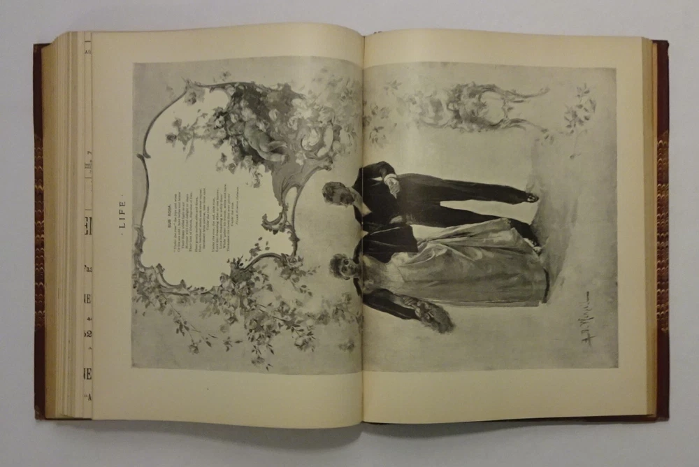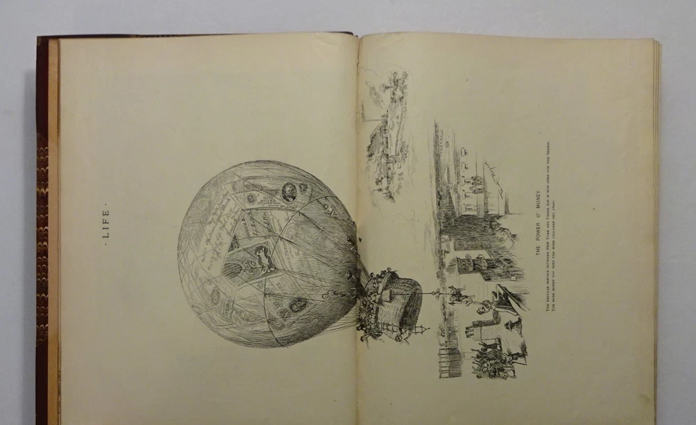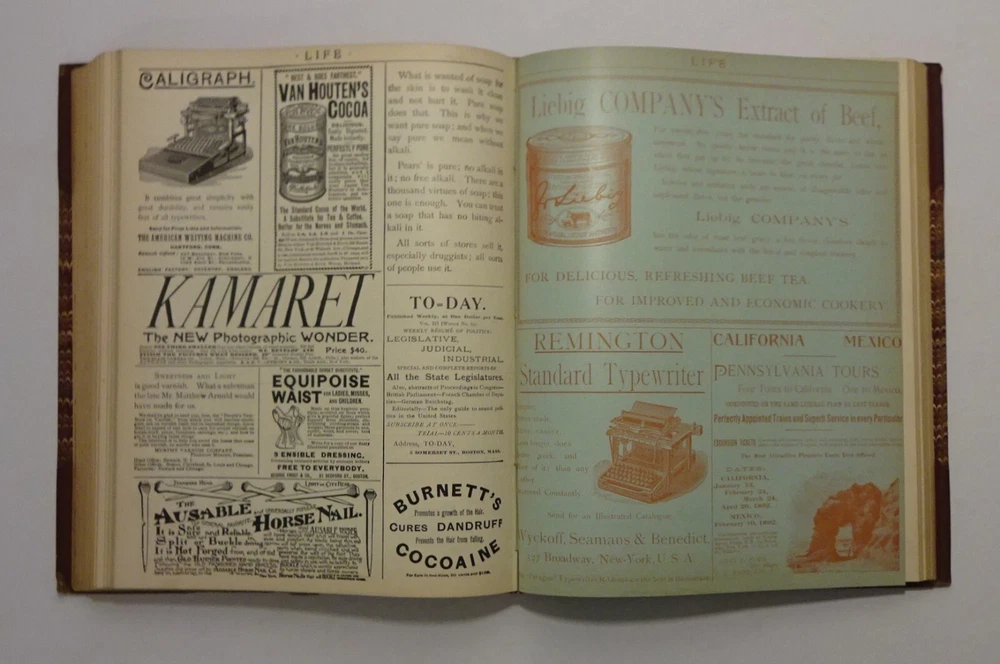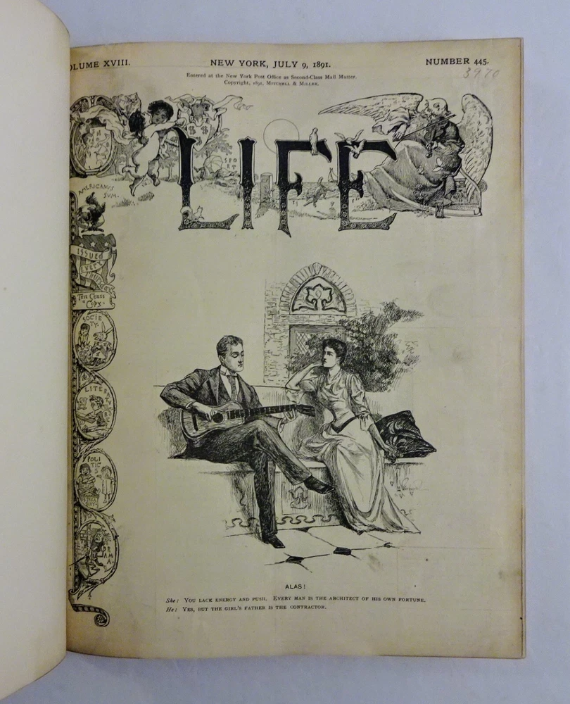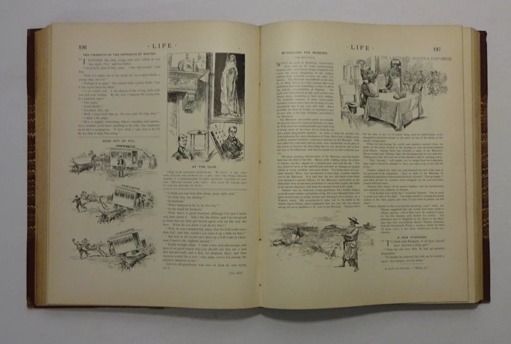 This is a bound volume of 27 issues of the publication "LIFE" magazine ranging in date from July 9, 1891 to December 31, 1891, plus a special "Christmas Number" at the back (which includes illustrations of Santa Claus). The November 19 issue and the "Christmas Number" each have color front covers. The issues are loaded with amazing illustrated advertisements. The New Year's and Christmas issues each contain a wonderful two-page illustration. The issues include works of fiction, non-fiction and poetry, most of which are illustrated. All issues come with their original front covers. Nicely bound in three-quarter leather with marbled covers, and four raised bands and gilt lettering on the spine. The following 27 issues are included: JULY: 9, 16, 23, 30. AUGUST: 6, 13, 20, 27. SEPTEMBER: 3, 10, 17, 24. OCTOBER: 1, 8, 15, 22, 29. NOVEMBER: 5, 12, 19, 26 DECEMBER: 3, 10, 17, 24, 31. Christmas Number.